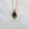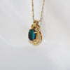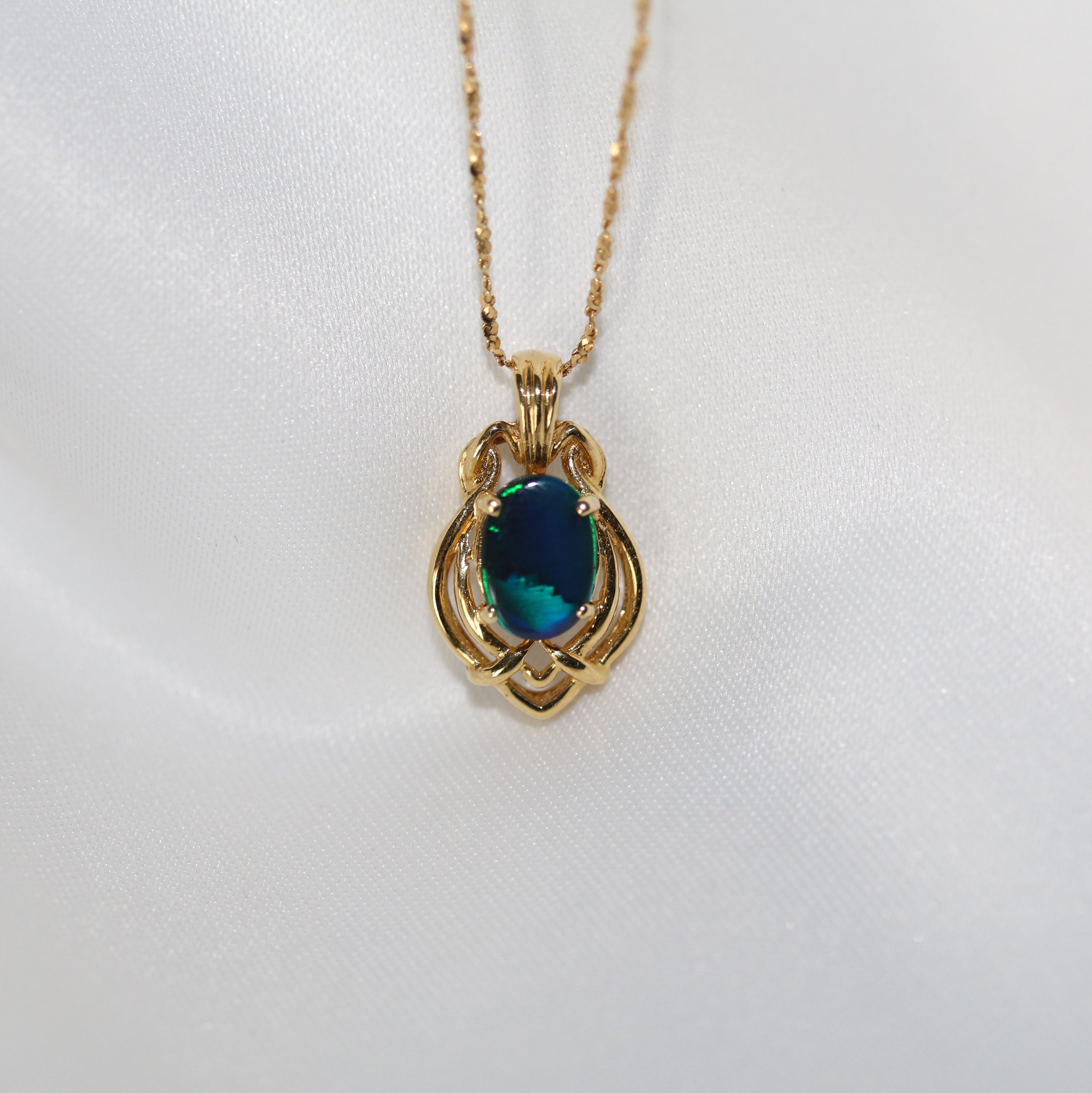 This captivating oval opal doublet pendant shines brilliantly, beautifully framed in a detailed 18ct Yellow Gold setting.