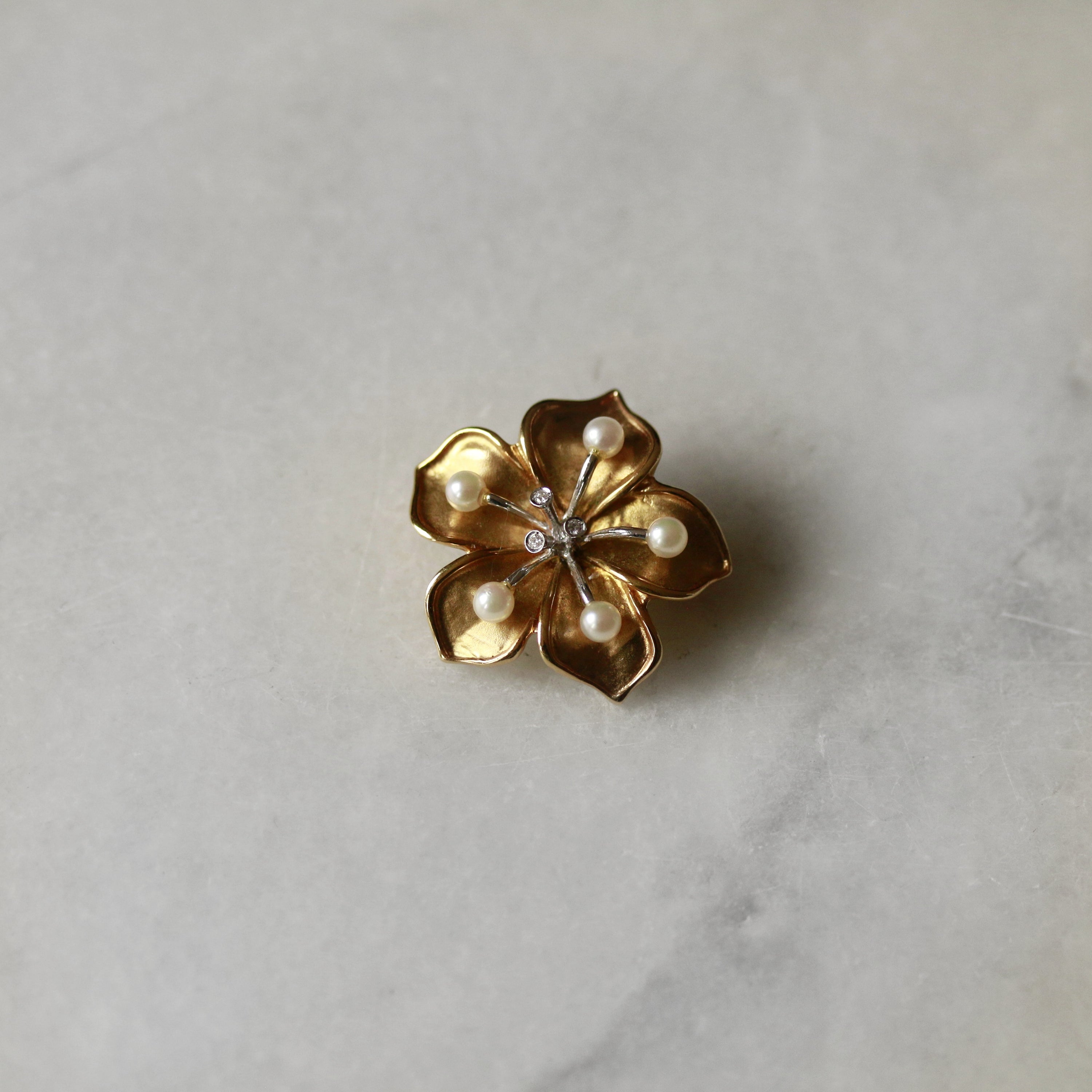 This exquisite brooch combines 18ct yellow gold with diamonds and a lustrous pearl, arranged in a delicate floral composition. The matte-finished petals provide subtle contrast against the polished gold and gemstones, creating a refined aesthetic with dimensional appeal. A versatile accessory that elevates both formal and everyday styling, offering timeless elegance through its carefully balanced design and premium materials.