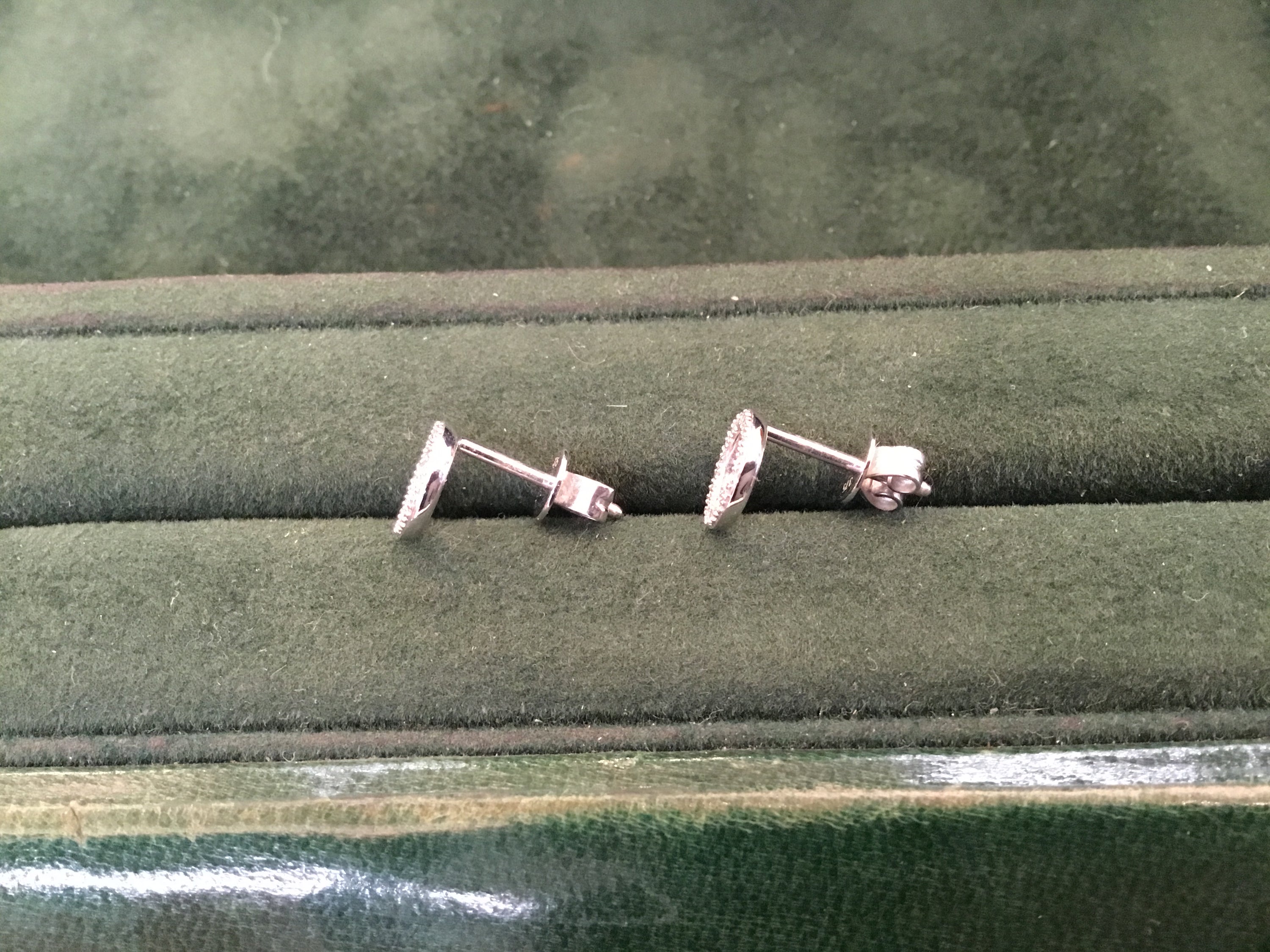 A pair of 9ct white gold Diamond stud earrings with a circular design and post and scroll fitting.