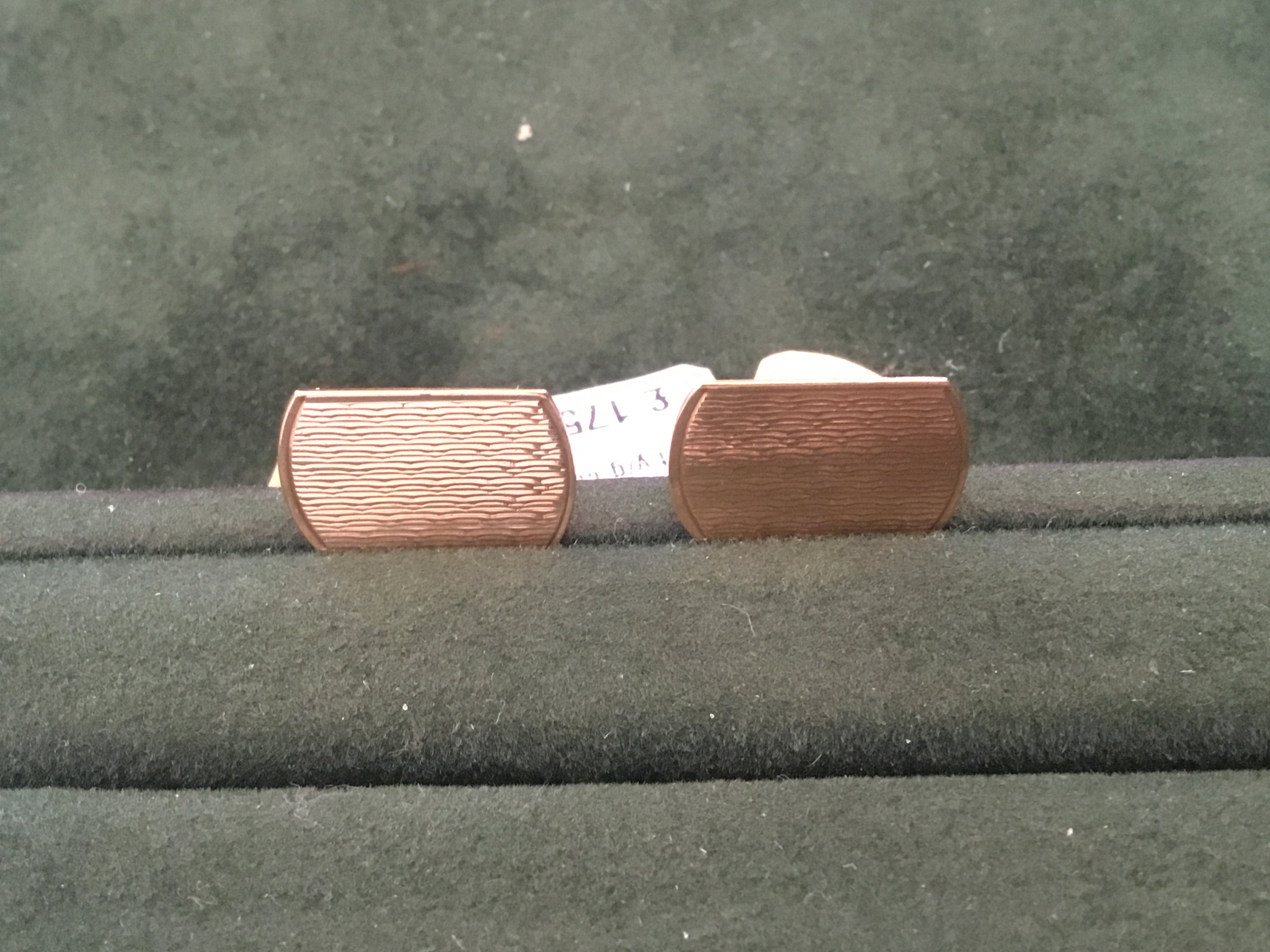 A pair of 9ct yellow gold rounded rectangle shaped Cufflinks with a textured finish and a chain link fitting.