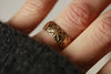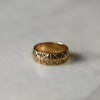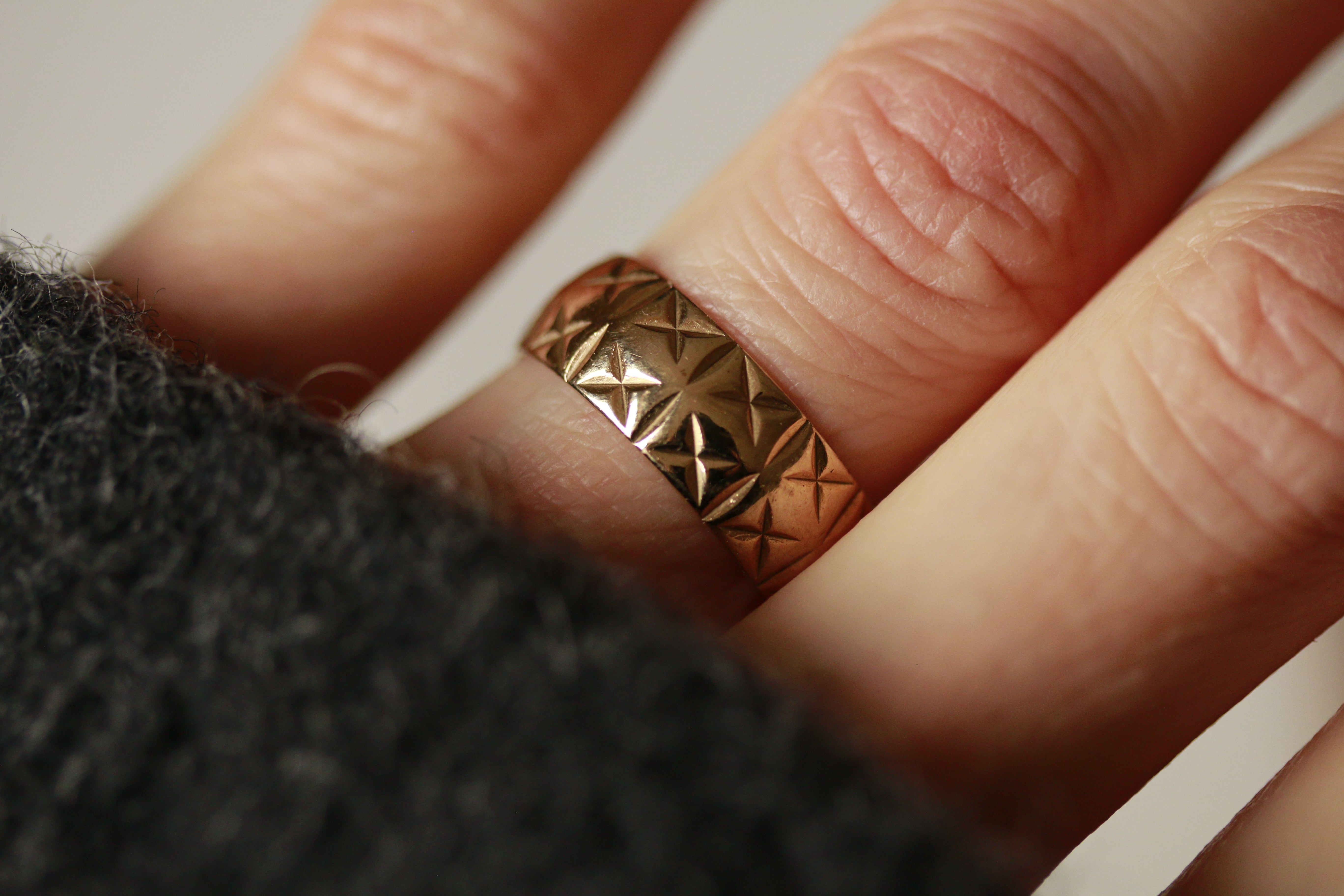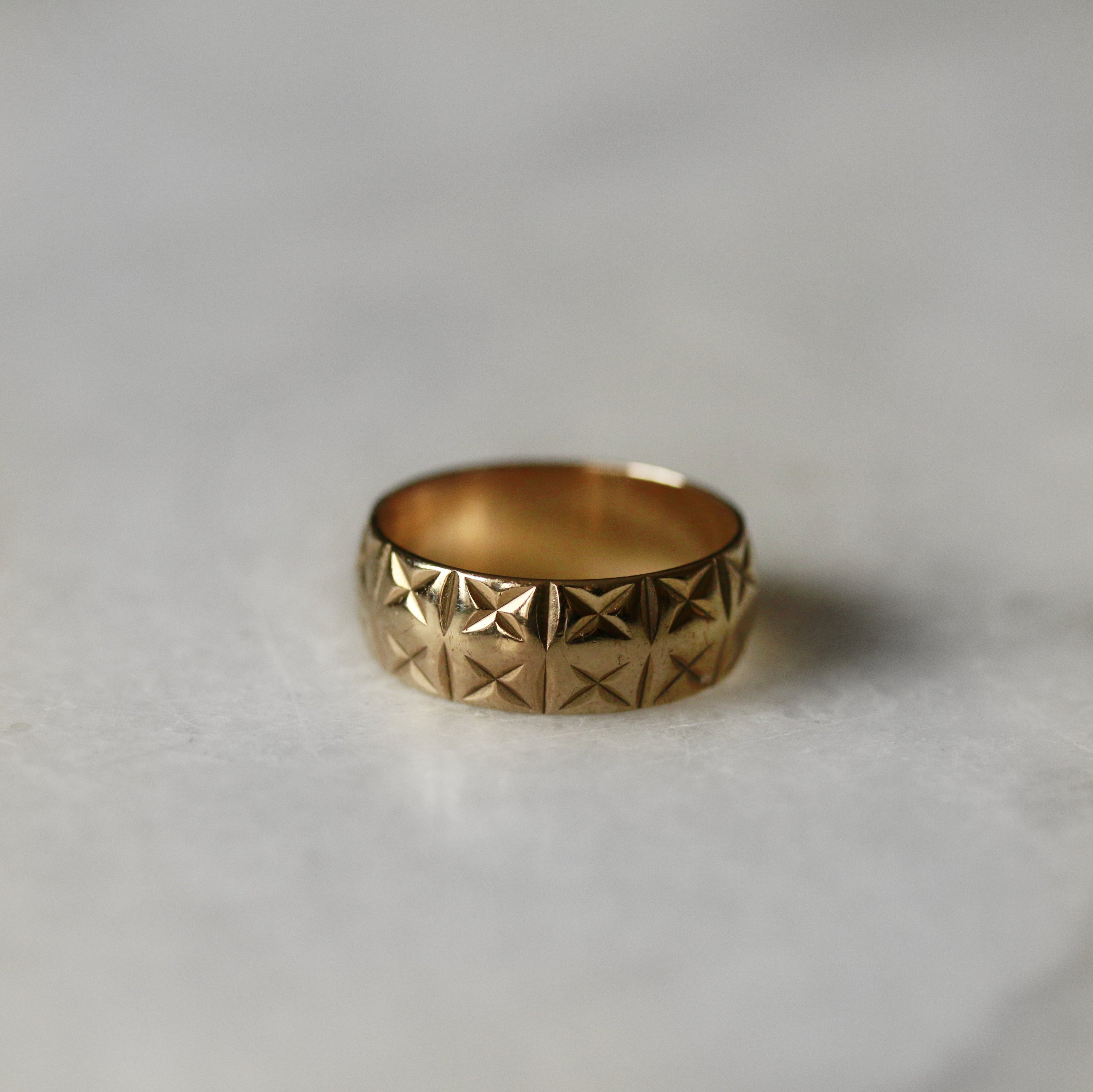 This refined 9ct yellow gold band showcases an intricate engraved pattern of crossed sections arranged in a double row. The detailed surface work adds visual interest and texture whilst maintaining the understated elegance characteristic of fine jewellery. A versatile piece that complements both standalone wear and stacking, offering subtle sophistication through its carefully crafted design.