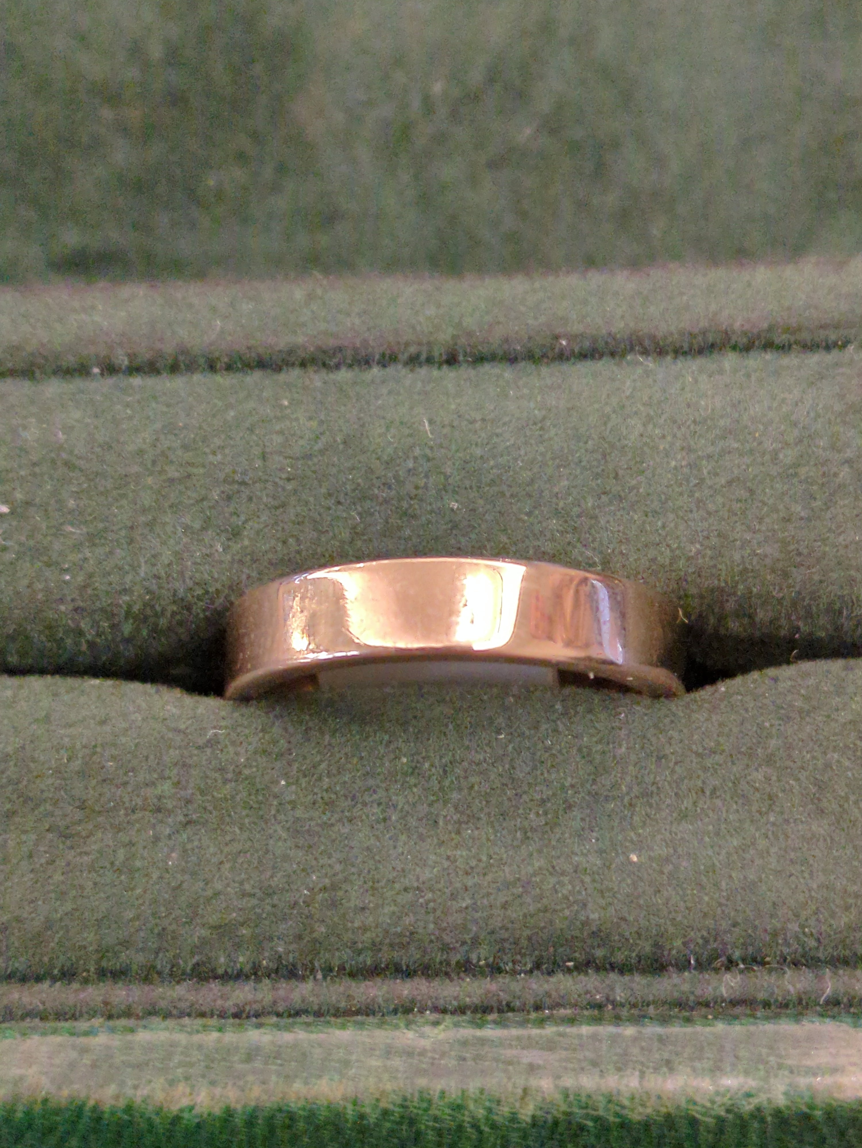 A 9ct rose gold flat shaped wedding band of 4mm in width. Weight approximately 3.6g