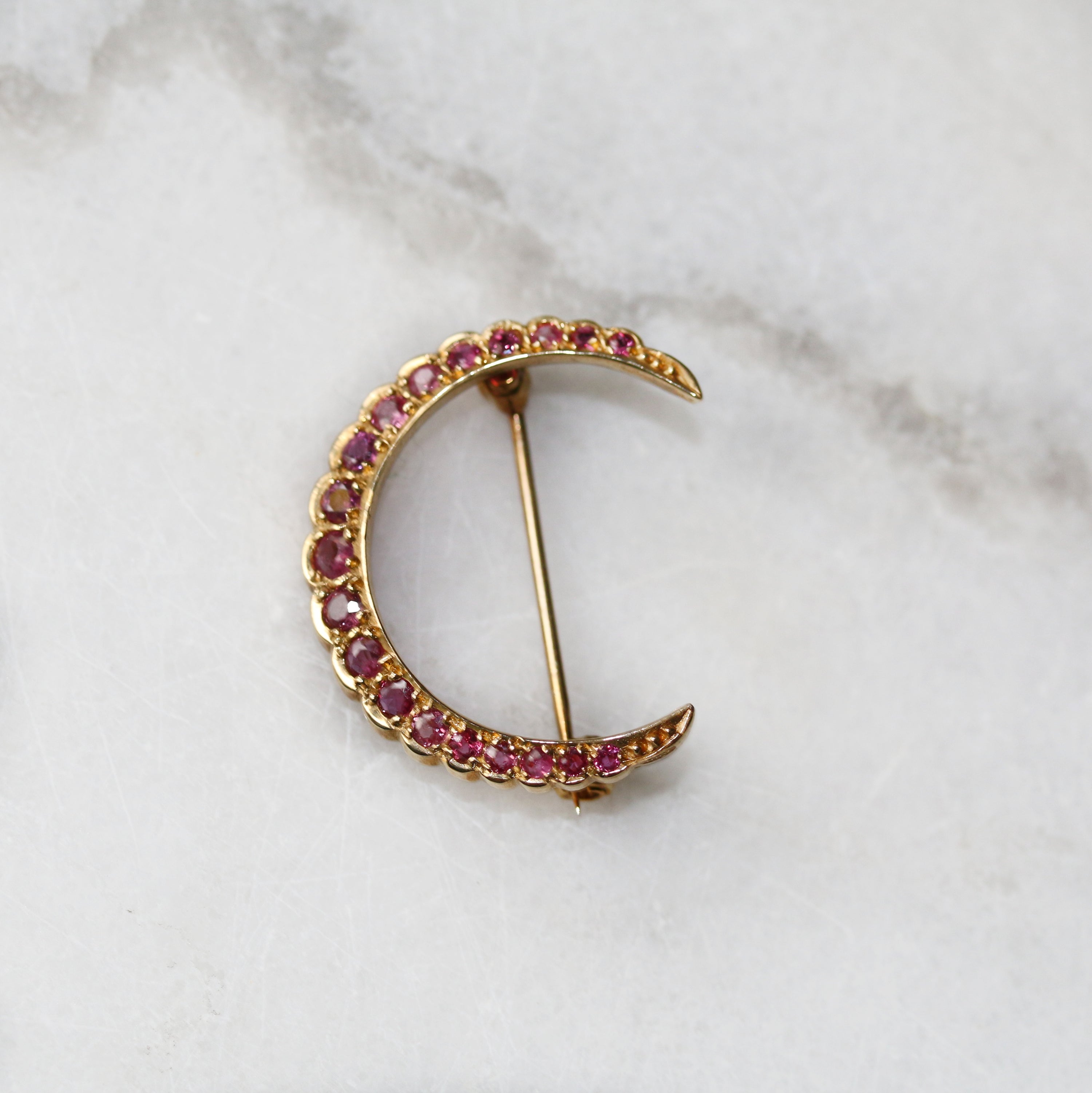 Crafted from 9ct yellow gold, this crescent moon brooch is beautifully encrusted with sparkling rubies, offering a captivating piece to elevate your style.