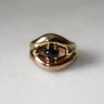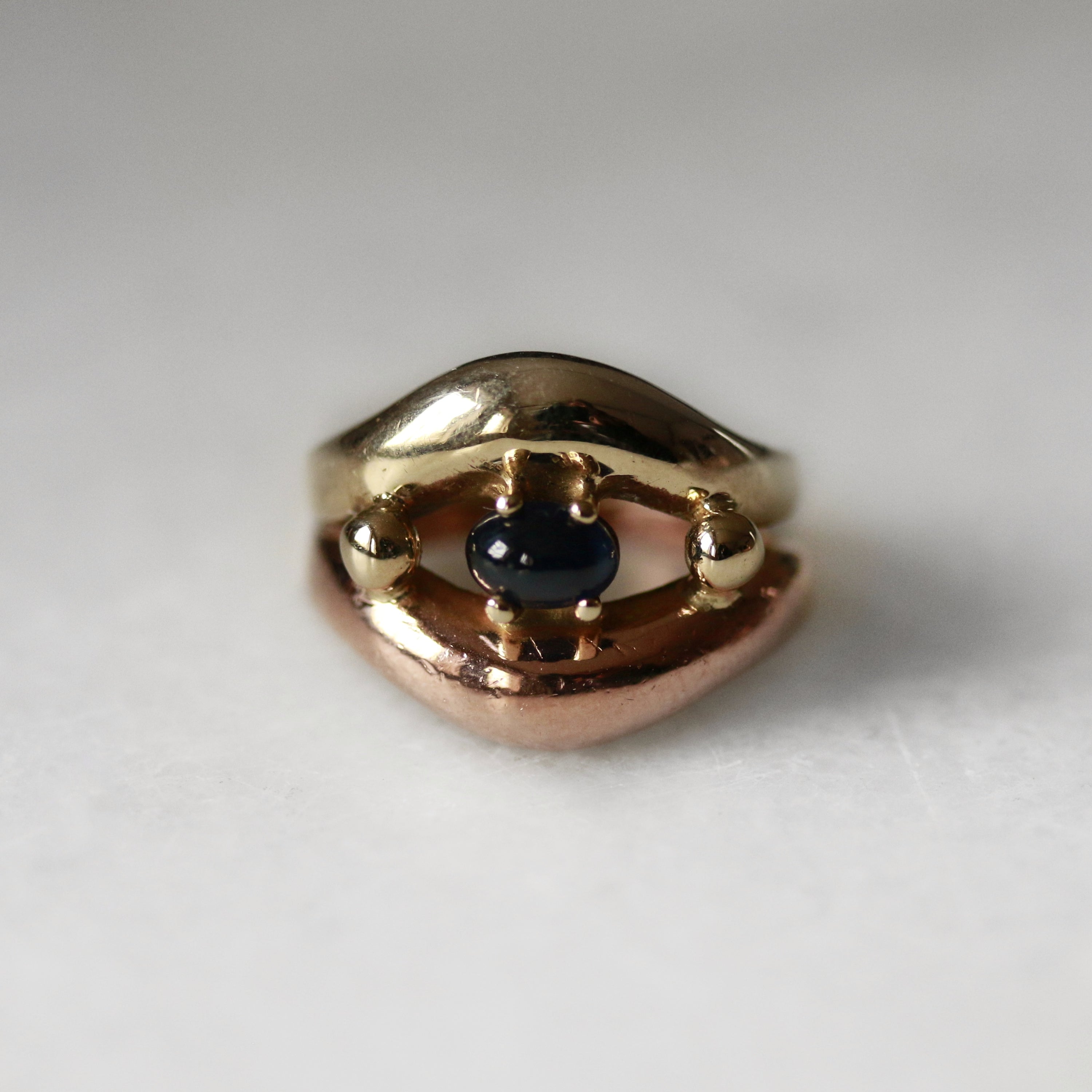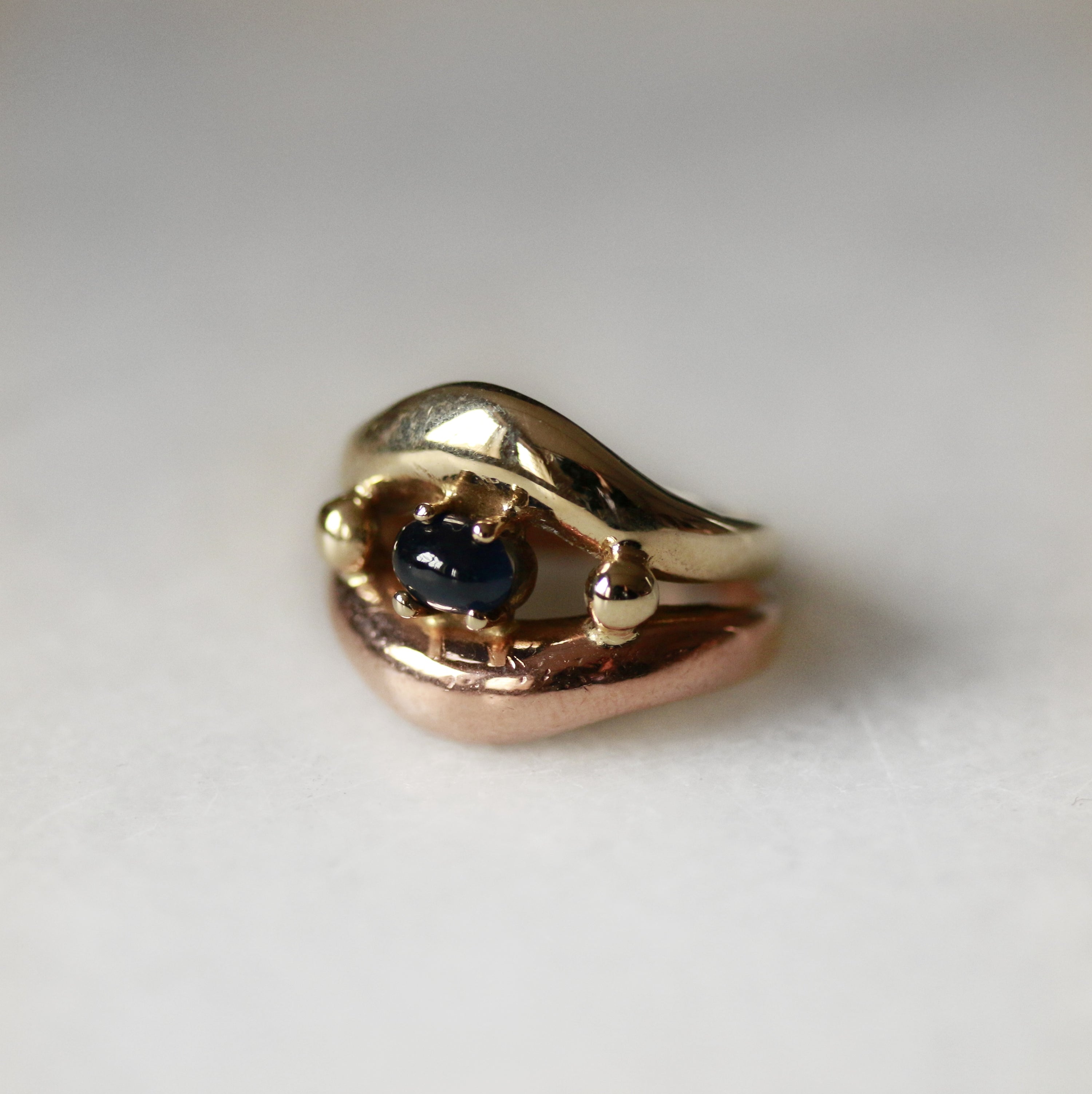 This distinctive dress ring merges contemporary design with traditional craftsmanship. A smooth cabochon-cut sapphire is nestled between contrasting rose and yellow gold bands in 9ct, whilst delicate gold beading adds textural refinement. The two-tone composition creates visual depth and versatility, allowing the piece to coordinate effortlessly with both warm and cool-toned jewellery.