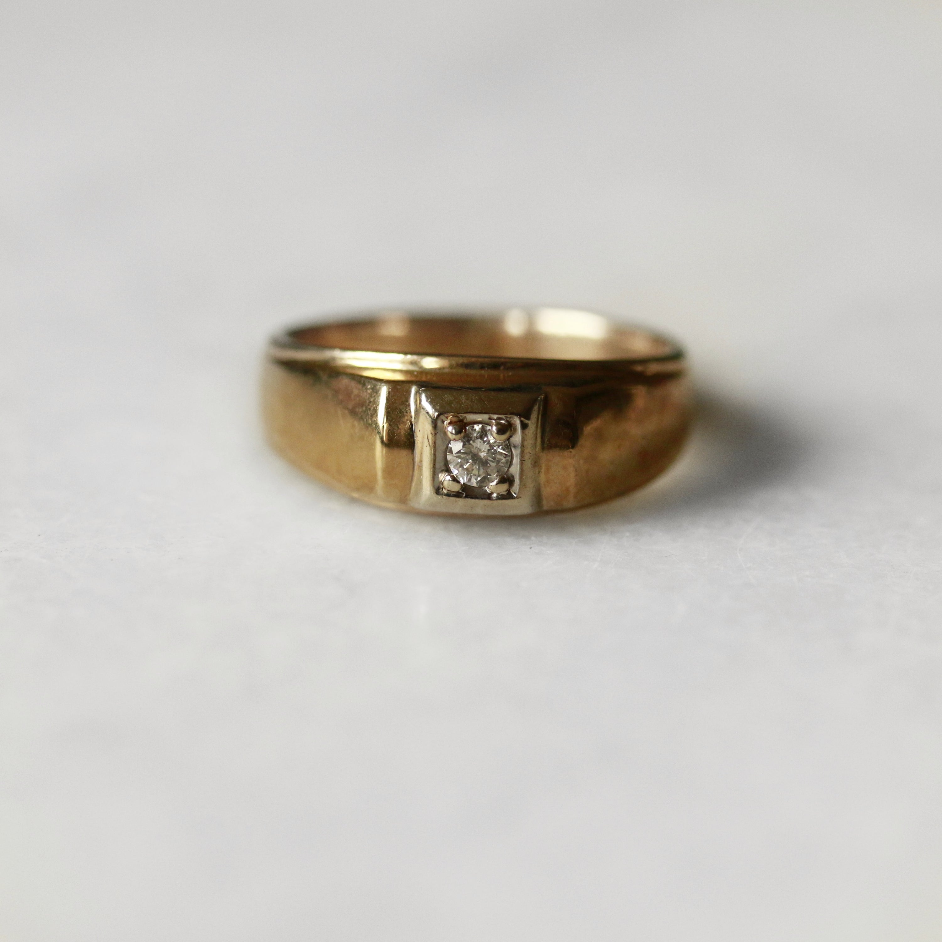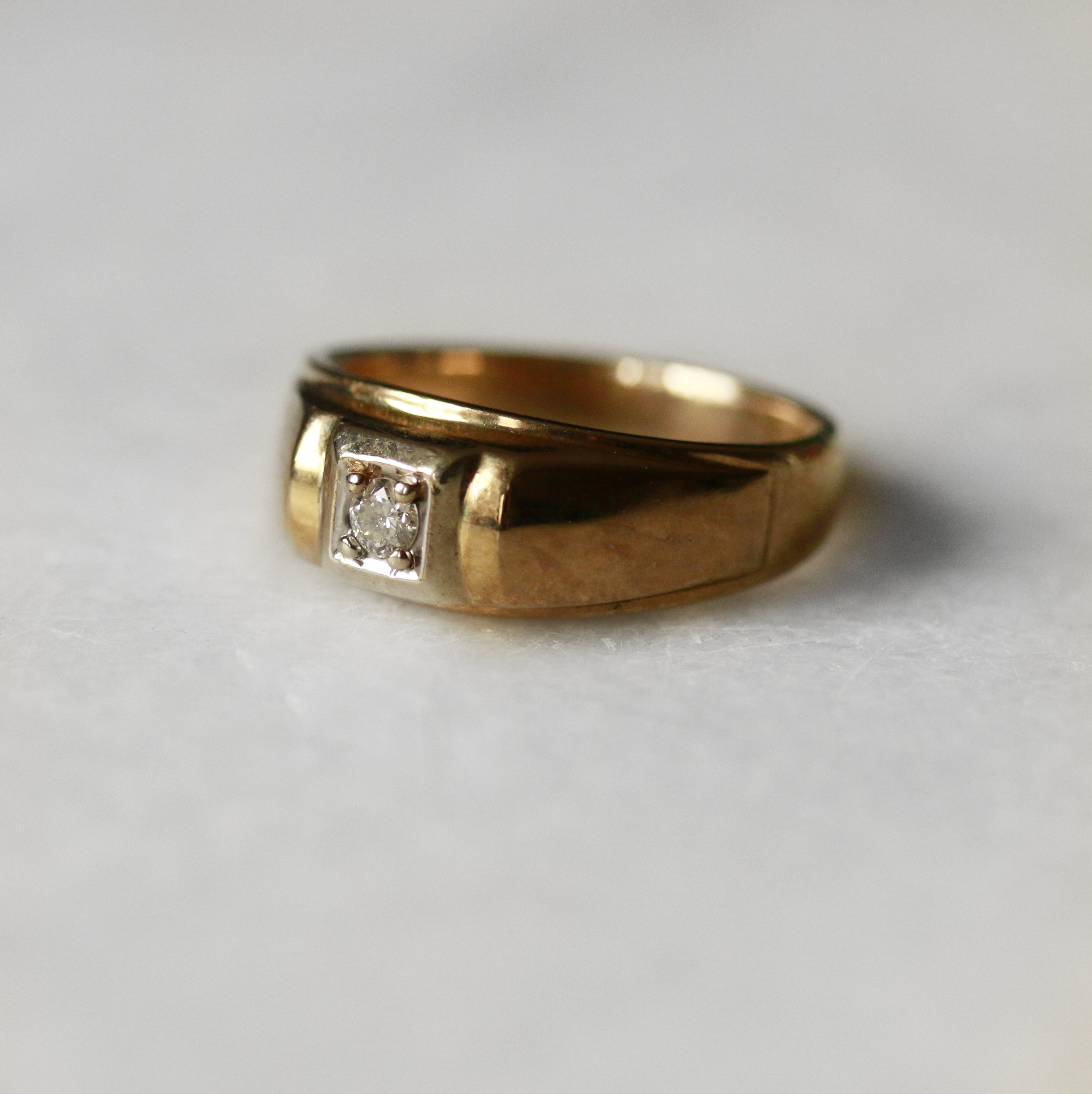 A sophisticated gentleman's ring crafted in 9ct yellow and white gold, featuring a striking two-tone design that balances warmth and contemporary elegance. The diamond setting adds refined sparkle and enduring appeal, making this piece equally suited to everyday wear or special occasions. A timeless investment in quality craftsmanship.
