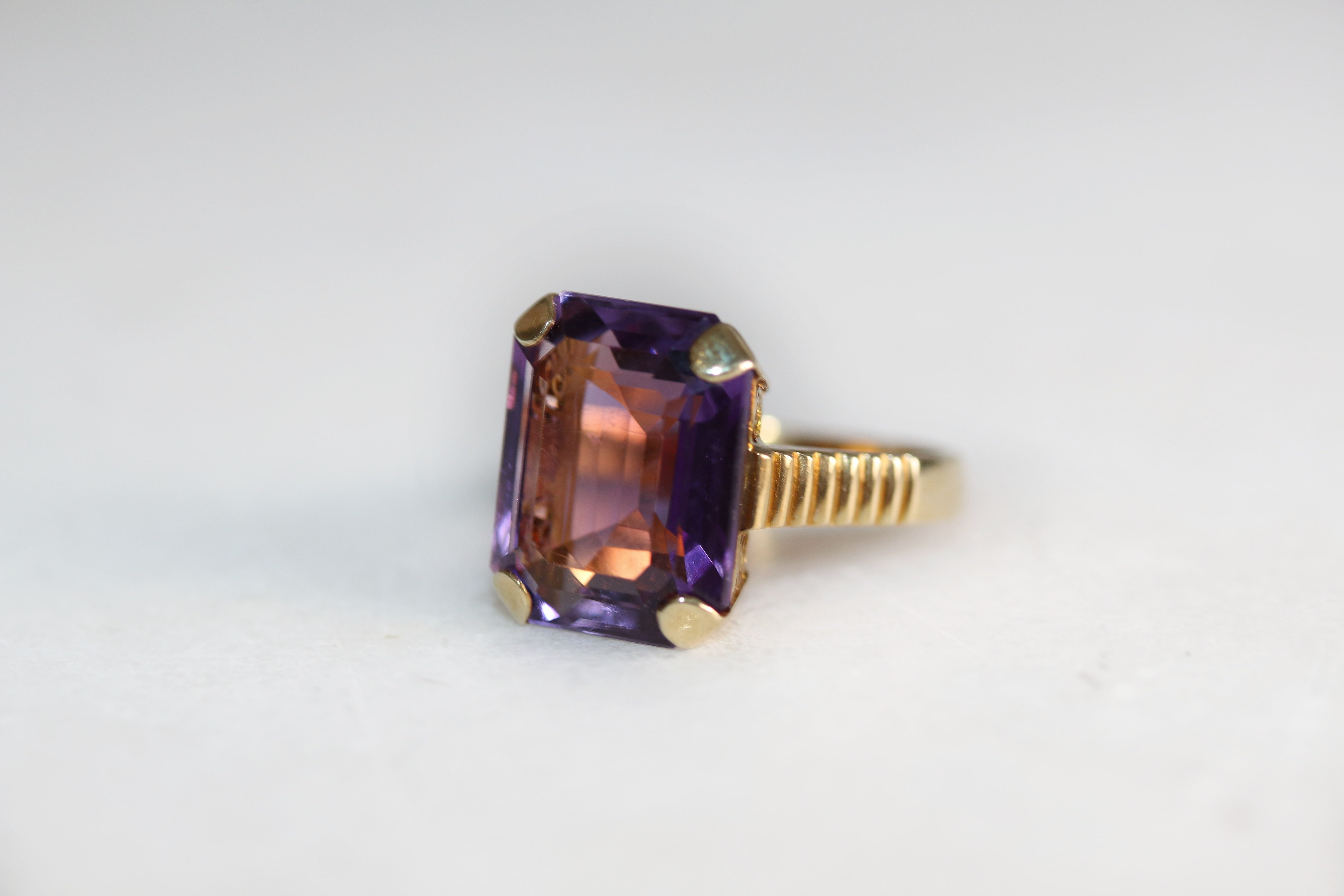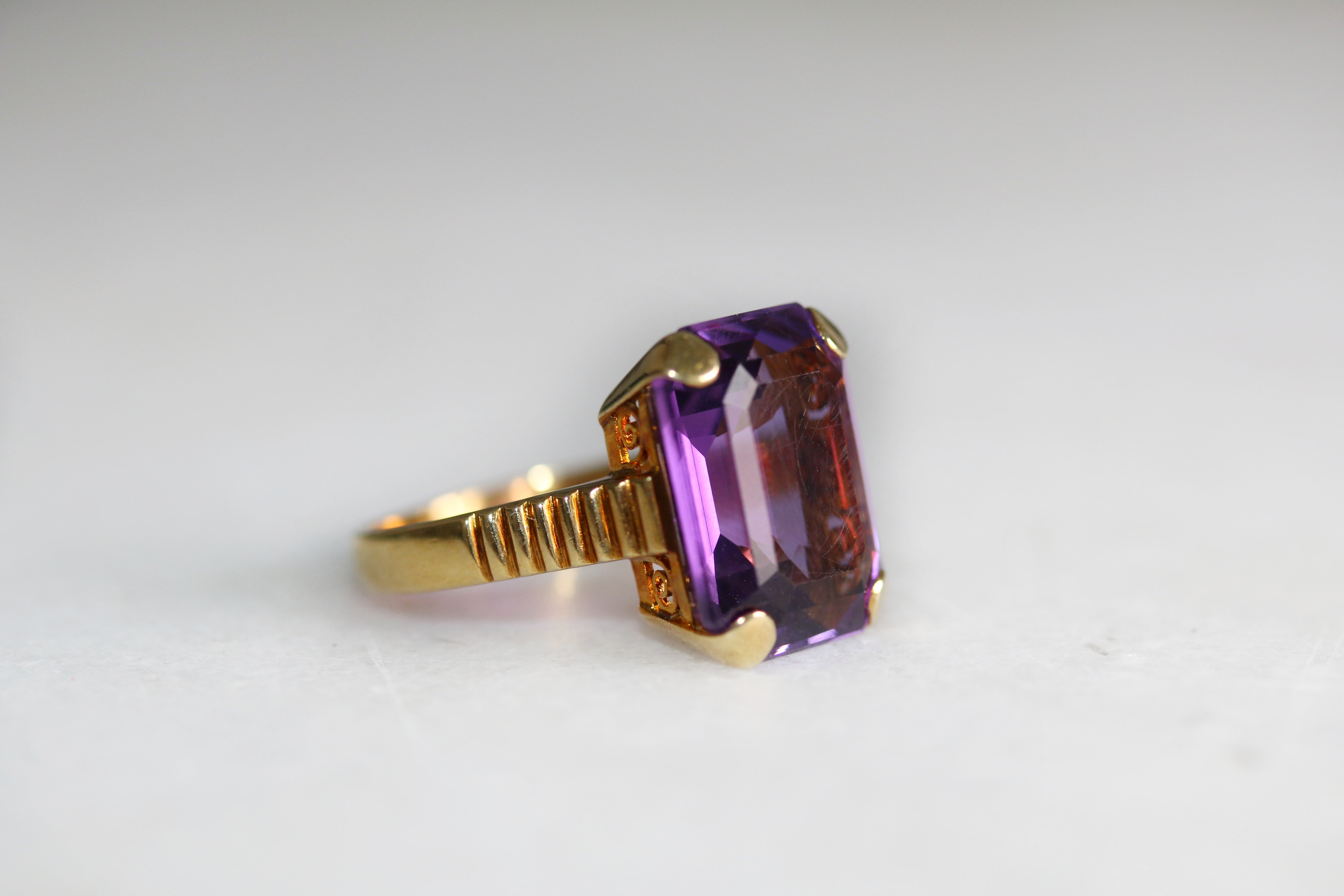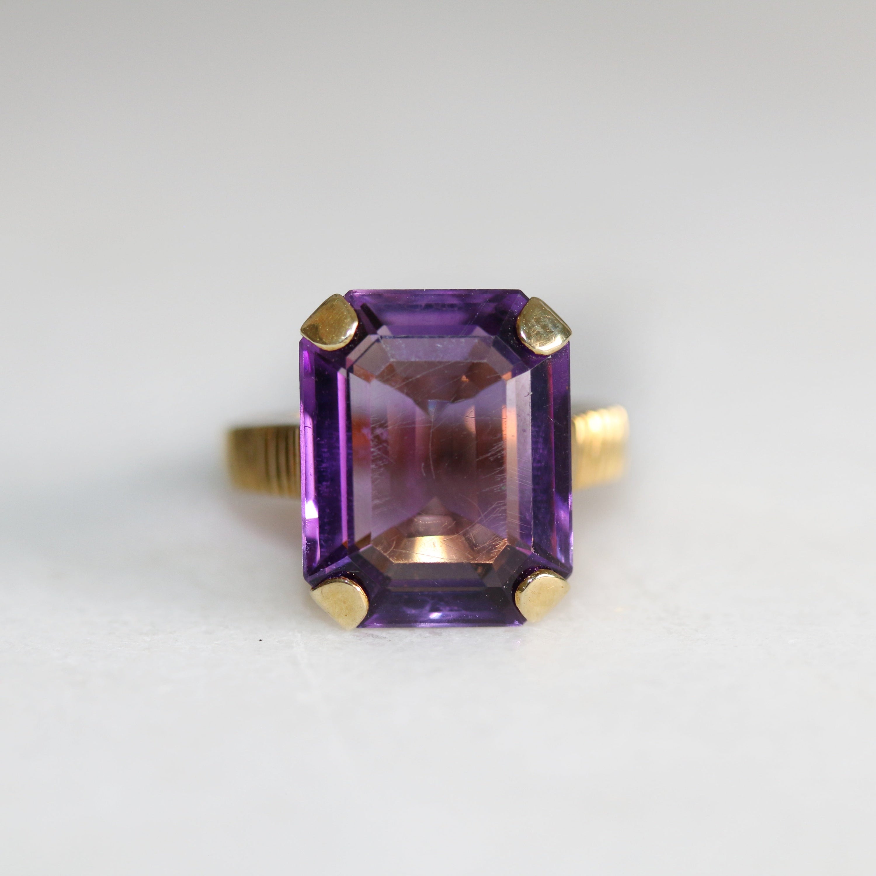 This 9ct yellow gold solitaire ring features a striking amethyst centrepiece, complemented by ribbed shoulder accents and an elegant scroll setting.