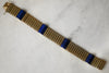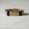 This distinctive bracelet showcases the rich, celestial beauty of lapis lazuli set against 15ct yellow gold. Raised sections of the semi-precious stone punctuate a watch link-style band, creating visual rhythm and textural contrast. The combination of warm gold and deep blue stone delivers sophisticated colour play, whilst the secure construction ensures reliable everyday wear. A statement piece with genuine character.