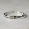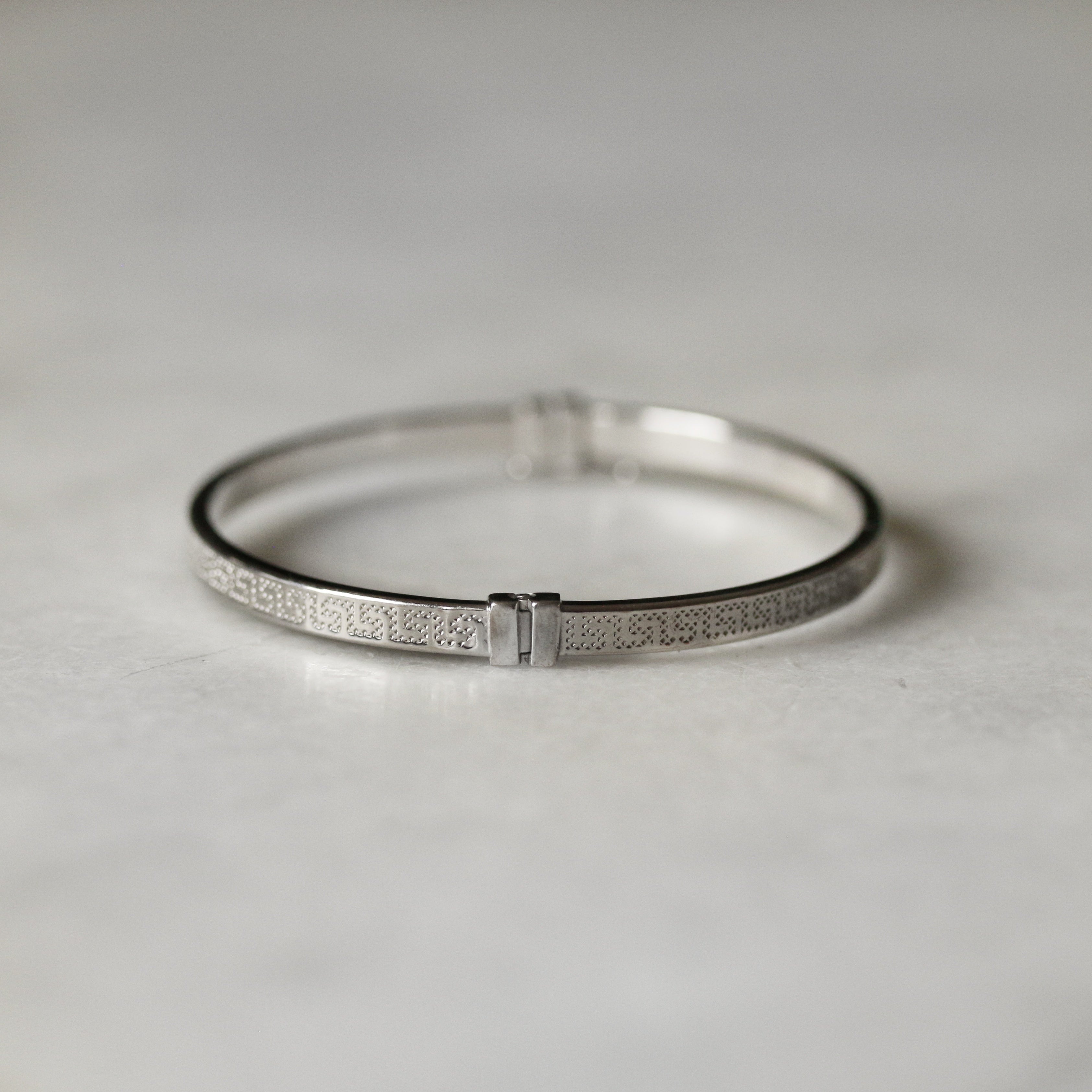 Elegant 9ct white gold bangle featuring a distinctive Greek key design, secured with a reliable figure-of-eight catch mechanism. This timeless piece combines classical aesthetics with practical craftsmanship, making it an ideal addition to any jewellery collection or a thoughtful gift for those who appreciate refined, enduring style.