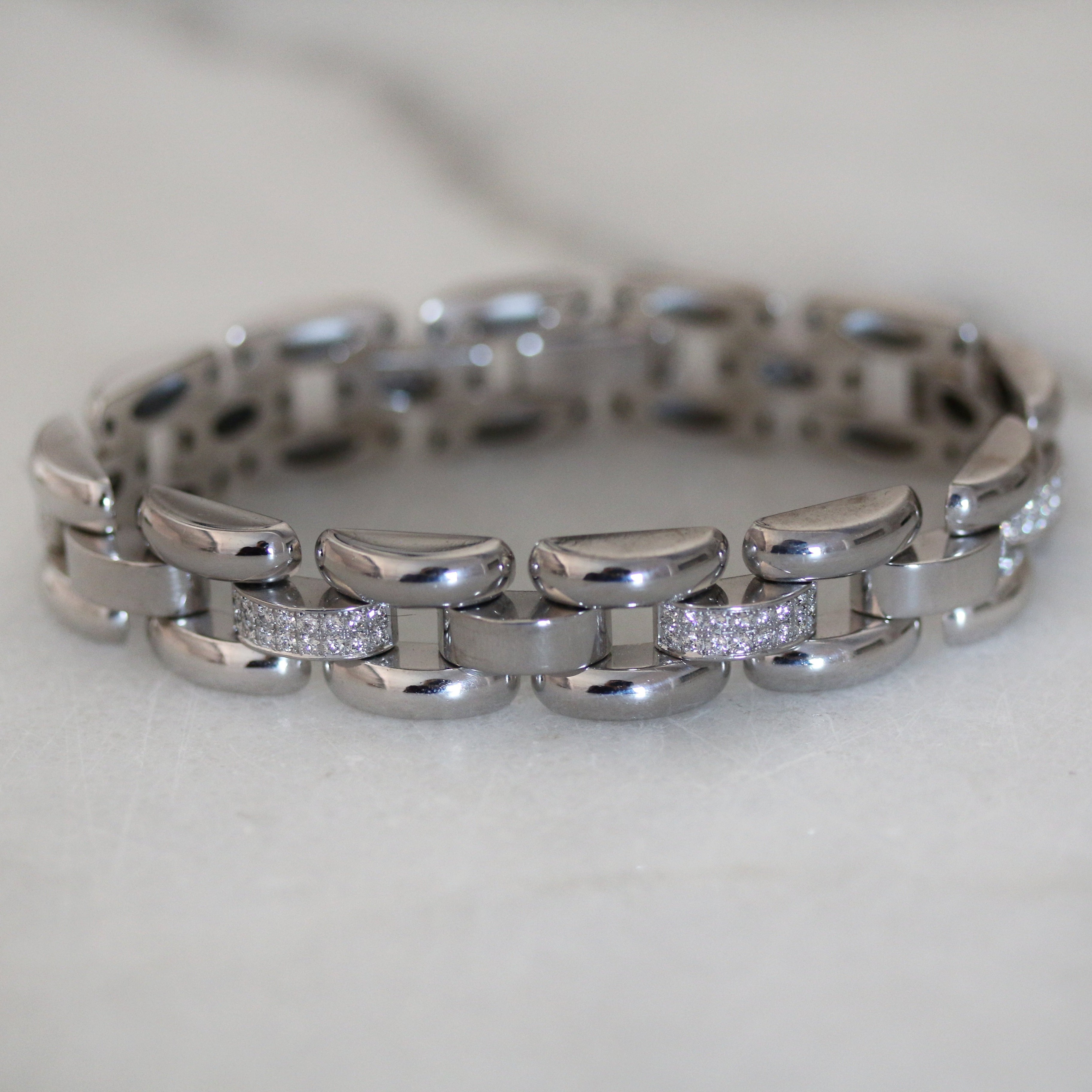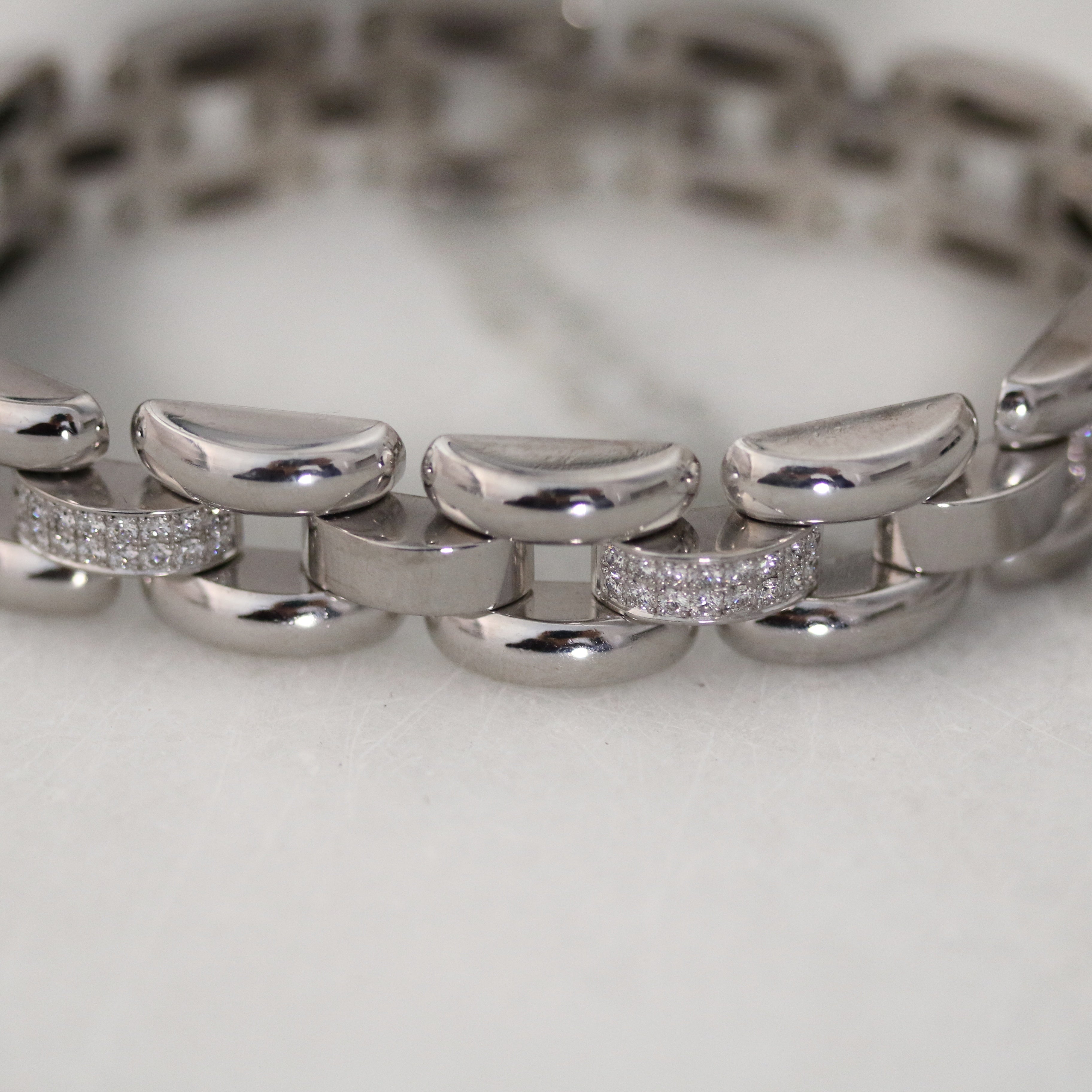 This stunning bracelet from Chopard’s “La Strada” collection is crafted in 18ct white gold and features triple links adorned with alternating rows of round brilliant diamonds, creating a dazzling and elegant accessory.