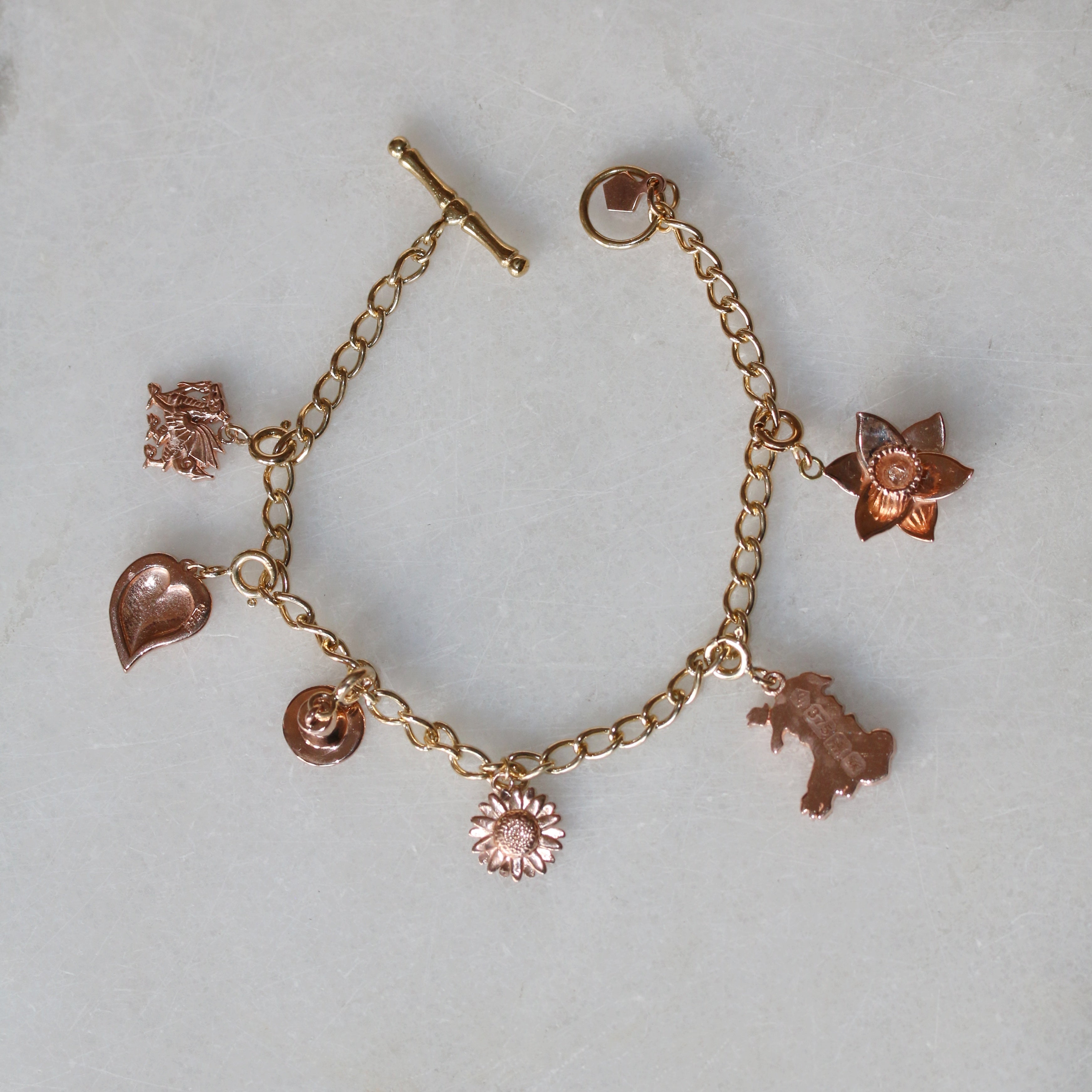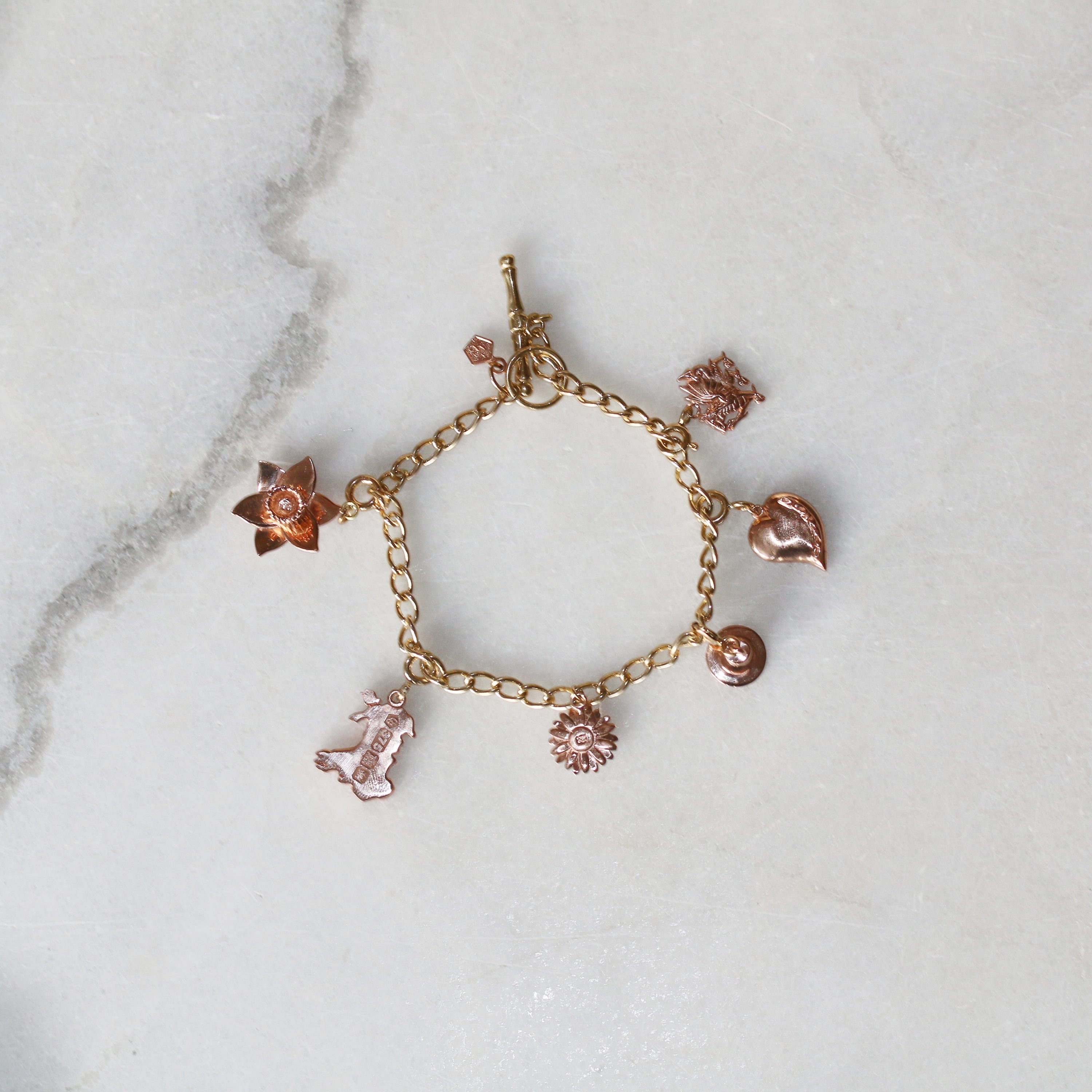 This elegant bracelet features 9ct yellow gold and includes removable 9ct rose gold charms from Clogau, secured by a stylish T-Bar clasp for a perfect fit.