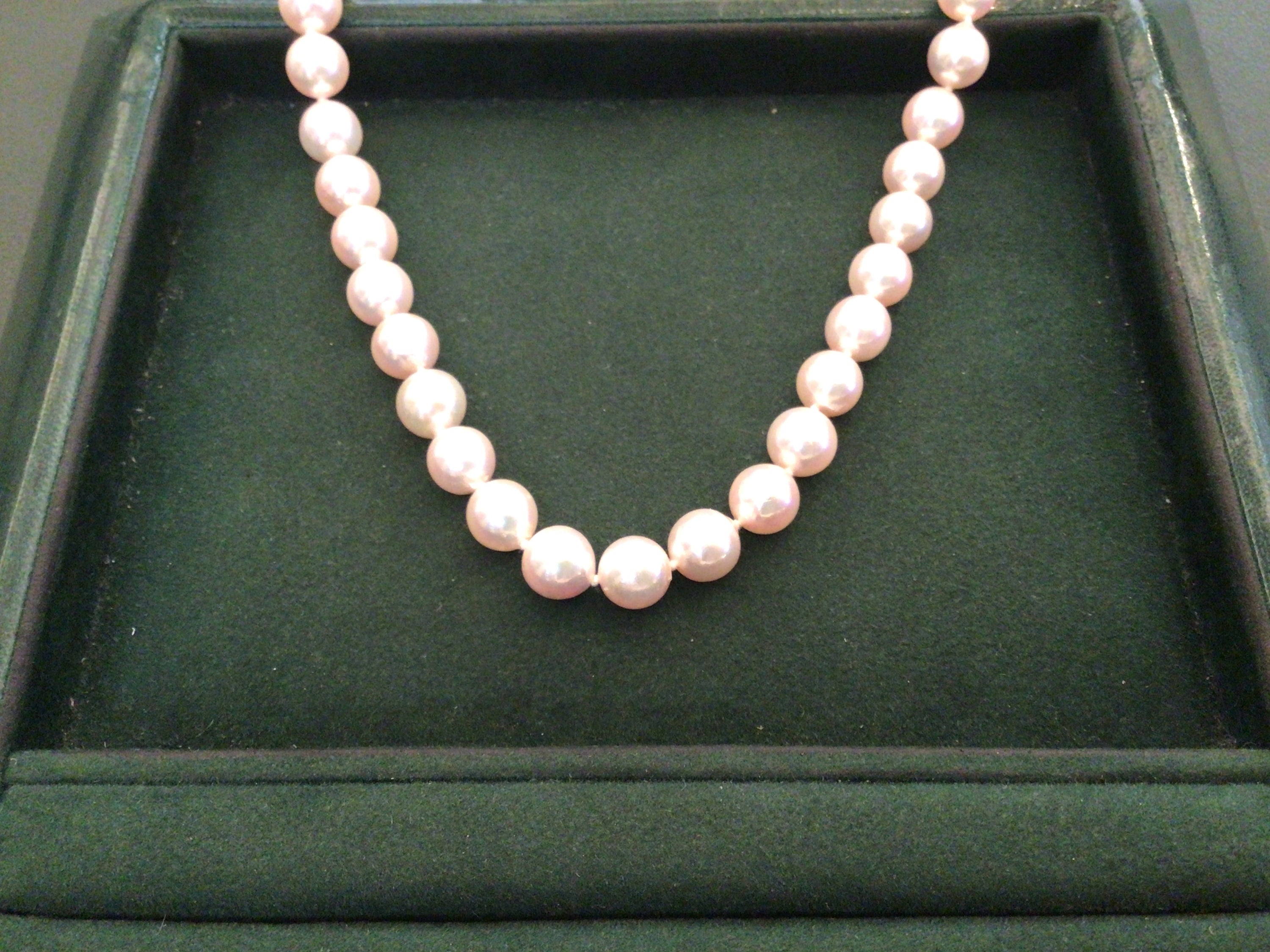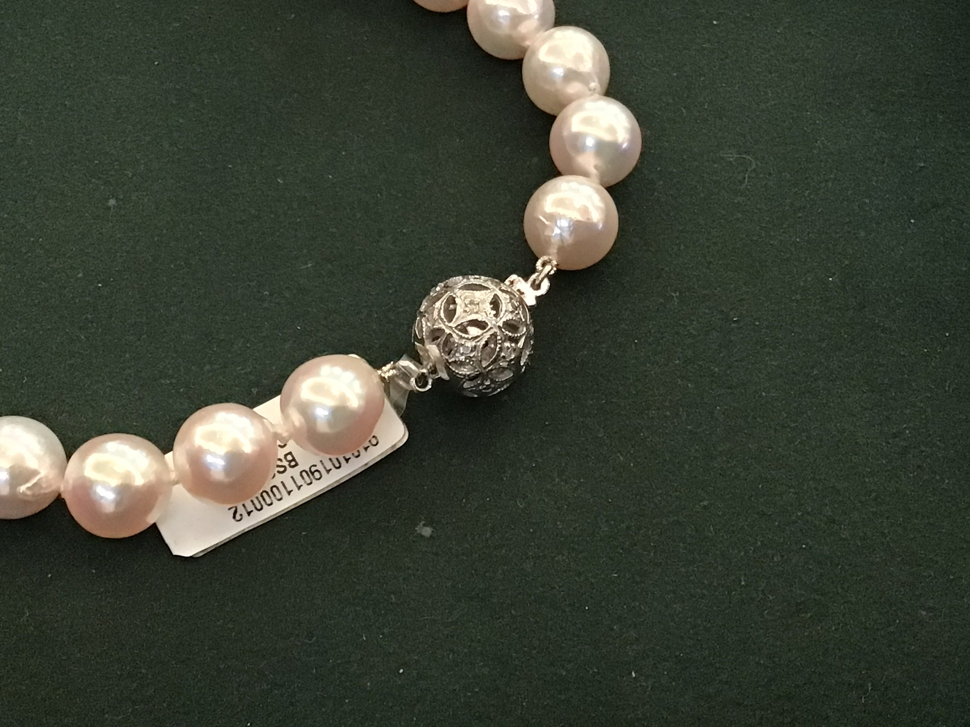 An 18ct white gold pearl necklace featuring a diamond set clasp.