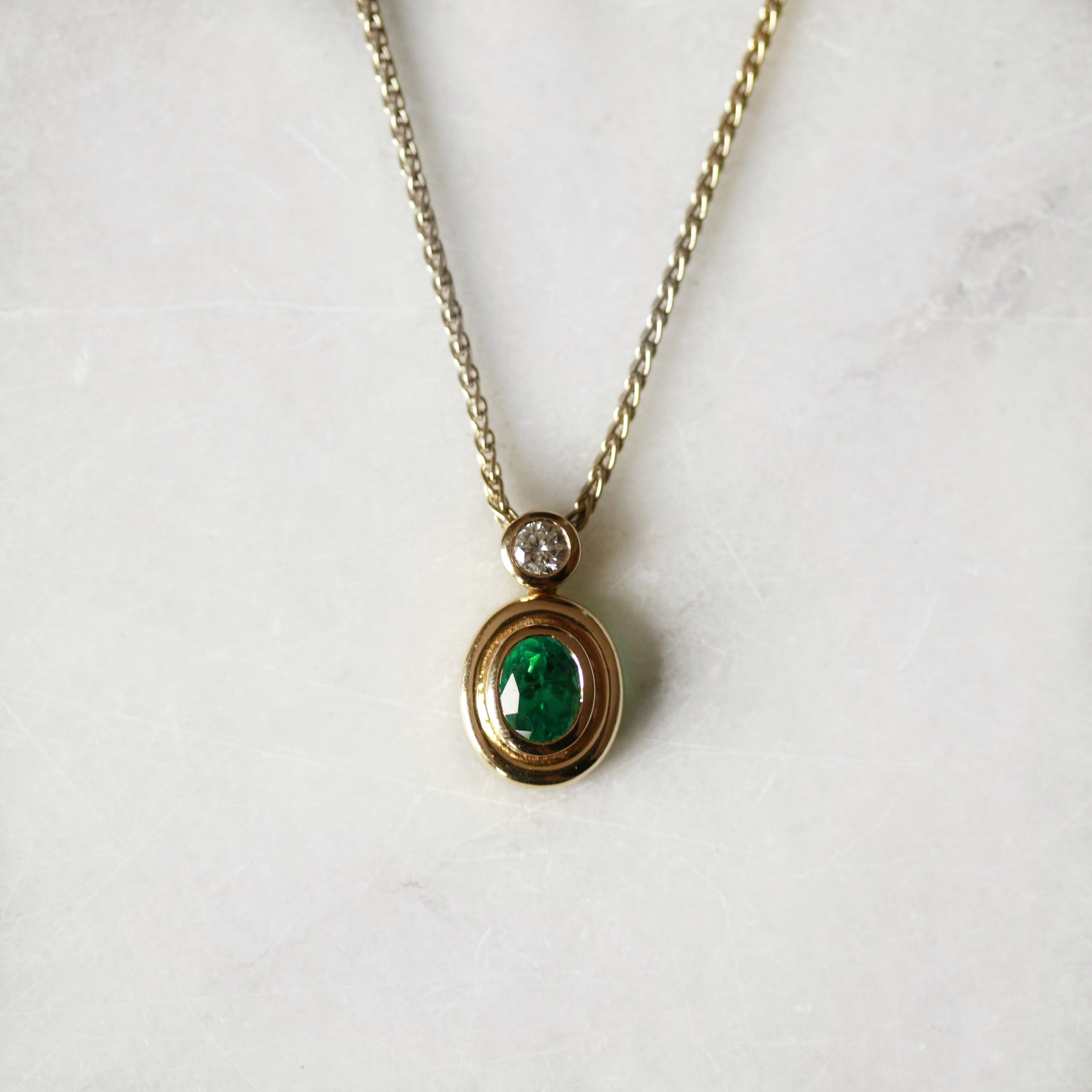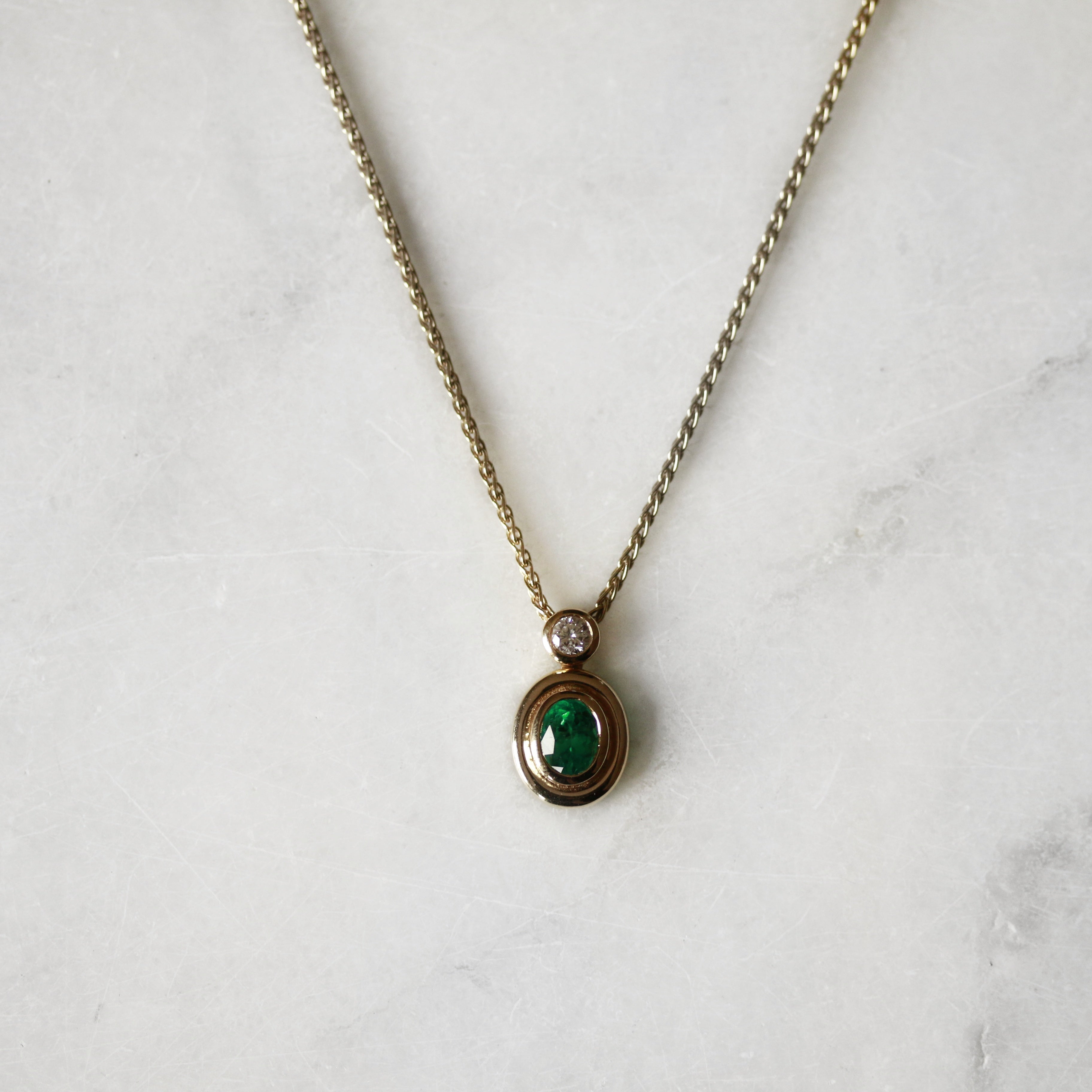 This exquisite pendant by Boodles showcases a harmonious pairing of an oval-cut emerald and round brilliant diamond, each secured in refined rim settings and crafted from 18ct yellow gold. The stones are thoughtfully stacked to create visual depth and movement, whilst the accompanying 16" Spiga link chain provides elegant everyday wearability. A sophisticated piece that balances precious gemstones with timeless design.