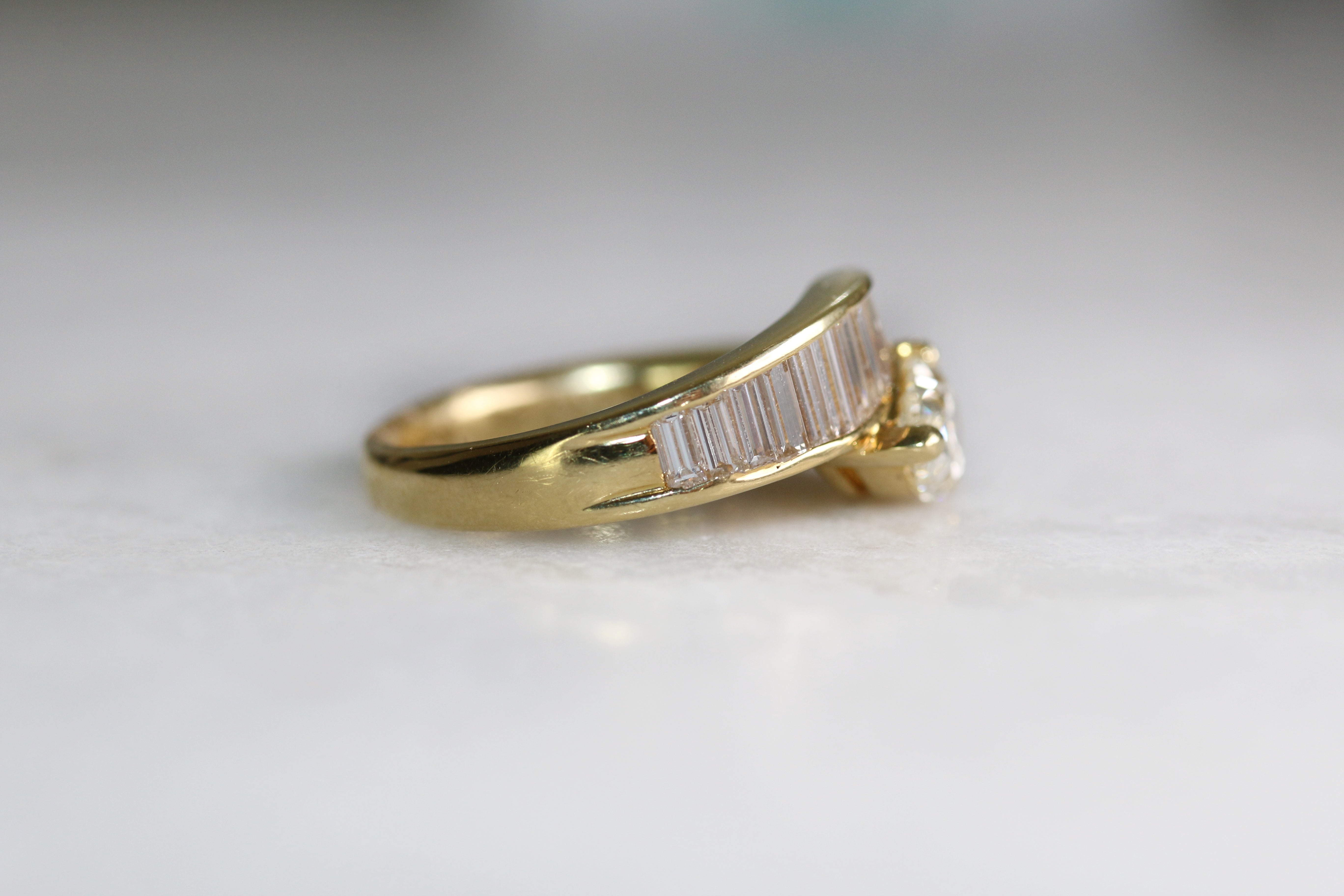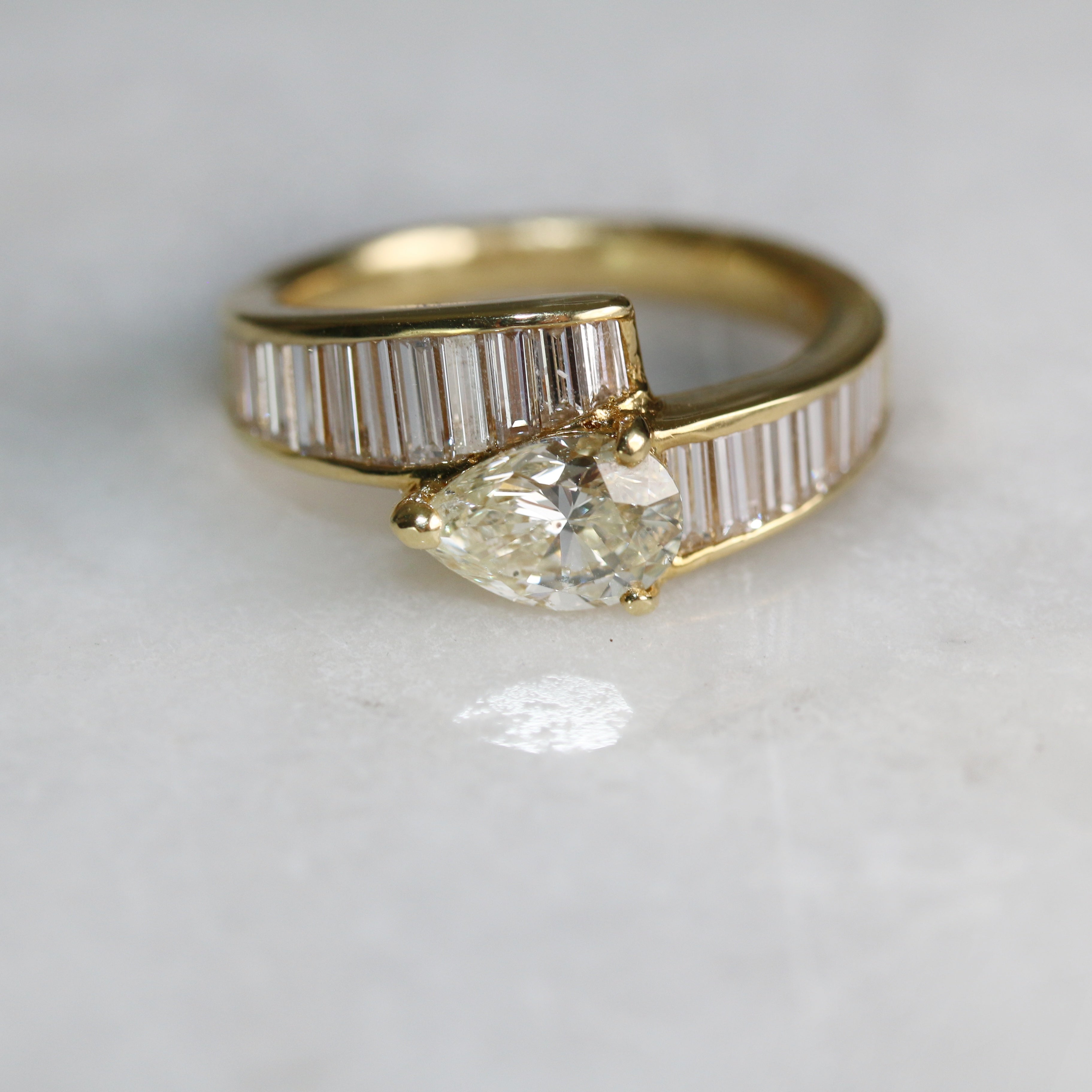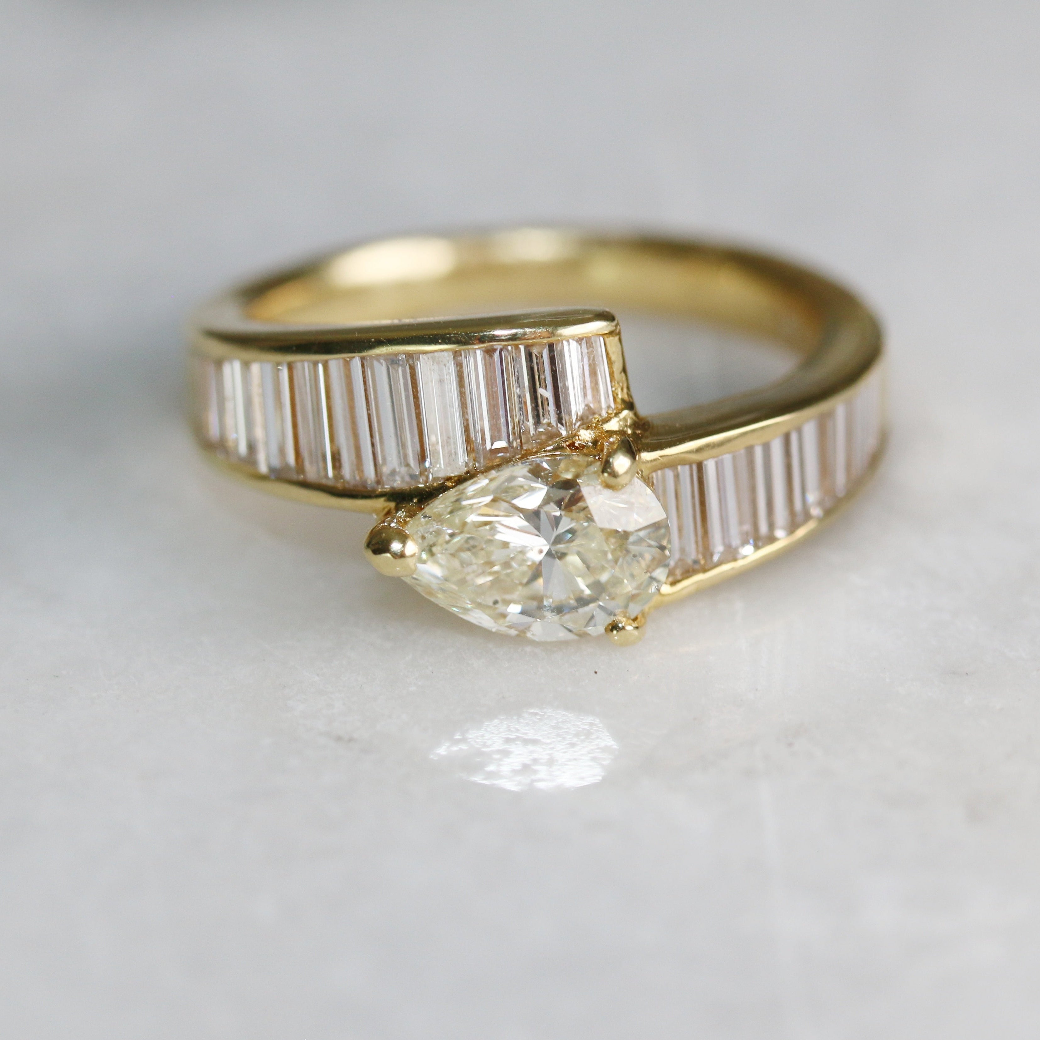 This 18ct yellow gold crossover ring showcases a stunning 1.14ct pear cut diamond at its centre, beautifully complemented by two rows of baguette cut diamonds totalling approximately 1.21ct. Its elegant design highlights the brilliance and sophistication of every detail.