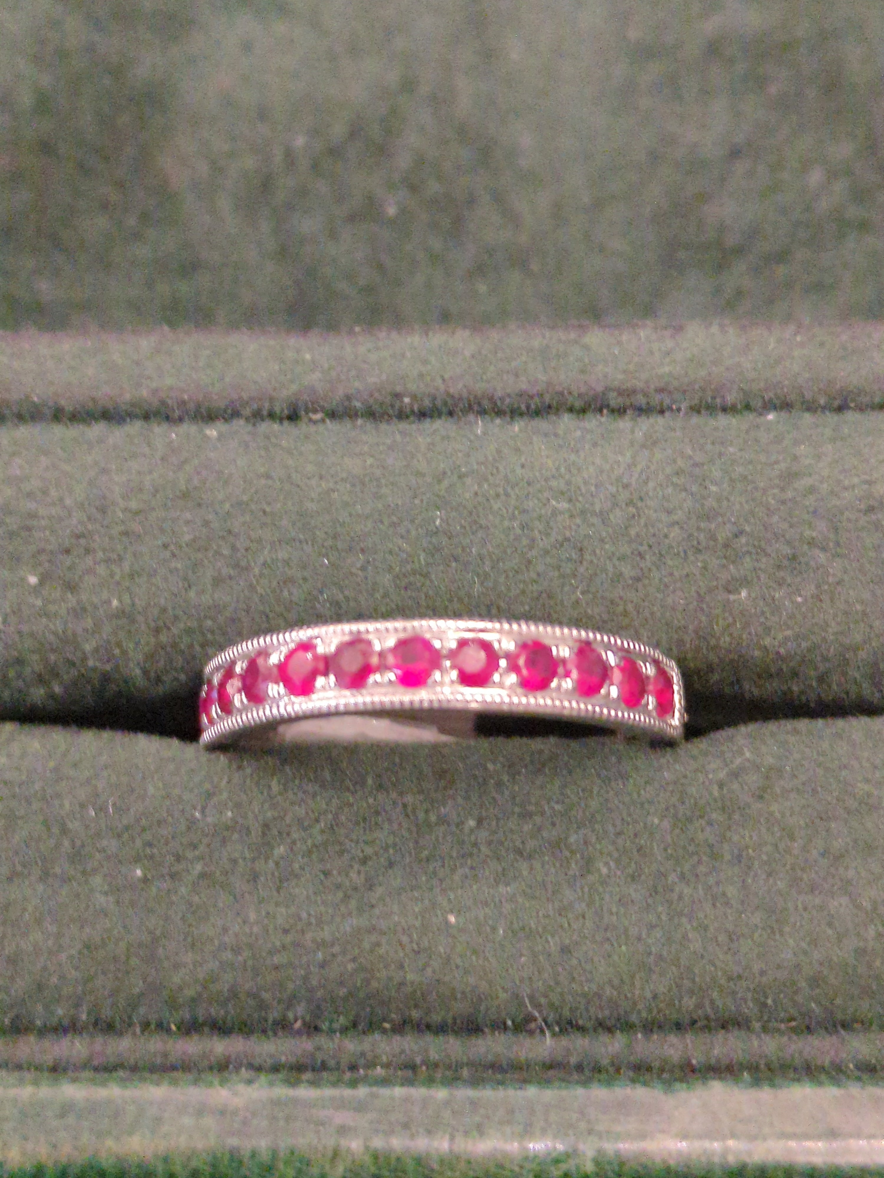 A platinum Ruby half eternity ring with grain setting and round brilliant Rubies.