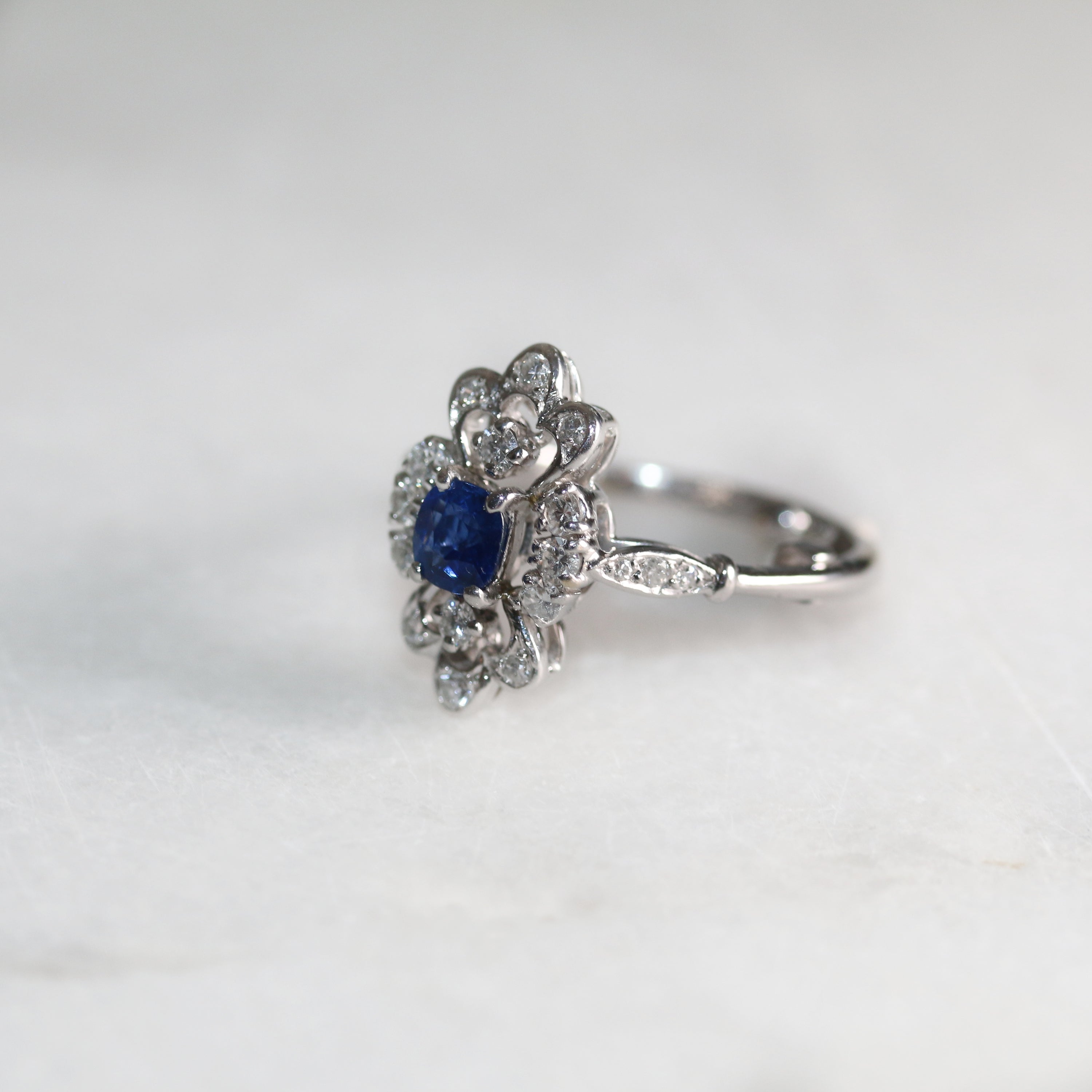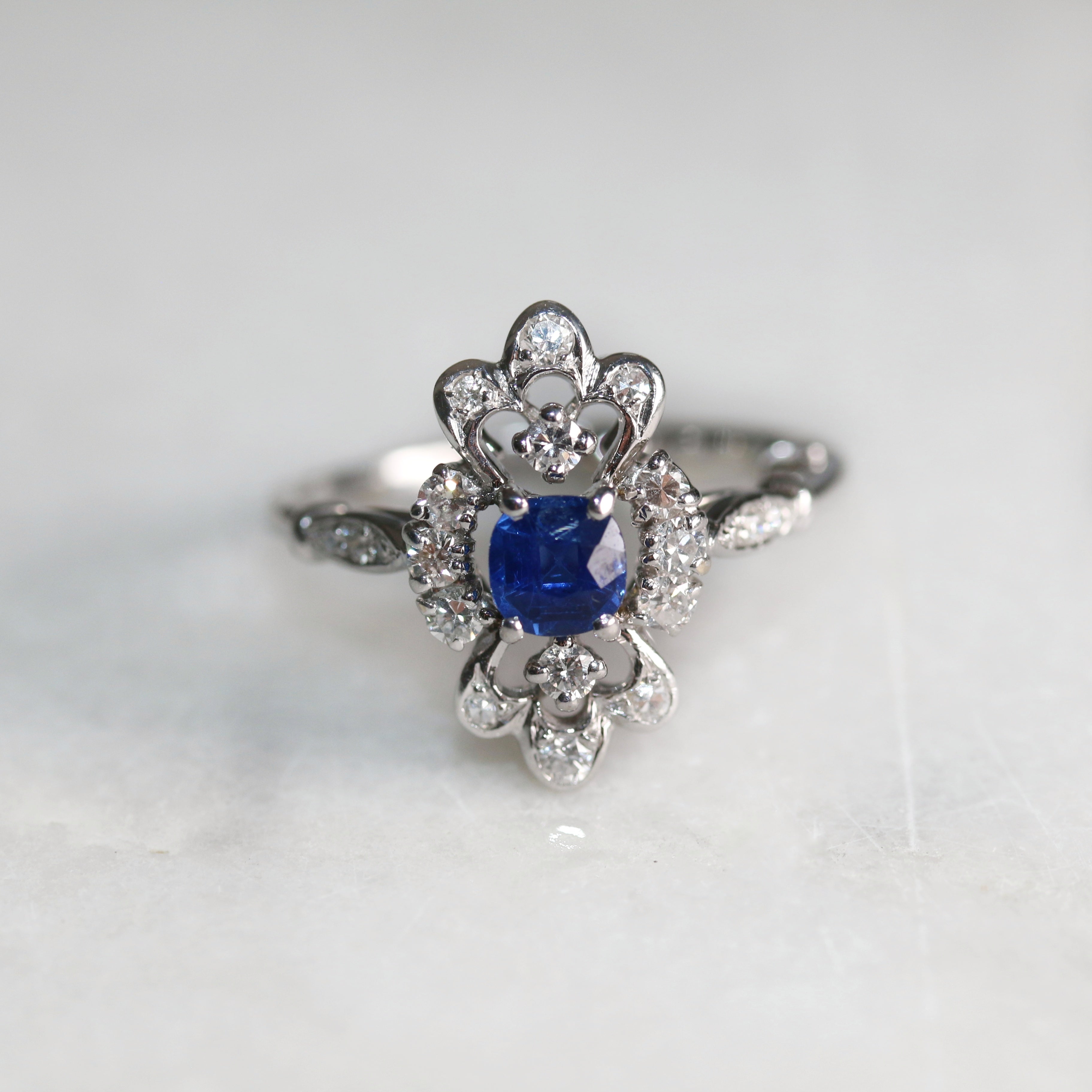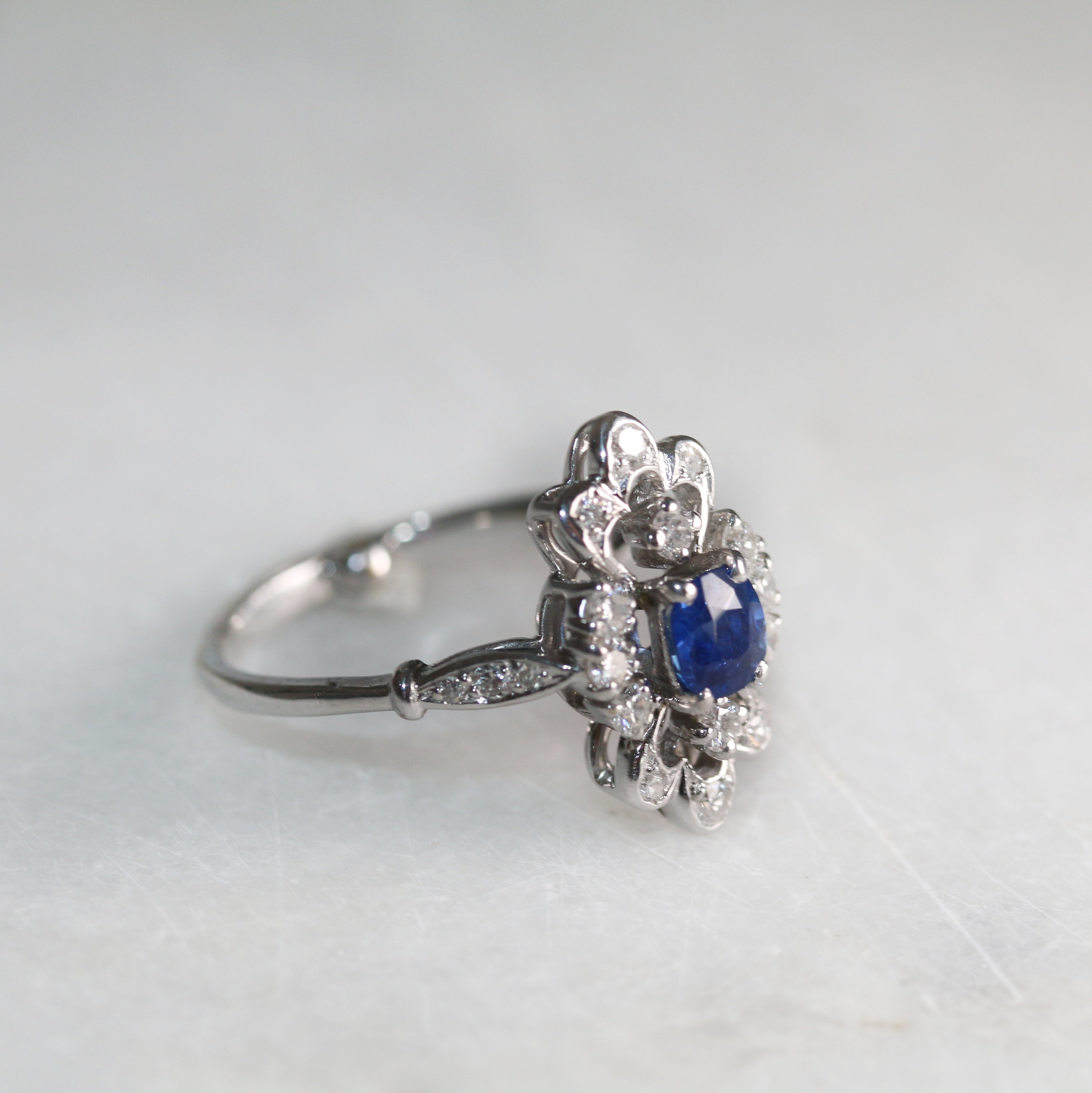 Discover the elegance of this elongated marquise-shaped cluster ring featuring 0.75ct of natural sapphire surrounded by sparkling diamonds. Its open work design enhances the vibrant blue of the sapphire, creating a timeless and captivating piece.