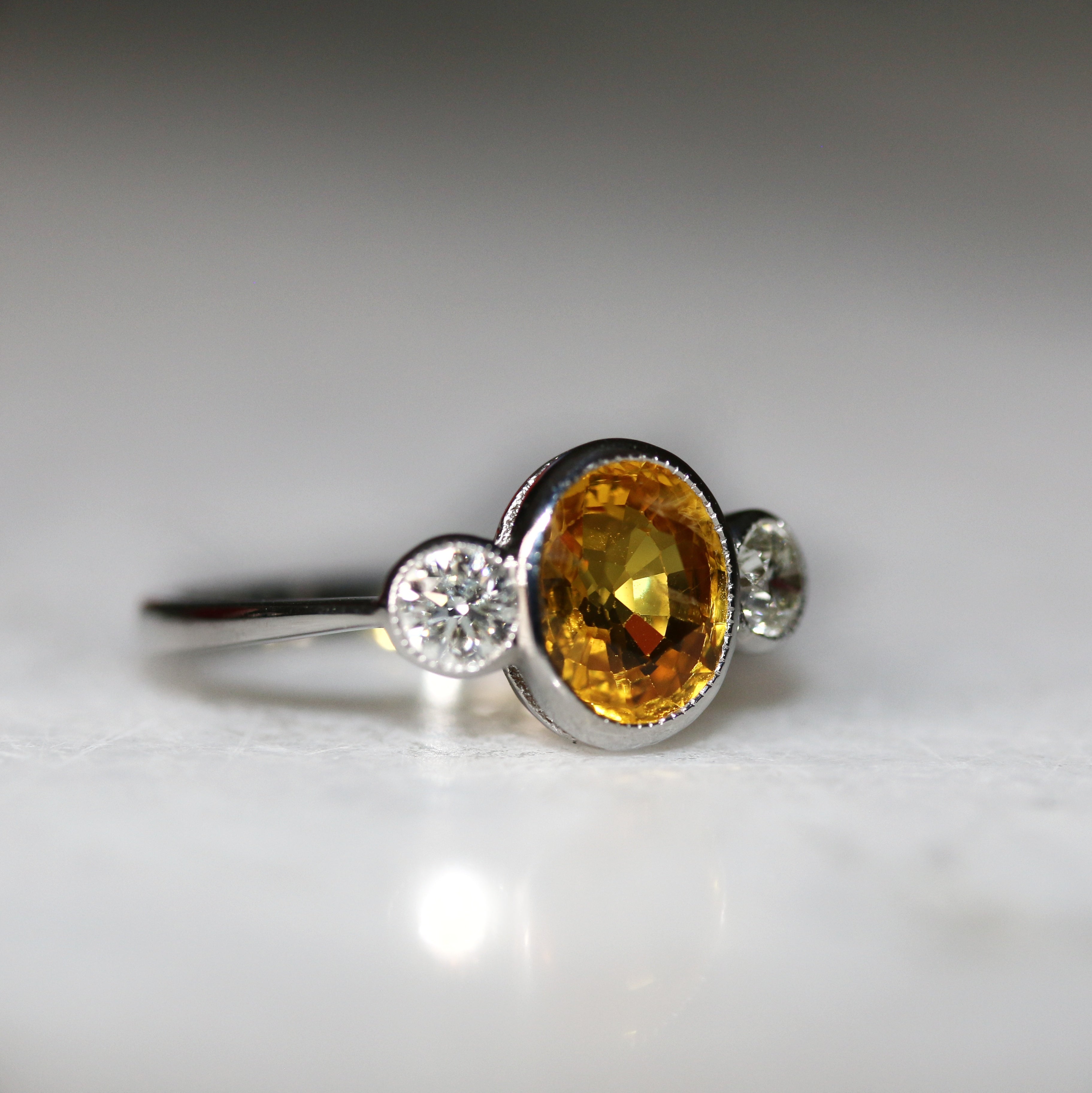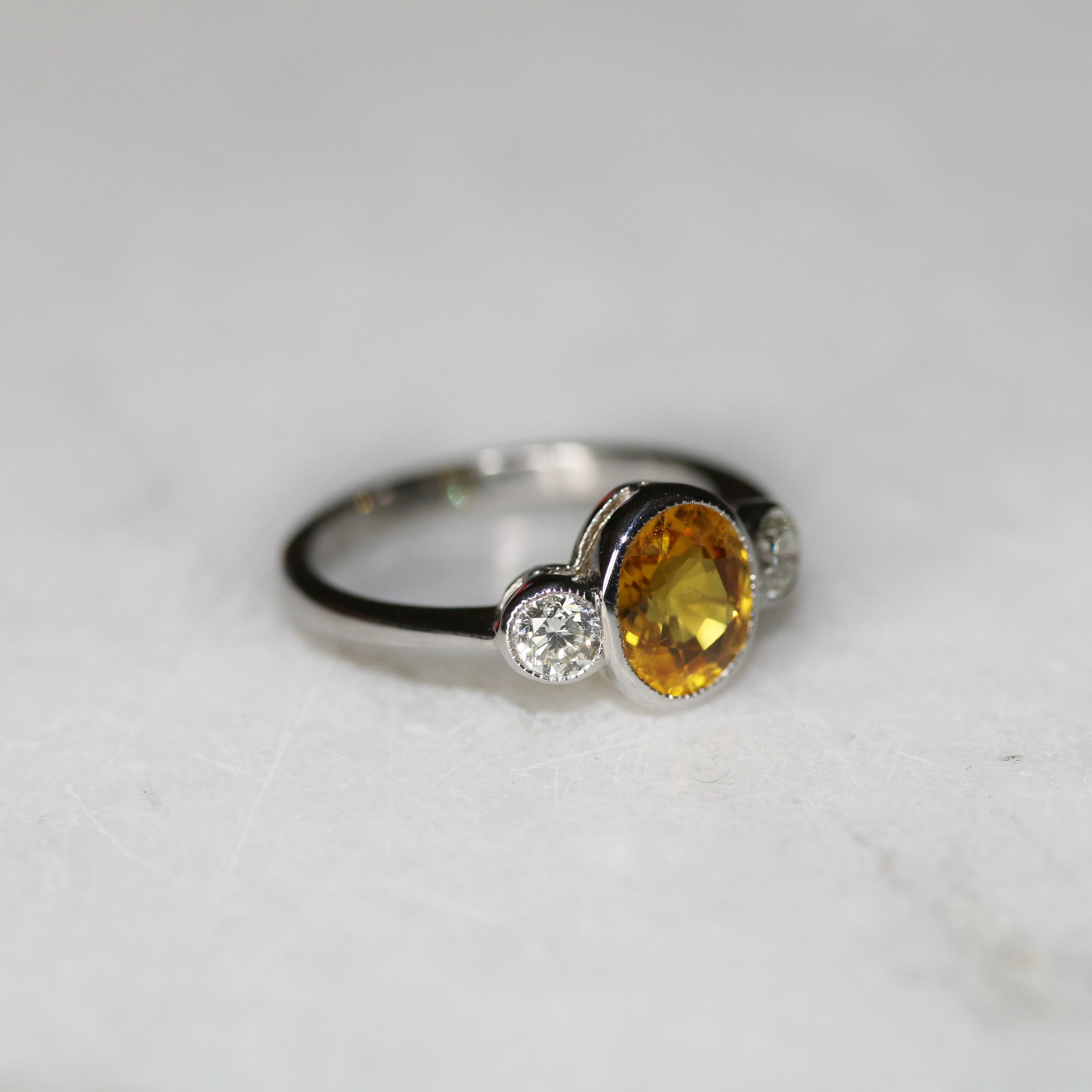 Elevate your engagement with this stunning three-stone ring, where a radiant oval yellow sapphire takes centre stage, flanked by brilliant round diamonds in a secure bezel setting. Crafted in prestigious platinum, this design combines timeless elegance with contemporary sophistication, ensuring your precious gemstones are protected while catching the light from every angle. A truly captivating choice for those seeking something distinctly special.