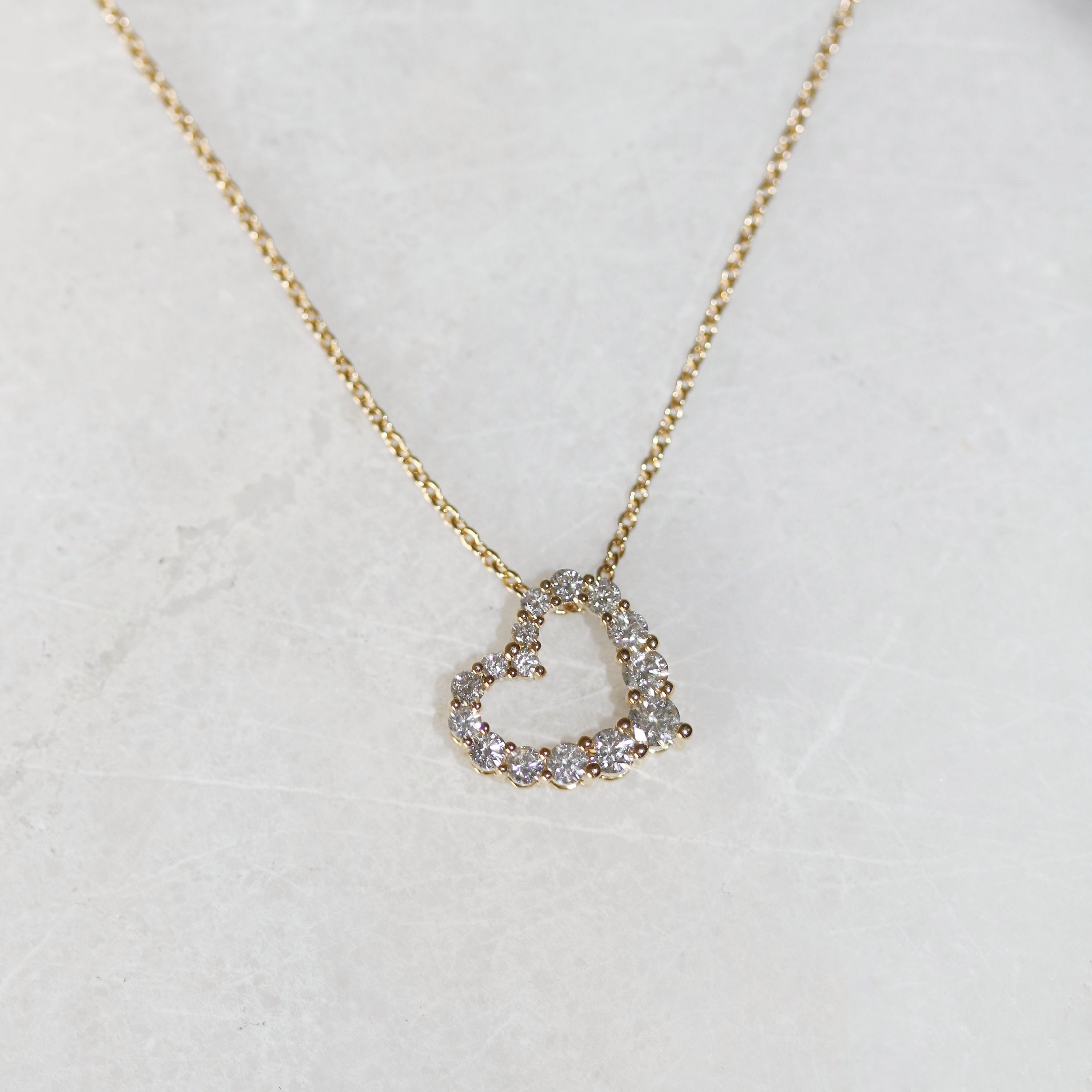This 18ct yellow gold heart pendant showcases a striking diagonal heart design, adorned with sparkling round brilliant cut diamonds totalling 0.38ct, adding timeless elegance to any look.
