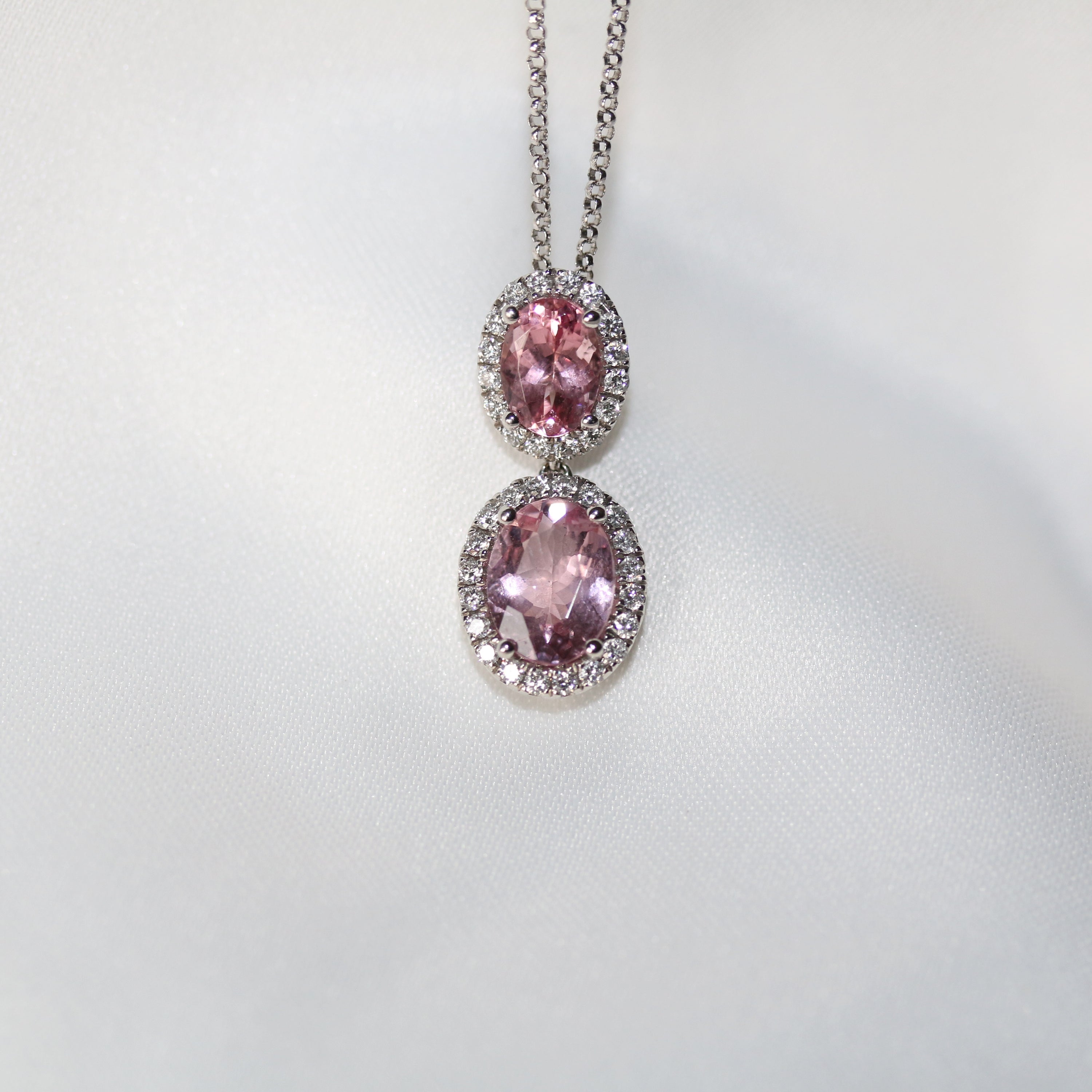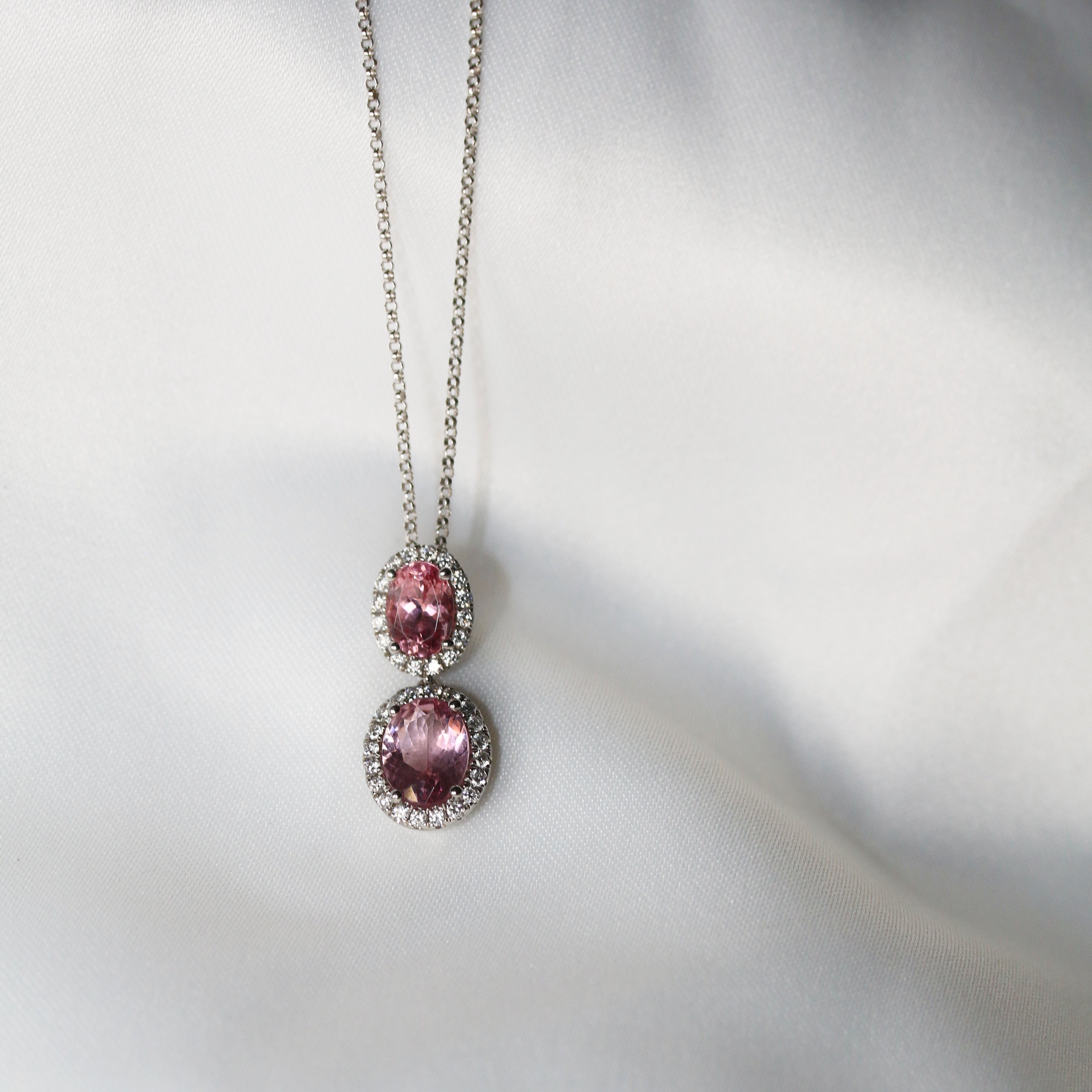This elegant 18ct white gold pendant showcases two oval-cut Petal pink  Madagascan morganites, each surrounded by sparkling round brilliant cut diamonds. Suspended from an 18" chain secured with a lobster clasp, it combines timeless beauty with refined craftsmanship to elevate any outfit.