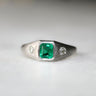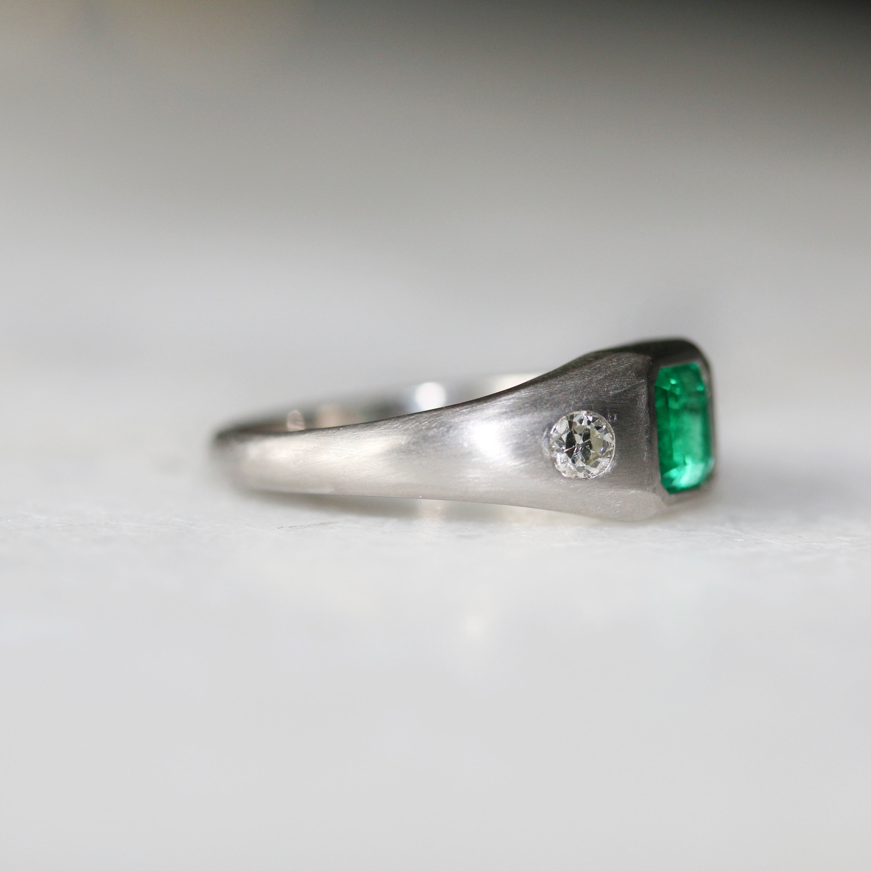 This elegant three stone ring showcases a striking 0.60ct emerald flanked by two sparkling round brilliant diamonds totalling 0.11ct. Crafted in platinum with a modern brushed finish, this ring combines timeless beauty with contemporary style for a truly captivating piece.