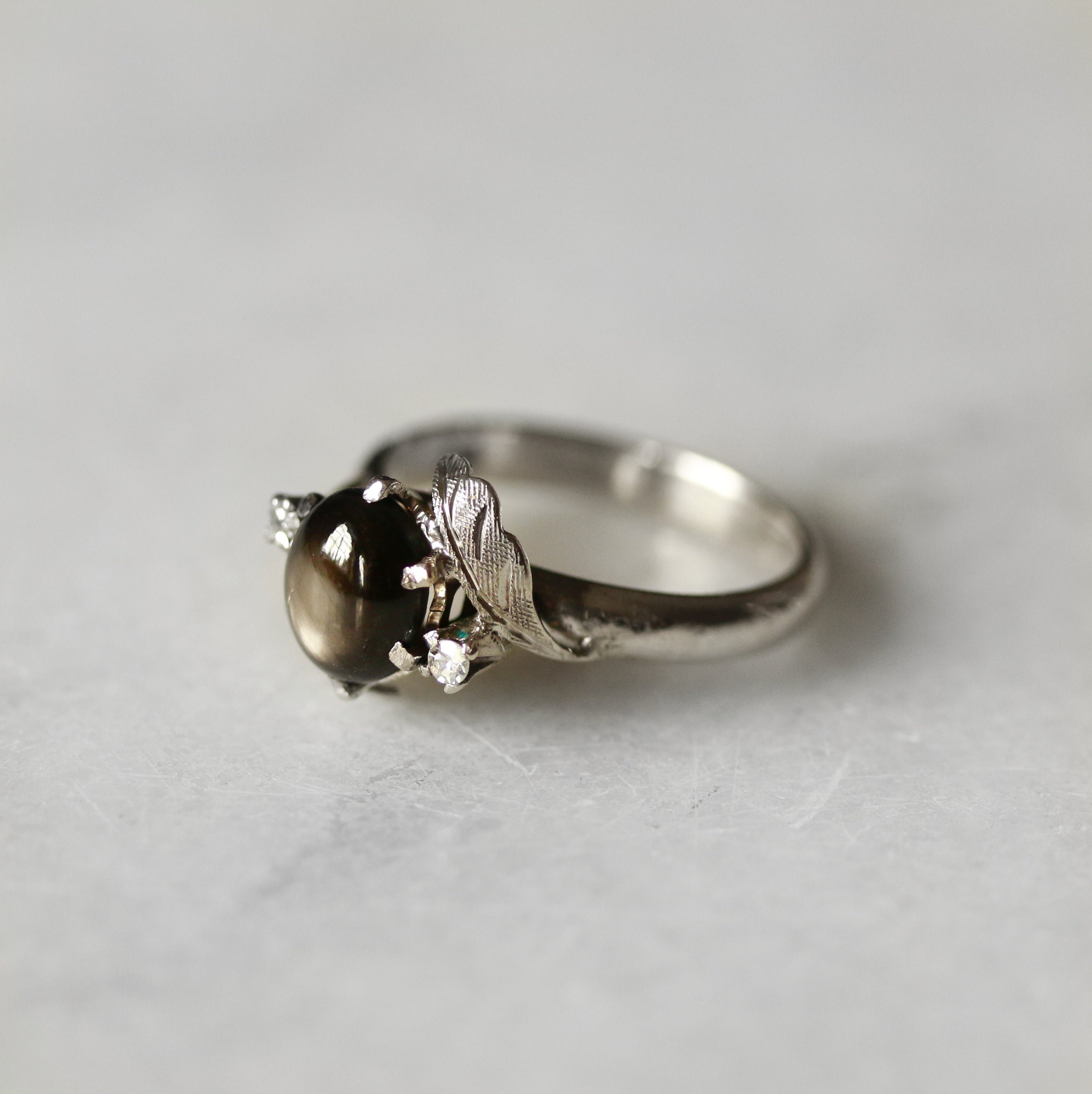 Elevate your jewellery collection with this stunning 18ct white gold dress ring, featuring a captivating cat's eye chrysoberyl as its centrepiece. The chrysoberyl's distinctive optical effect creates a mesmerising band of light that shifts across the stone's surface, making it a truly unique piece. Complemented by sparkling diamonds set in lustrous white gold.