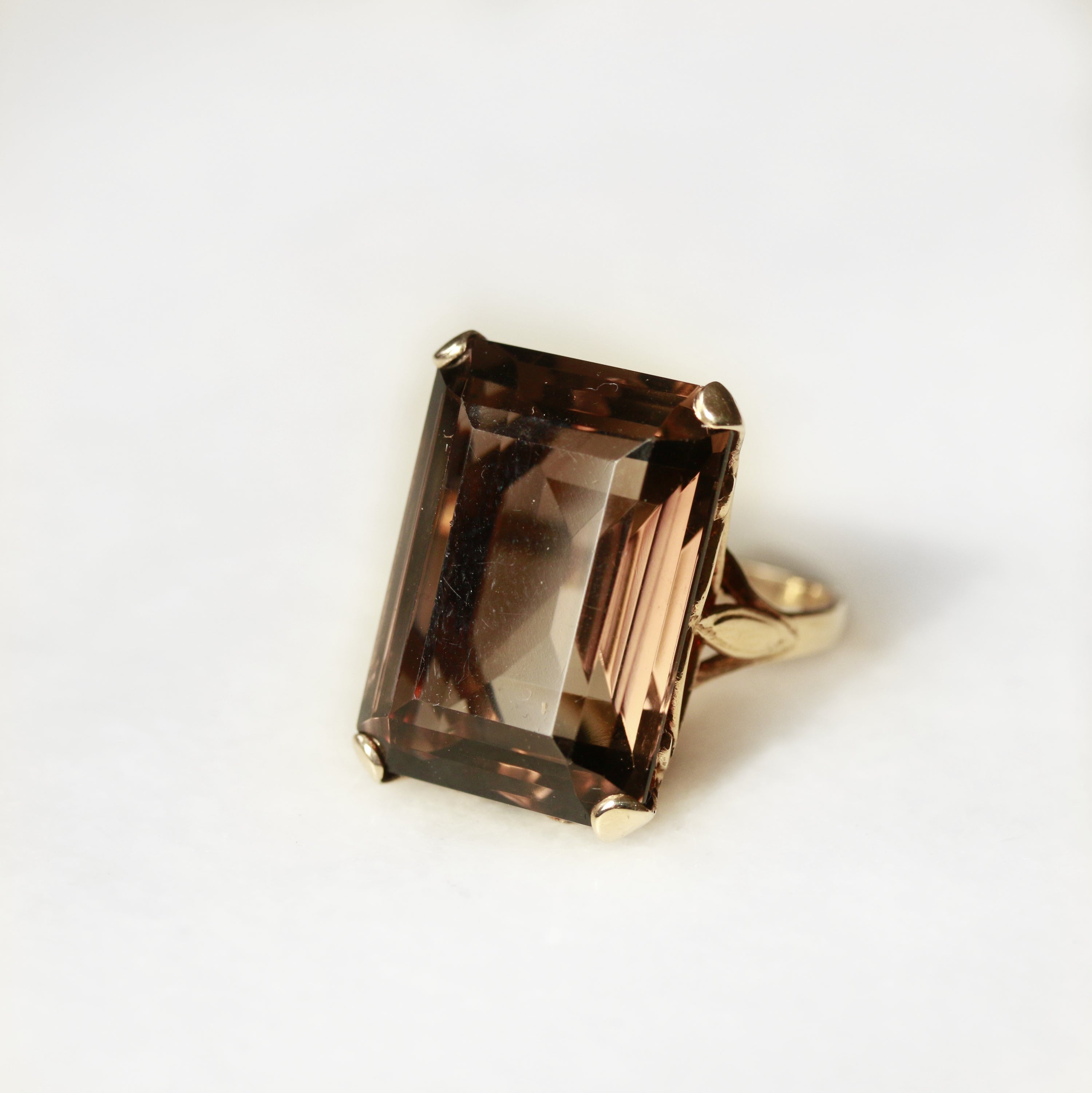 A stunning vintage dress ring crafted in 9ct yellow gold, featuring a beautiful smoky quartz stone. This authentic piece bears the London hallmark from 1970. The warm glow of yellow gold complements the rich, earthy tones of the smoky quartz perfectly, making it an elegant choice for special occasions or everyday wear. A timeless addition to any jewellery collection with genuine vintage character.