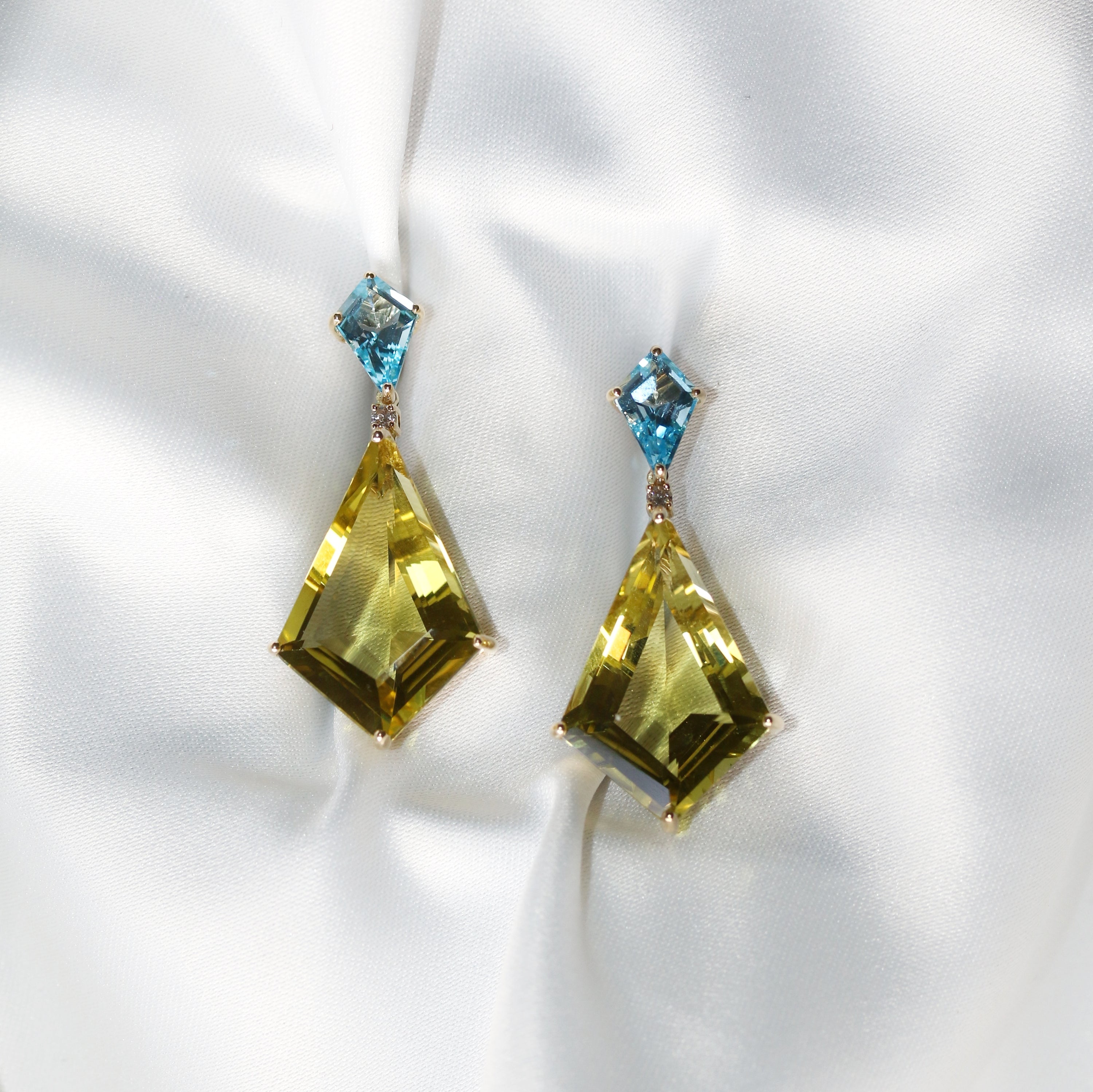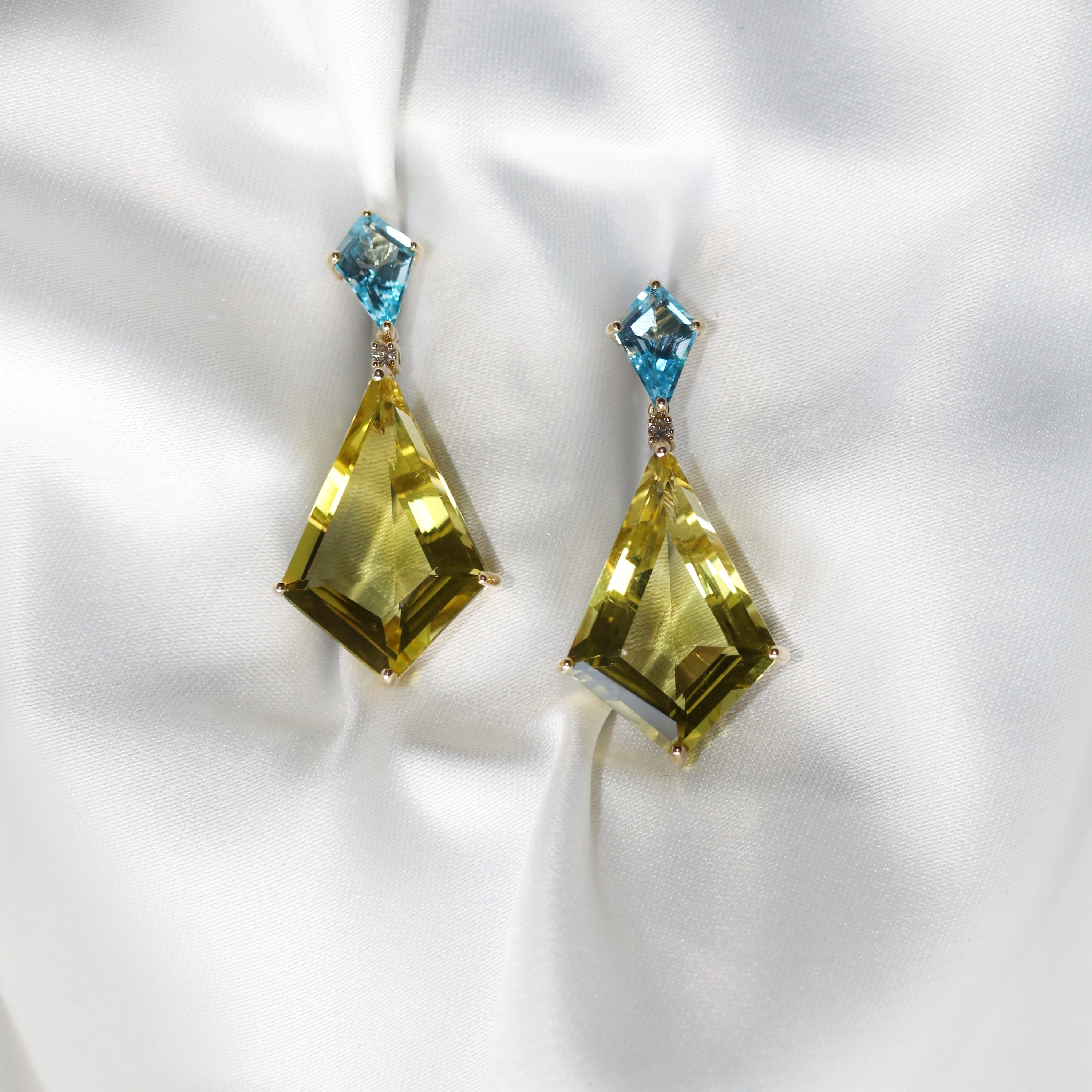 Lemon Quartz, Blue Topaz & Diamond Drop Earrings