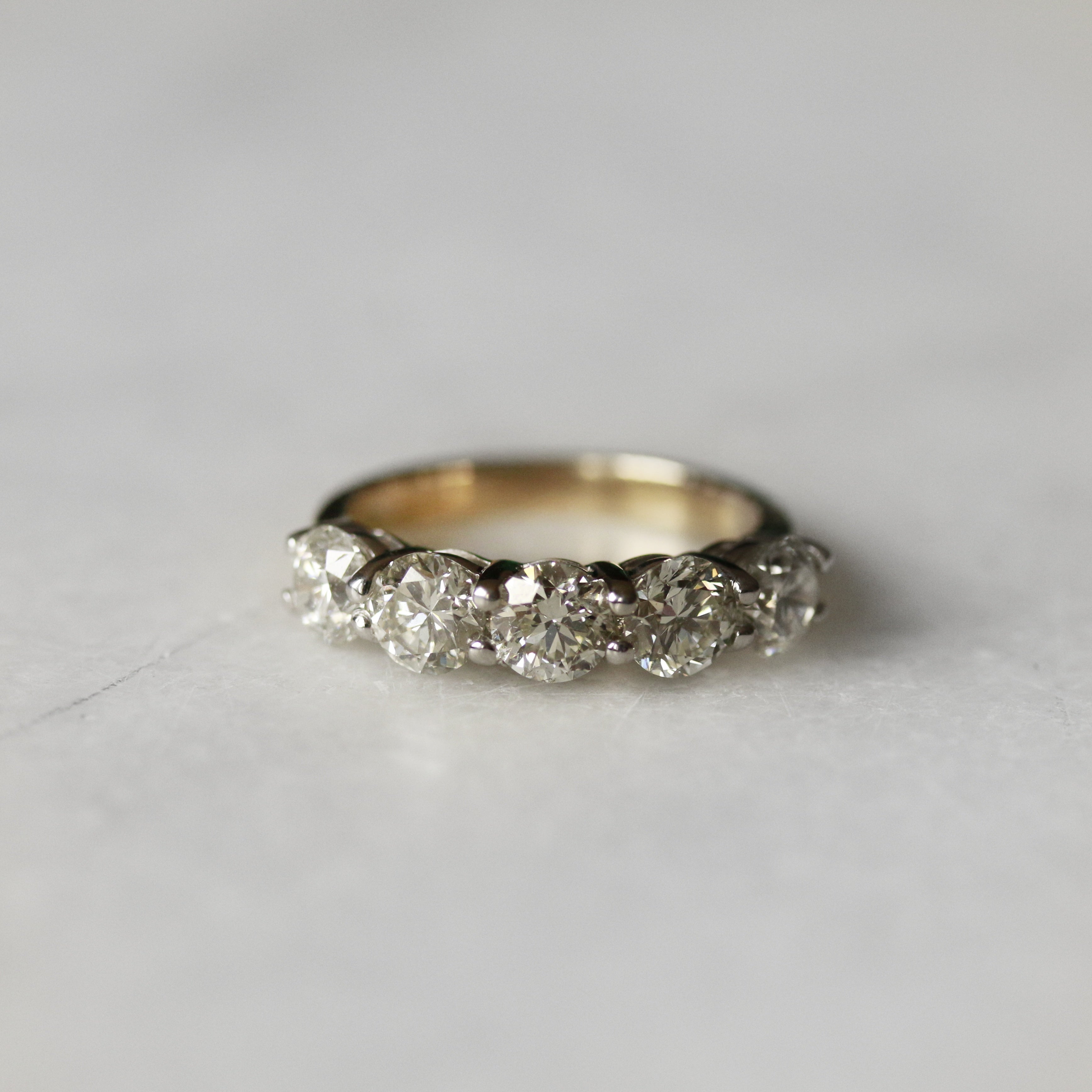 A sophisticated five-stone design in 18ct yellow gold, this ring features round brilliant cut diamonds totalling 2.61cts . The graduated arrangement of stones creates a striking visual progression, while the warm lustre of yellow gold complements the brilliance of each diamond. A versatile piece that transitions seamlessly from everyday wear to special occasions, offering both timeless style and substantial sparkle.