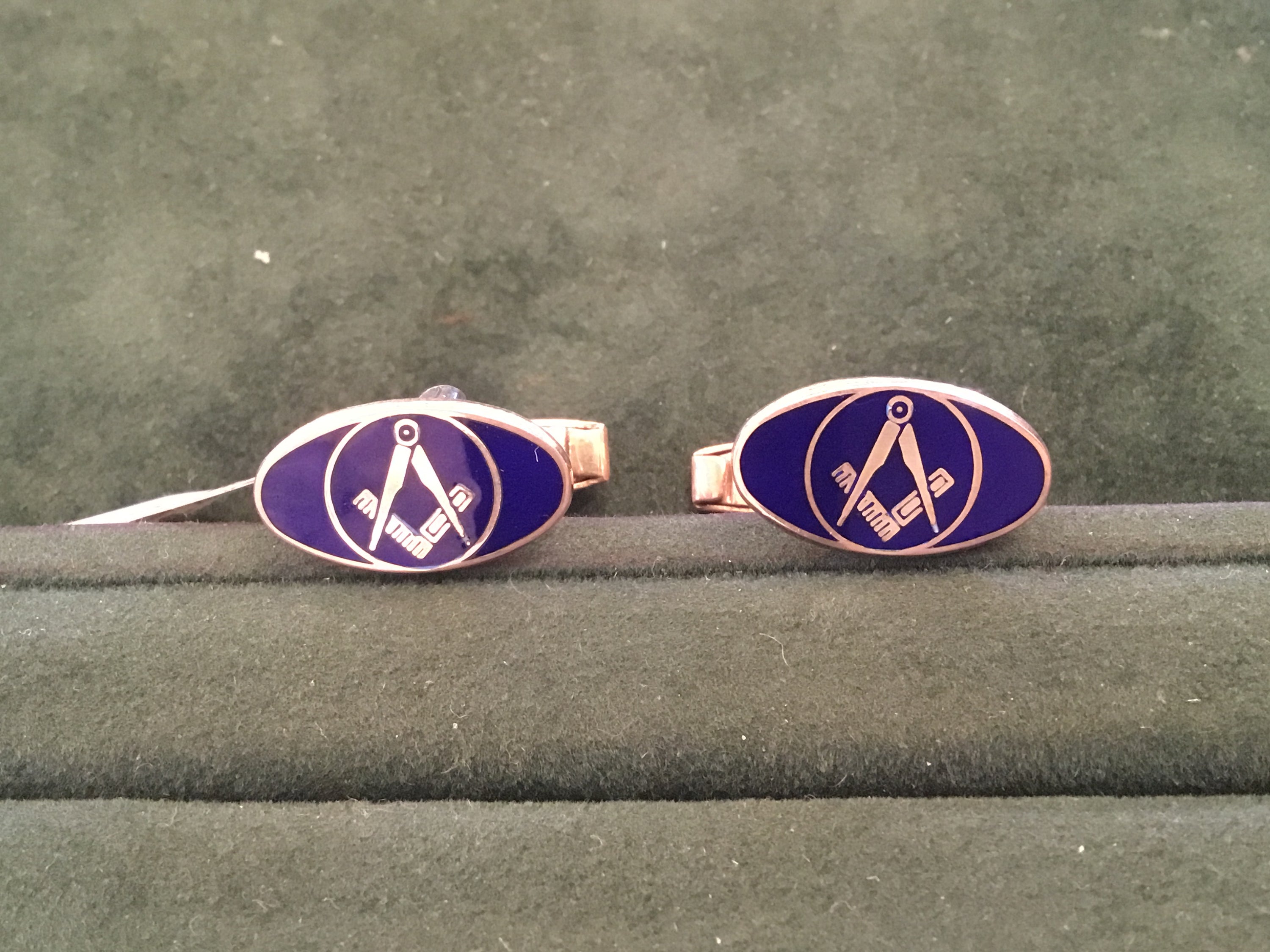 A pair of 9ct yellow gold blue enamel cufflinks with the Masonic logo on.