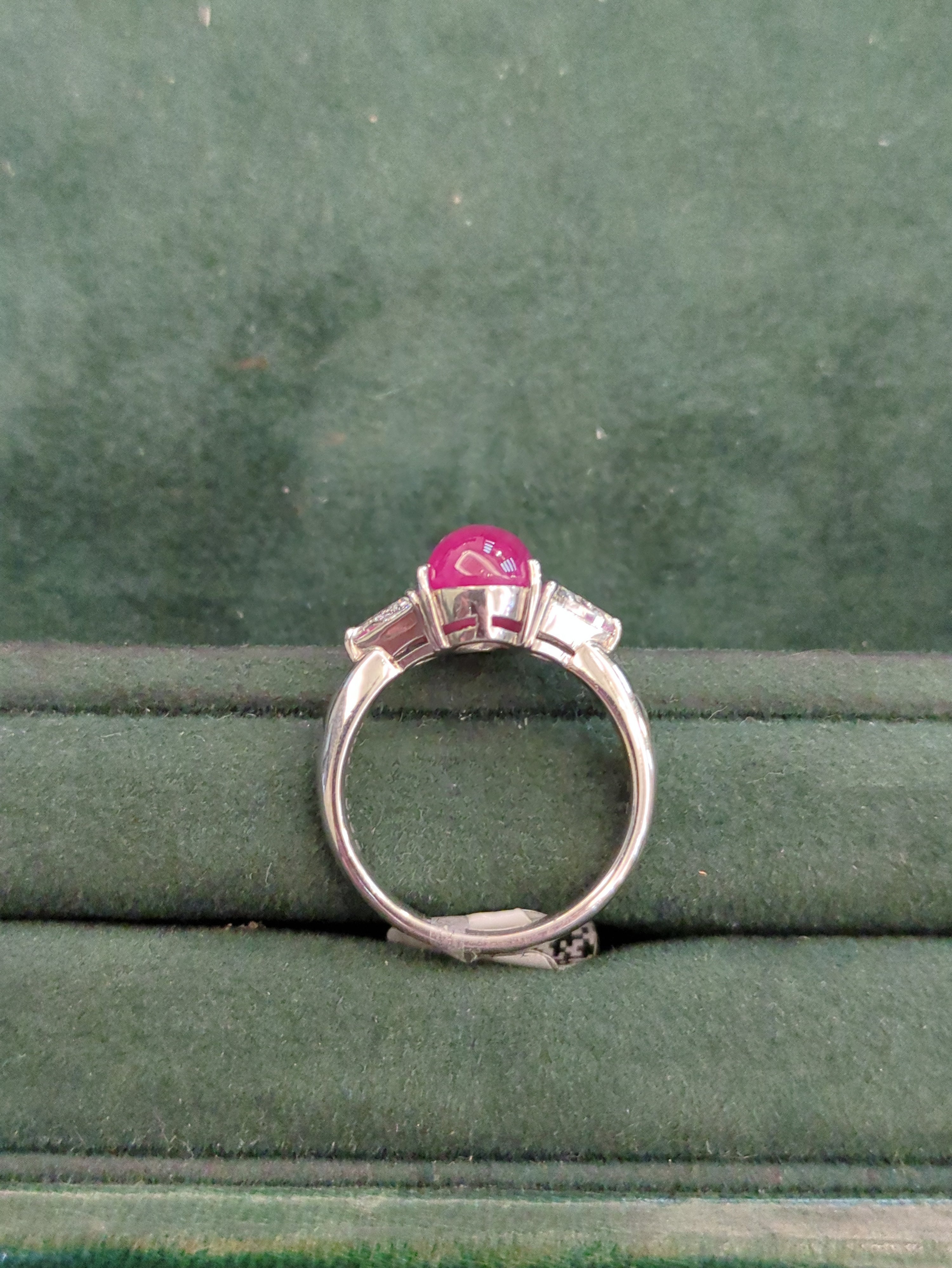 A platinum star ruby and diamond three stone ring featuring a central cabochon cut star ruby set between two trilliant cut diamonds.