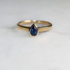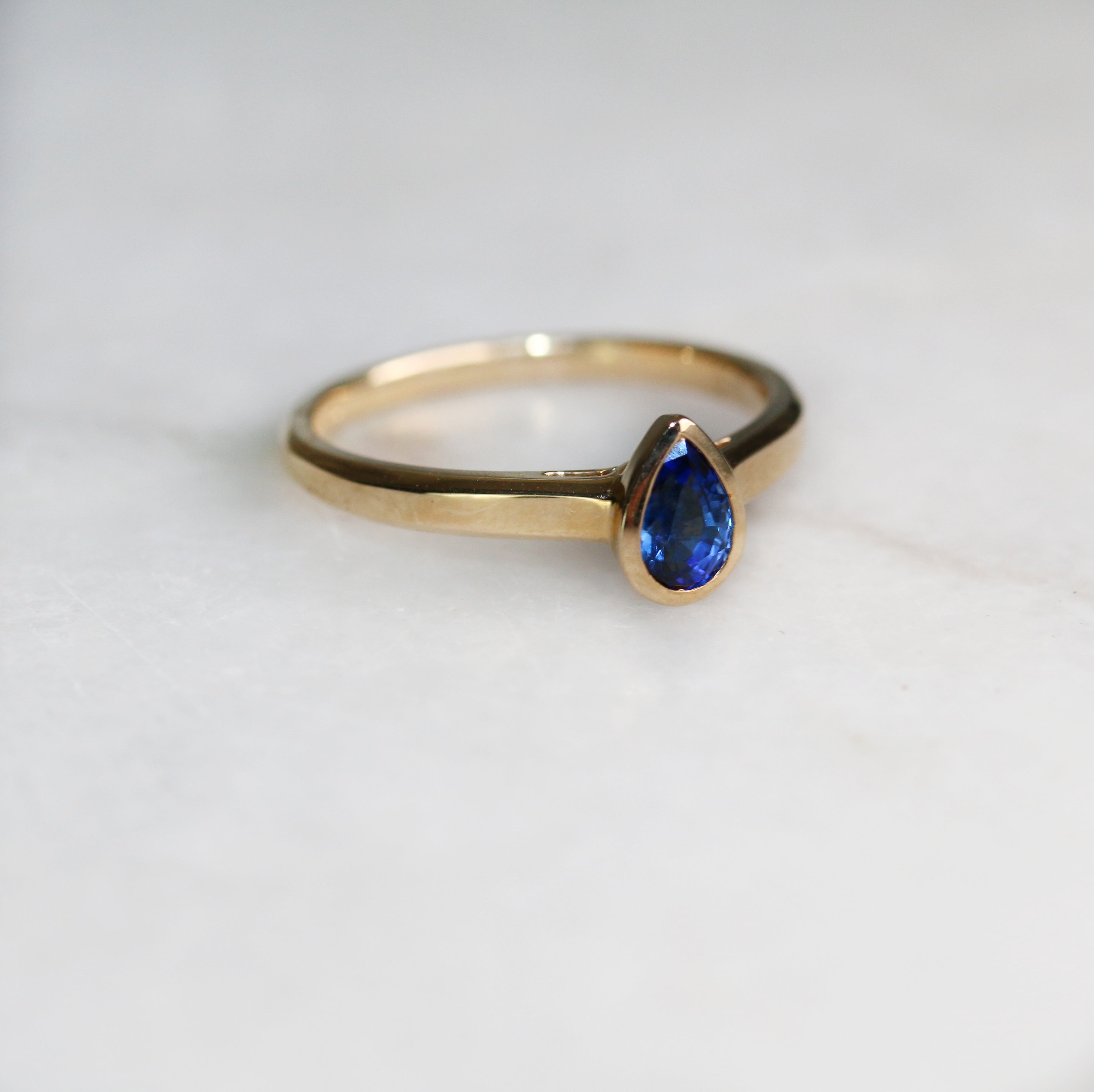 This 9ct yellow gold ring showcases a stunning 0.61ct pear-cut sapphire set securely in a classic rim setting, creating an elegant solitaire piece that captivates with its timeless beauty.