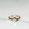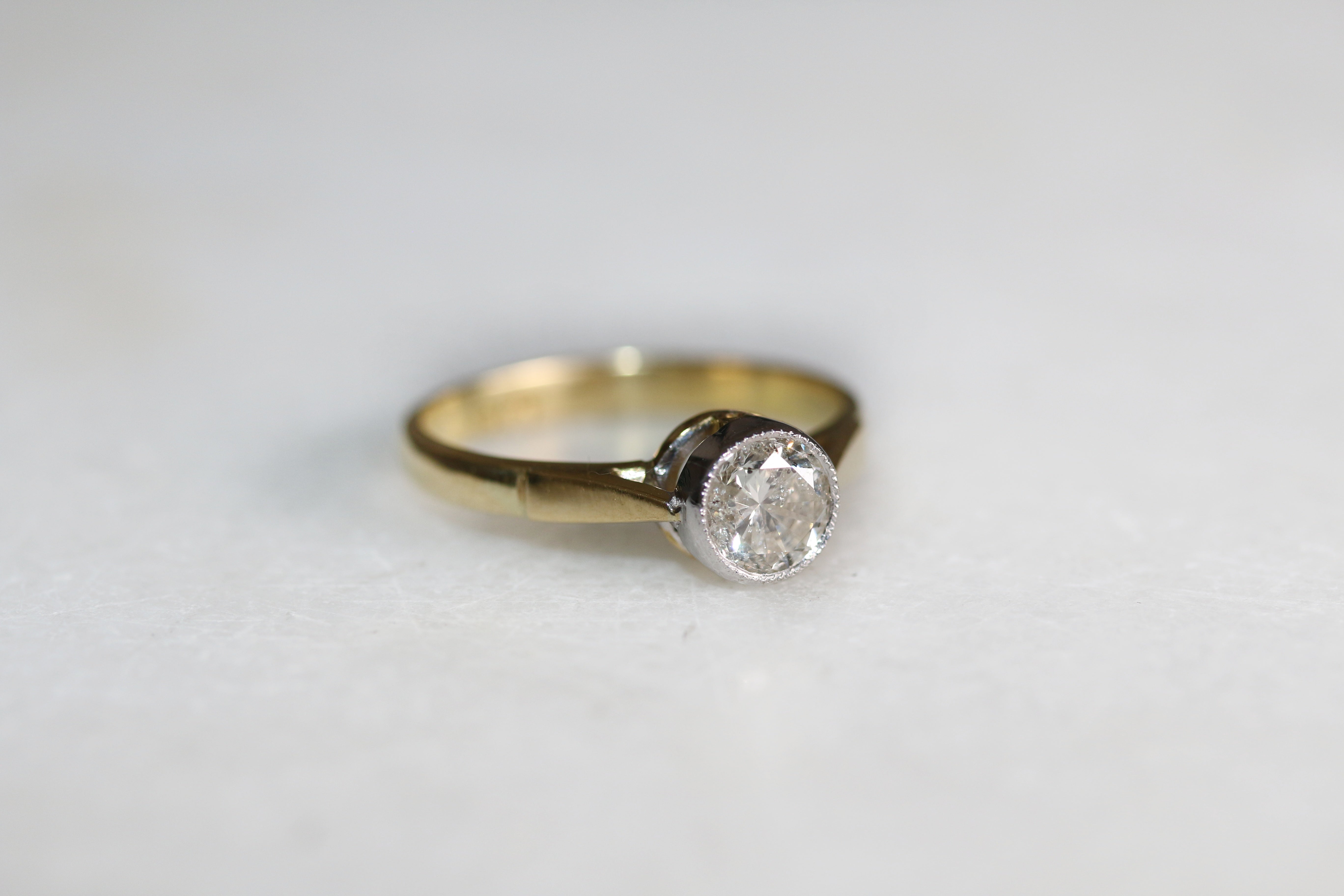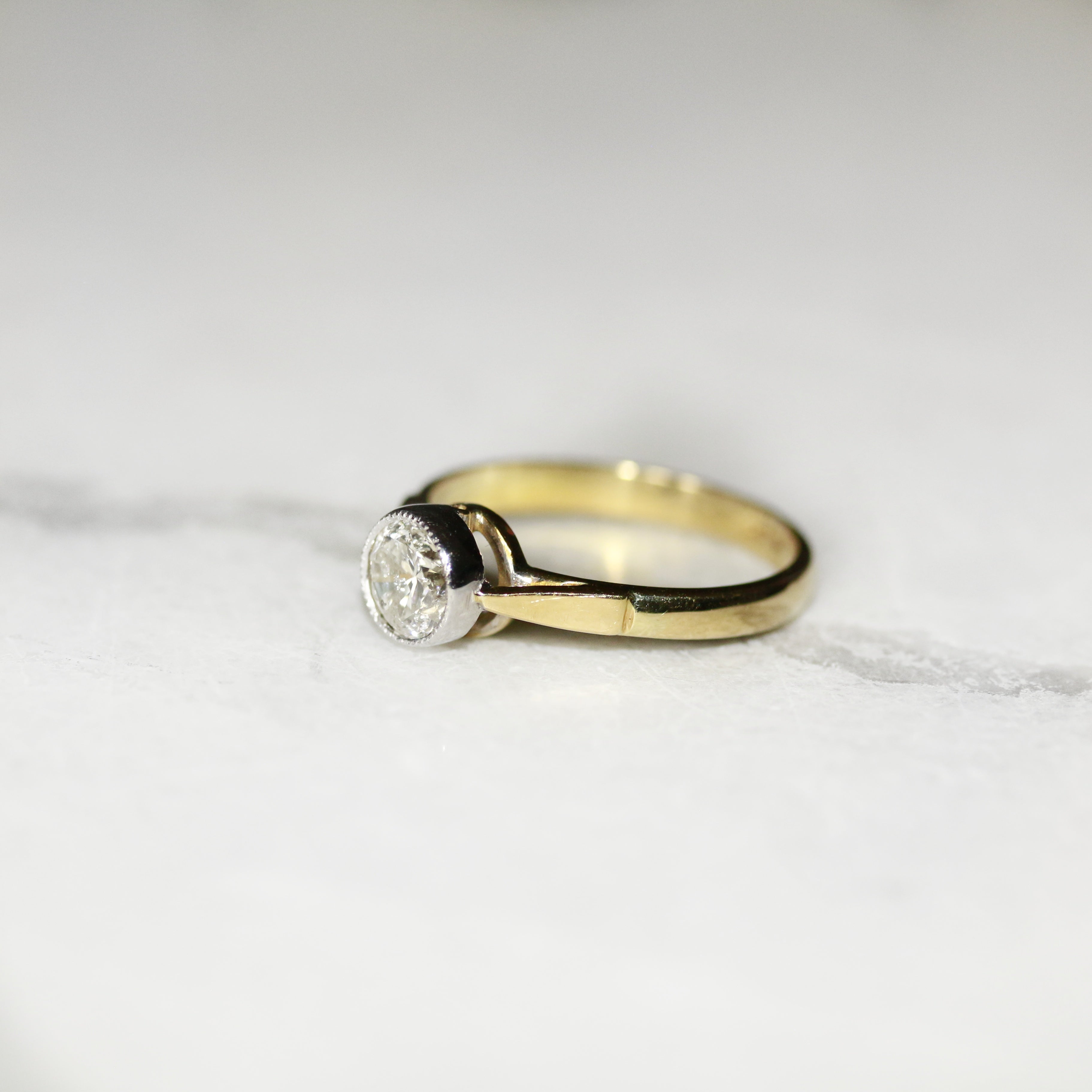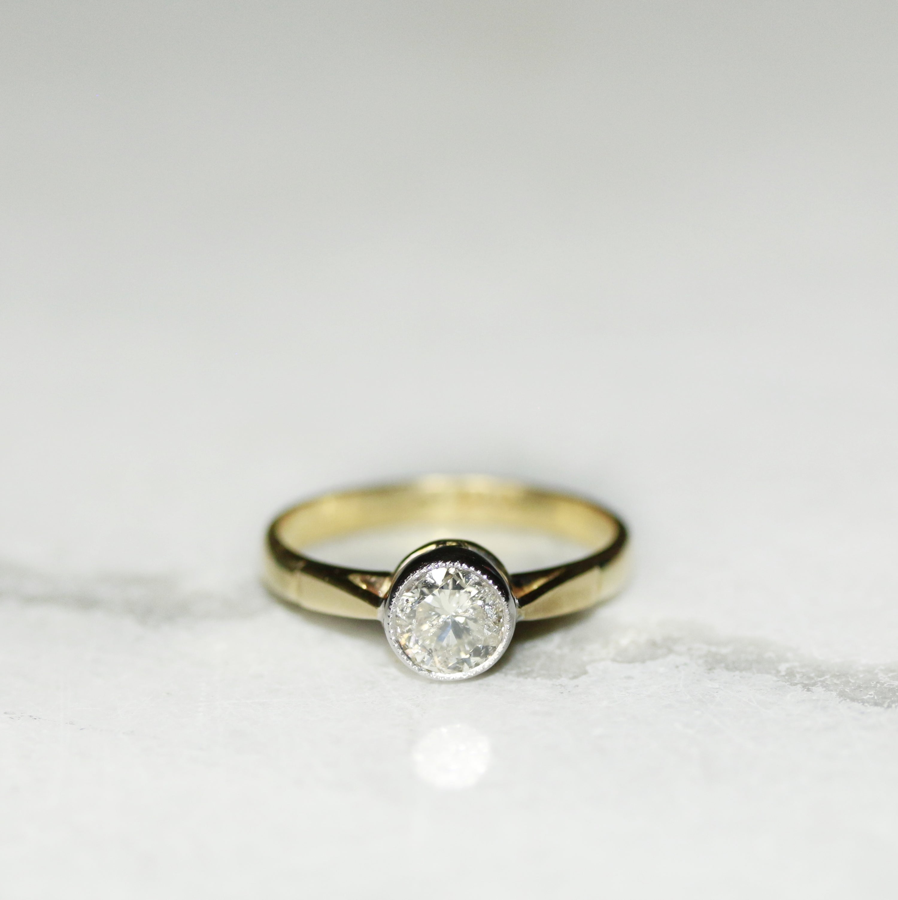 This 18ct yellow gold solitaire ring showcases a 0.75ct round brilliant diamond set securely in a rim setting, combining classic elegance with expert craftsmanship.