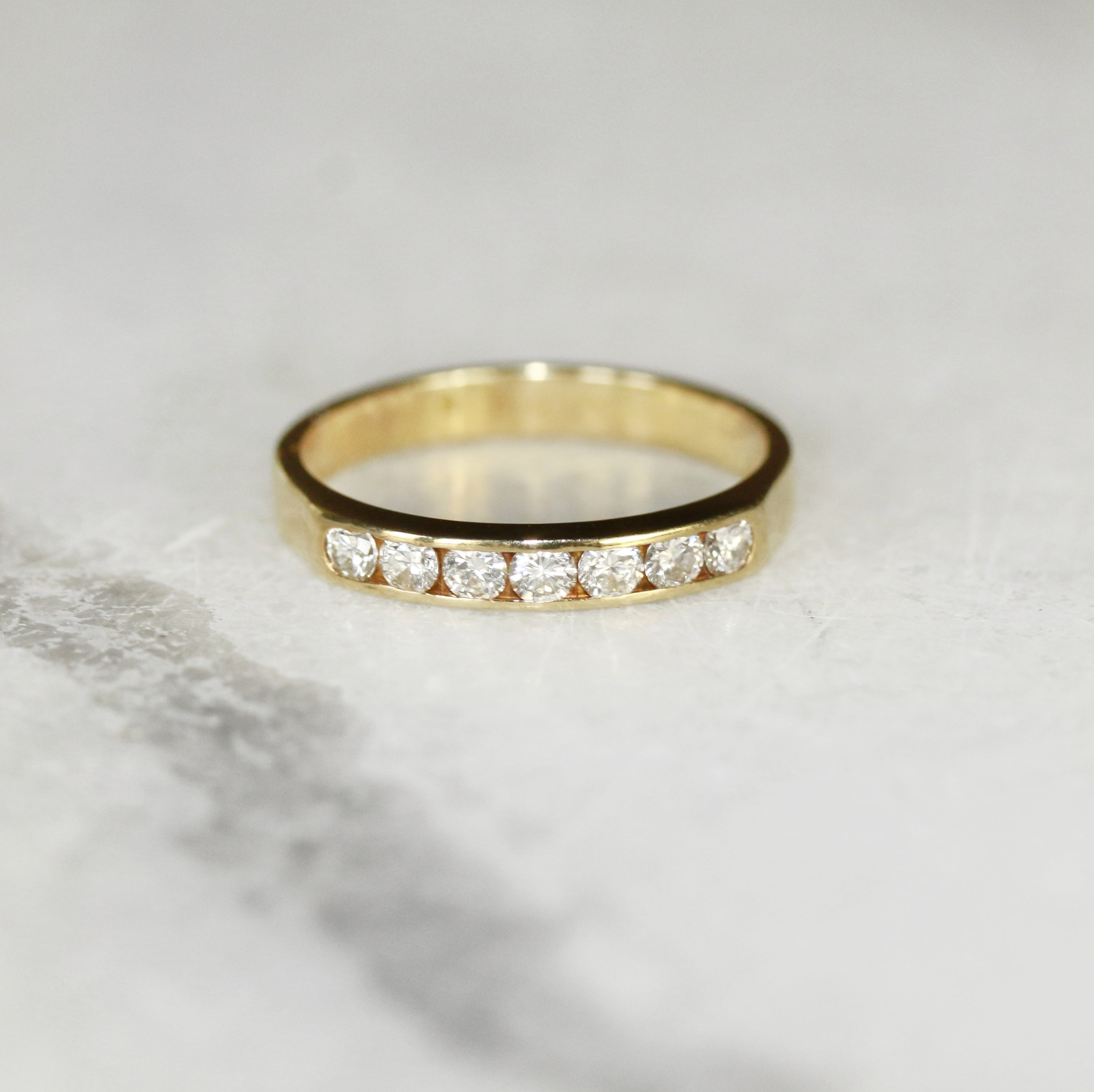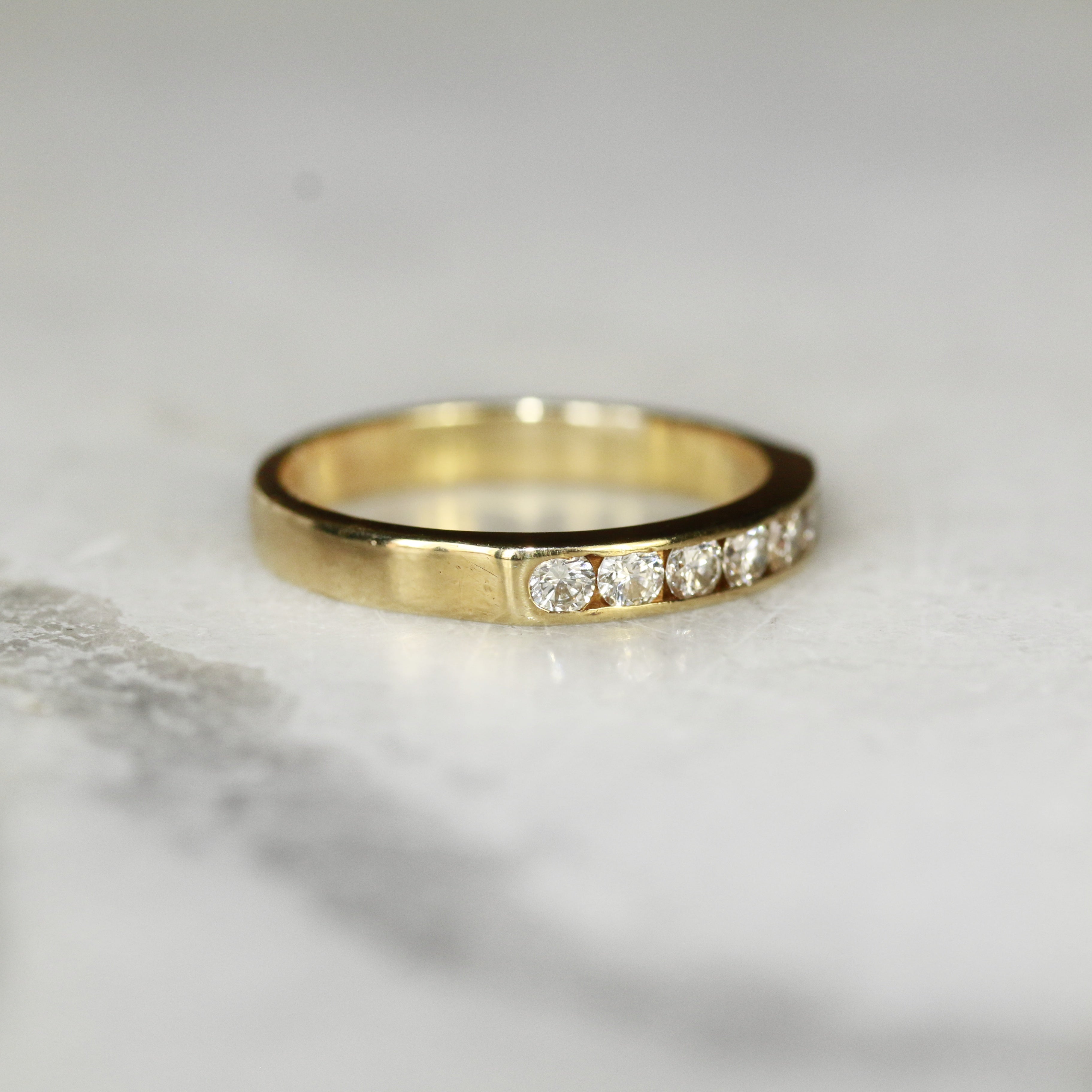 Elegant half eternity design crafted in 14ct yellow gold, this ring features diamonds set in a sleek channel setting that catches light beautifully. Perfect for marking special moments or layering with your engagement ring, it combines timeless sophistication with everyday wearability. A versatile piece that celebrates your style with understated luxury.