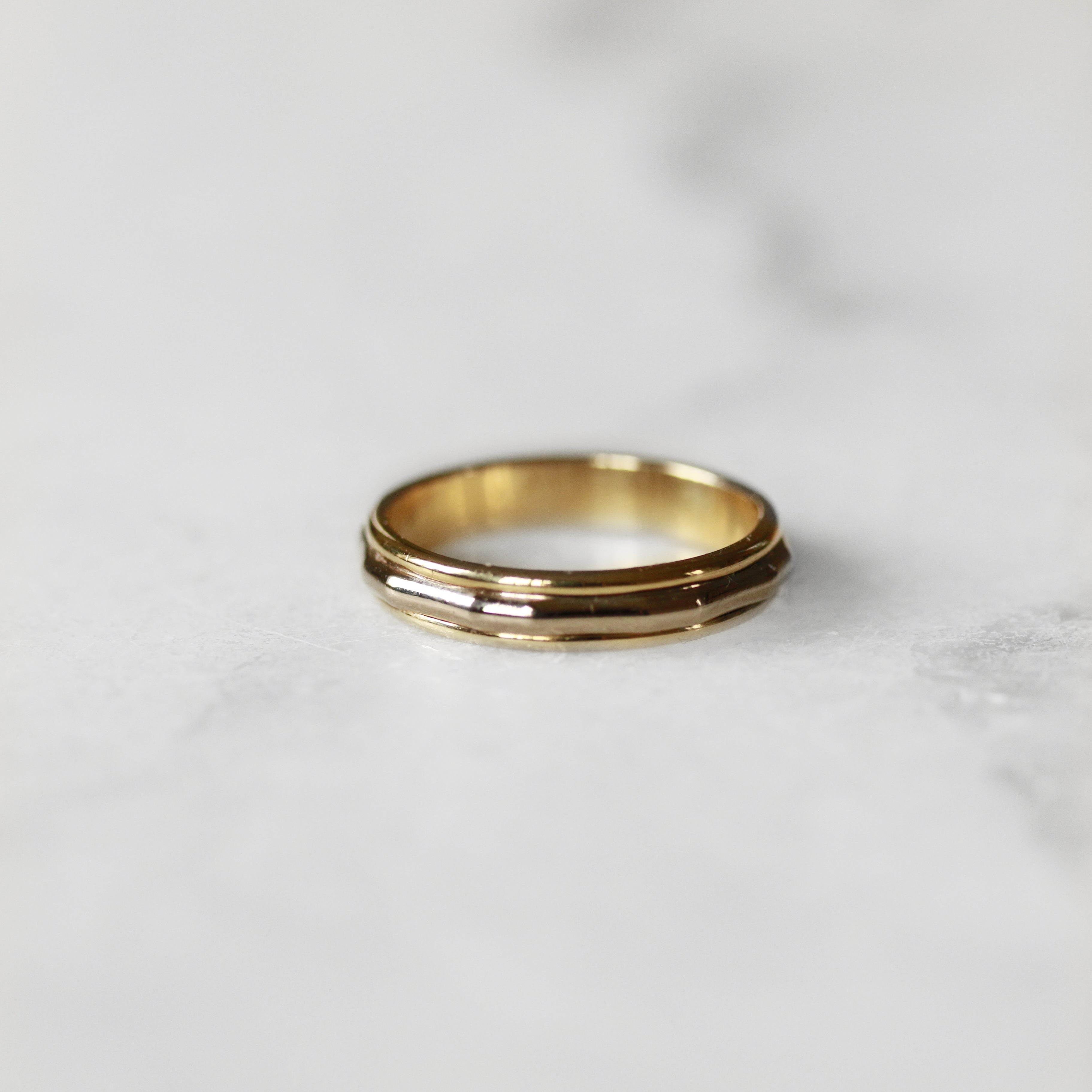 An 18ct two-tone gold wedding band combining warm yellow gold with a distinctive ridged white gold accent. The contrasting metals create elegant visual interest while the timeless design suits any style. Perfect for everyday wear or as a meaningful complement to an engagement ring.