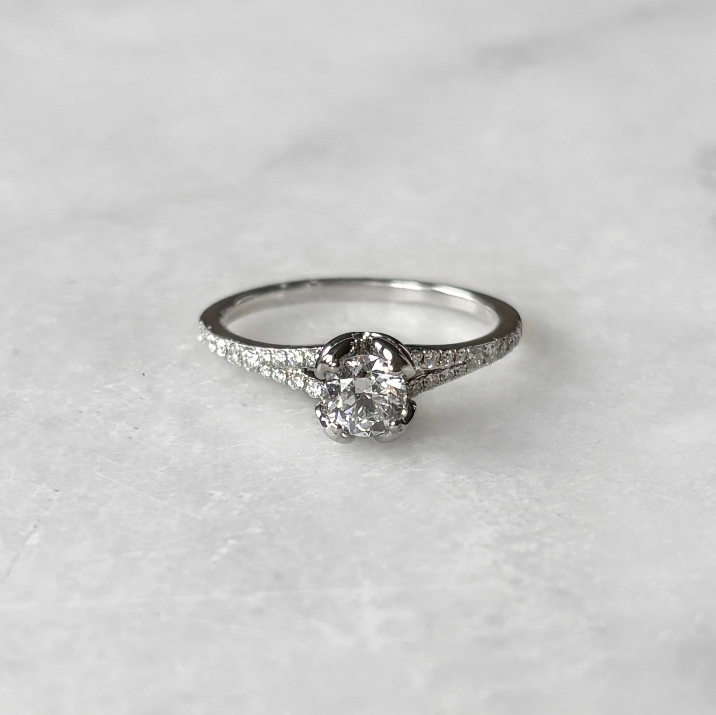 This elegant 18ct white gold solitaire ring features a stunning 0.50ct diamond centre stone in D colour with SI clarity, expertly set in a sophisticated tulip-style setting. The split shoulders are adorned with complementary diamonds, adding brilliance and dimension to this timeless design.