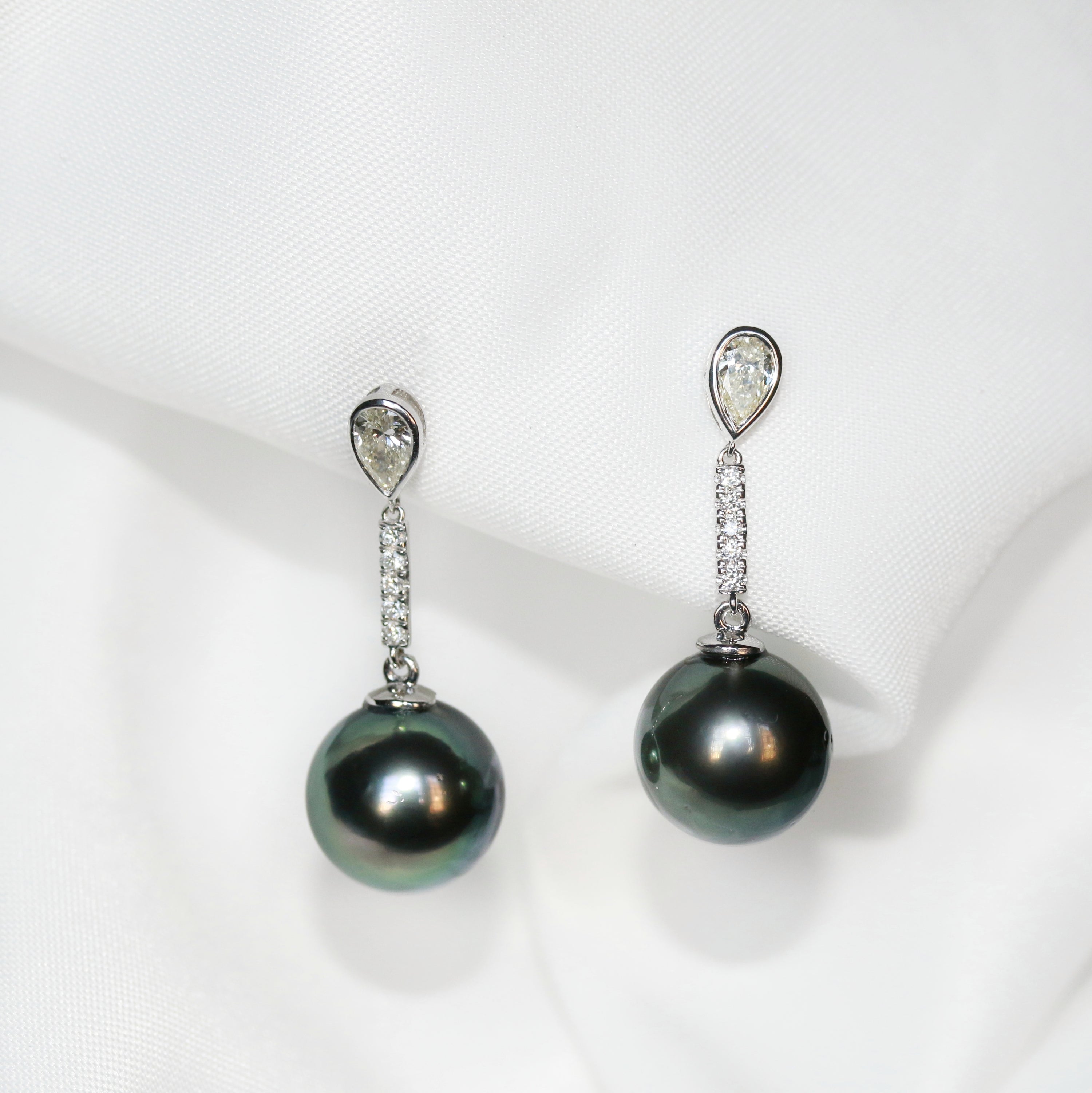 Elevate your jewellery collection with these exquisite drop earrings, where lustrous Tahitian pearls meet the timeless elegance of 18ct white gold. Each earring features a stunning pear-cut diamond, totalling 0.62cts, expertly set in a secure bezel setting that showcases the stone's brilliance. The sophisticated combination of precious metals and gemstones creates an understated yet captivating piece perfect for both special occasions.