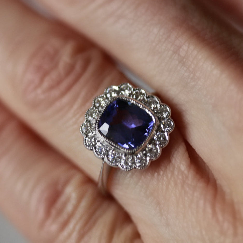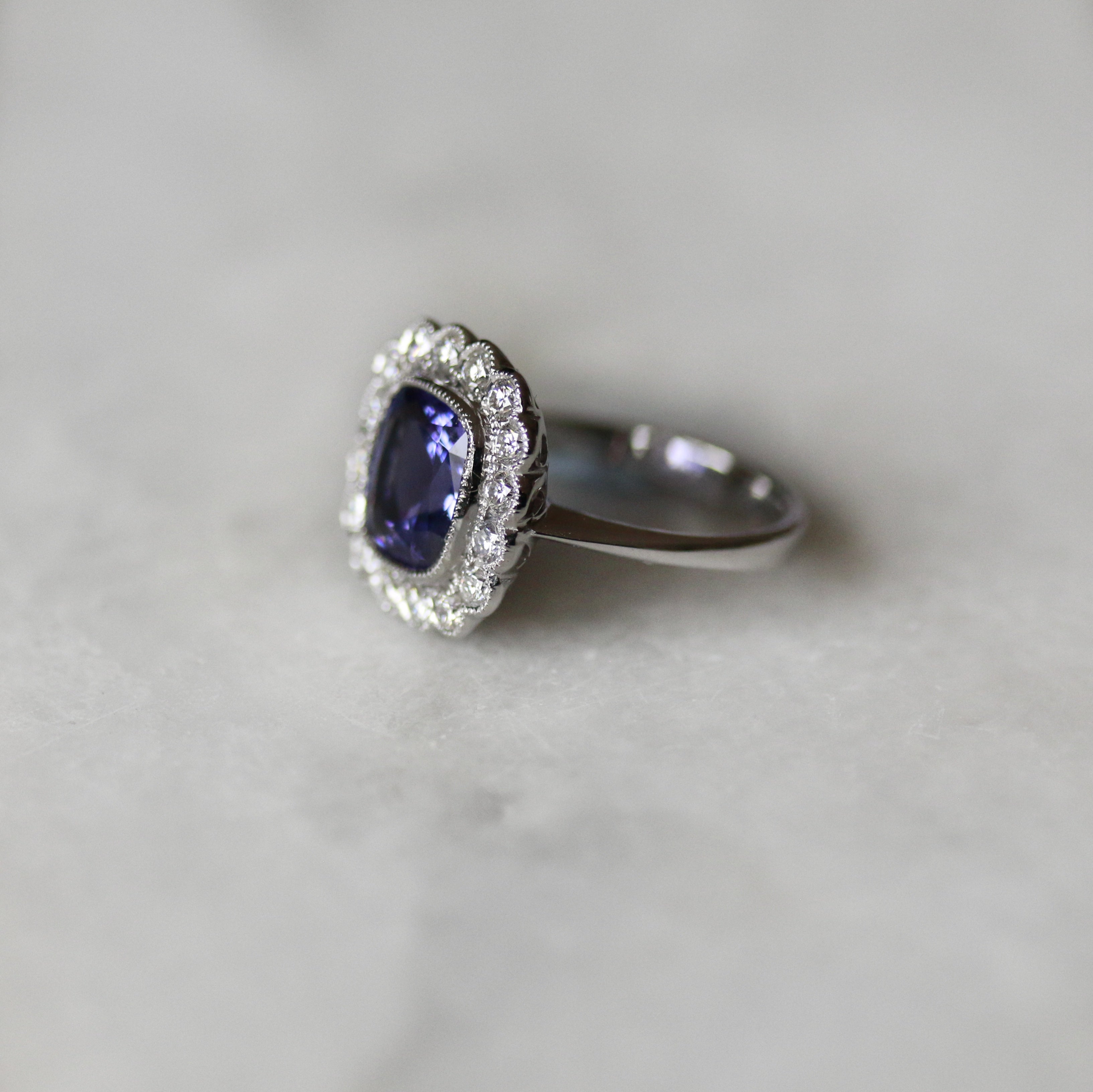 This elegant ring showcases a stunning cushion-cut tanzanite as its focal point, gracefully encircled by sparkling round brilliant diamonds set in 18ct white gold. A sophisticated design that combines the deep allure of tanzanite with the timeless brilliance of diamonds, creating a distinctive piece perfect for those seeking refined luxury and distinctive colour.