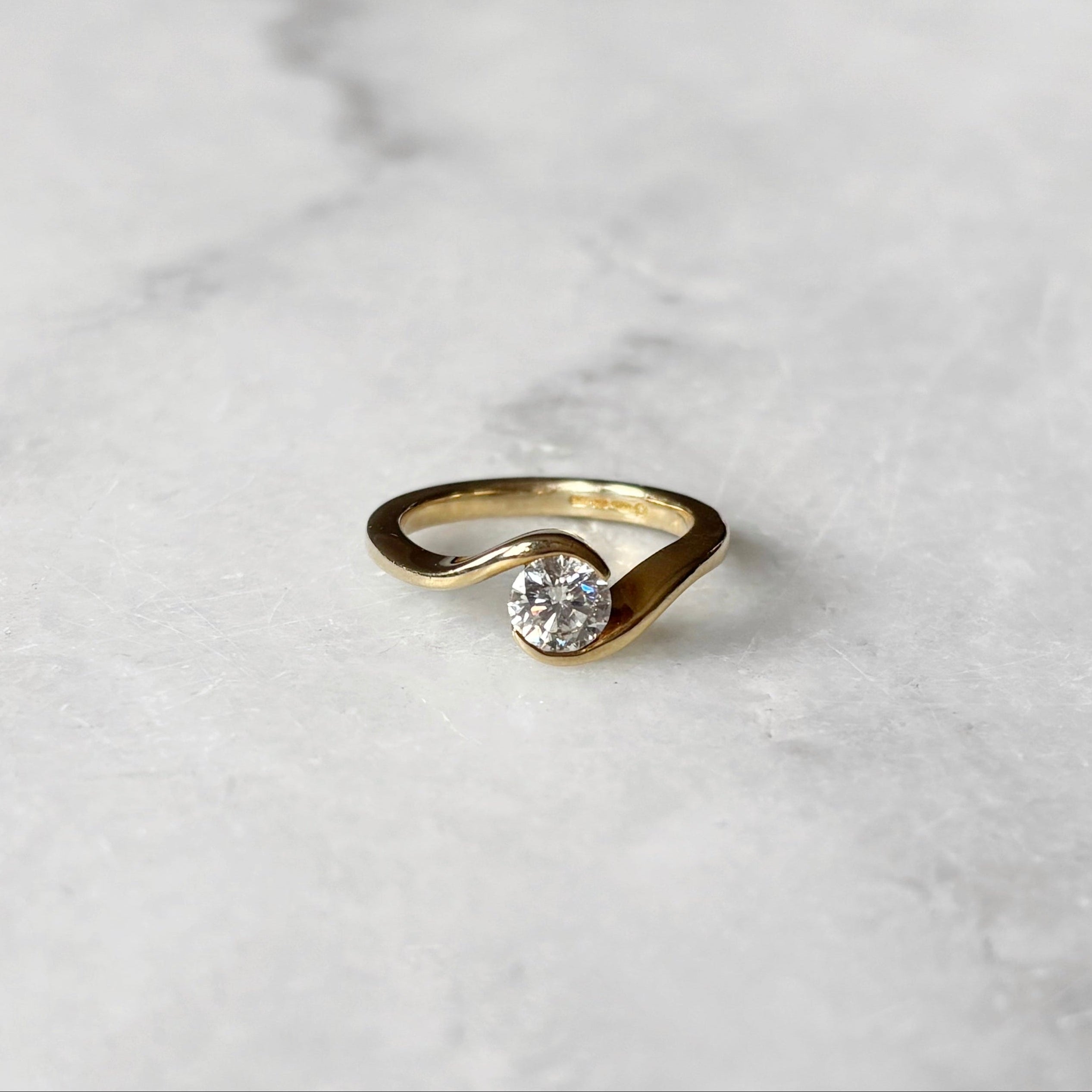 An elegant 18ct yellow gold solitaire ring showcasing a 0.55ct round brilliant cut diamond in a sophisticated crossover rim setting. This timeless piece combines classic design with quality craftsmanship, featuring a G/H colour diamond with VS2/SI1 clarity. The crossover band adds contemporary flair to the traditional solitaire style, making it perfect for engagements or as a cherished everyday ring.