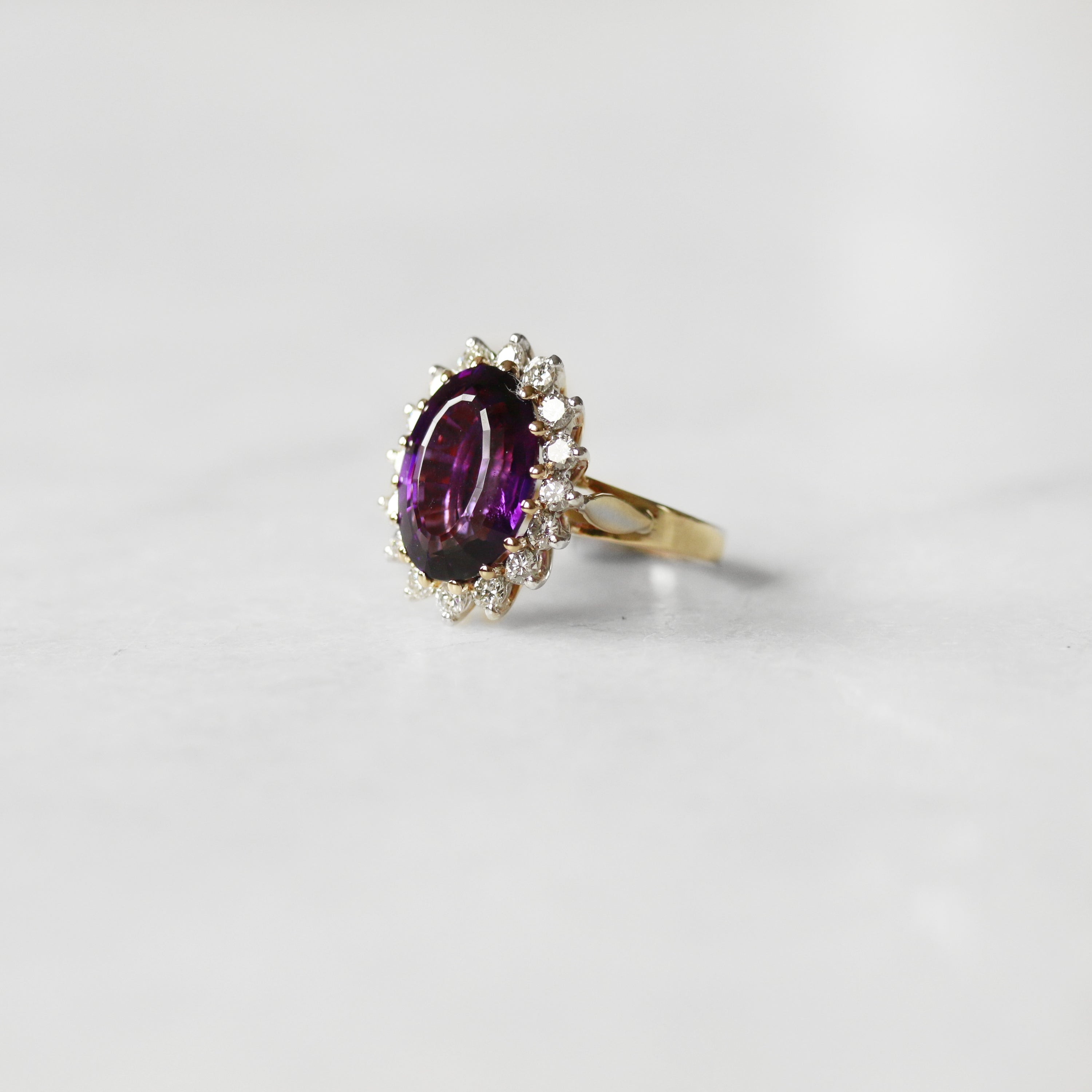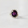 A stunning statement piece featuring a generous oval amethyst stone set in luxurious 18ct yellow gold, surrounded by a sparkling diamond cluster. The rich purple hue of the amethyst is beautifully complemented by the brilliance of the diamonds, creating an elegant and eye-catching design.