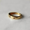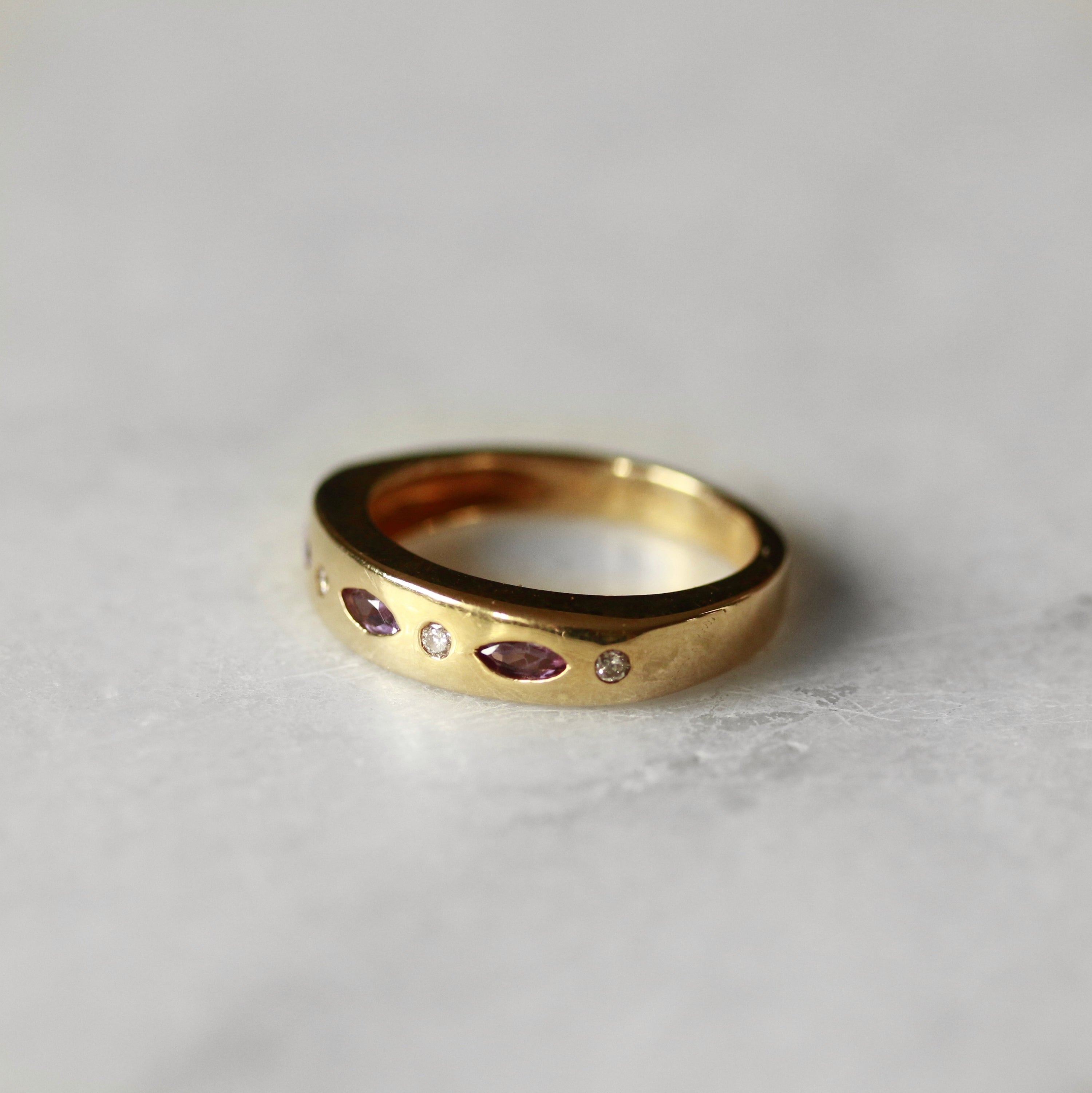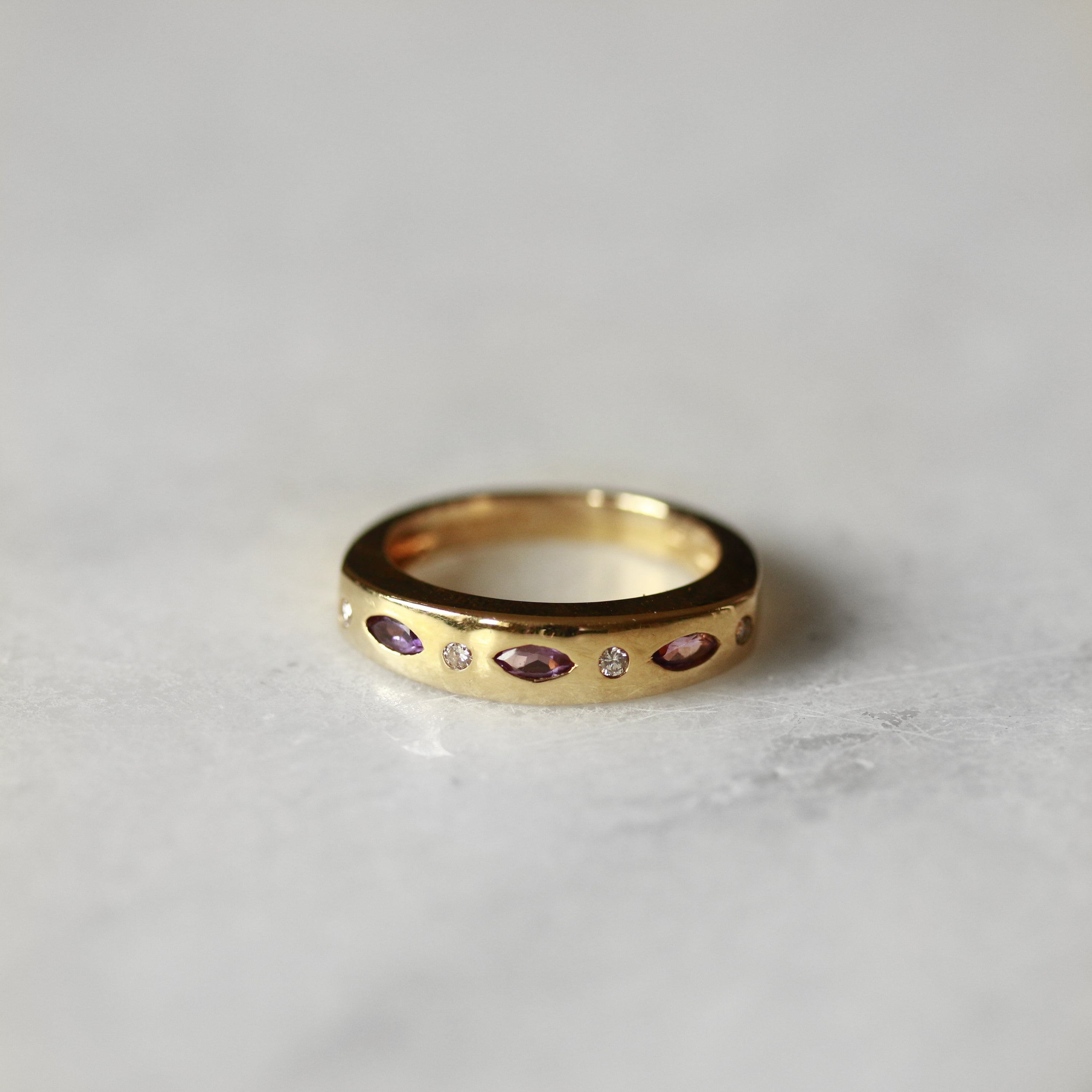 Elevate your jewellery collection with this stunning 18ct yellow gold dress ring. The horizontally positioned marquise cut amethyst are complemented by sparkling round brilliant cut diamonds.