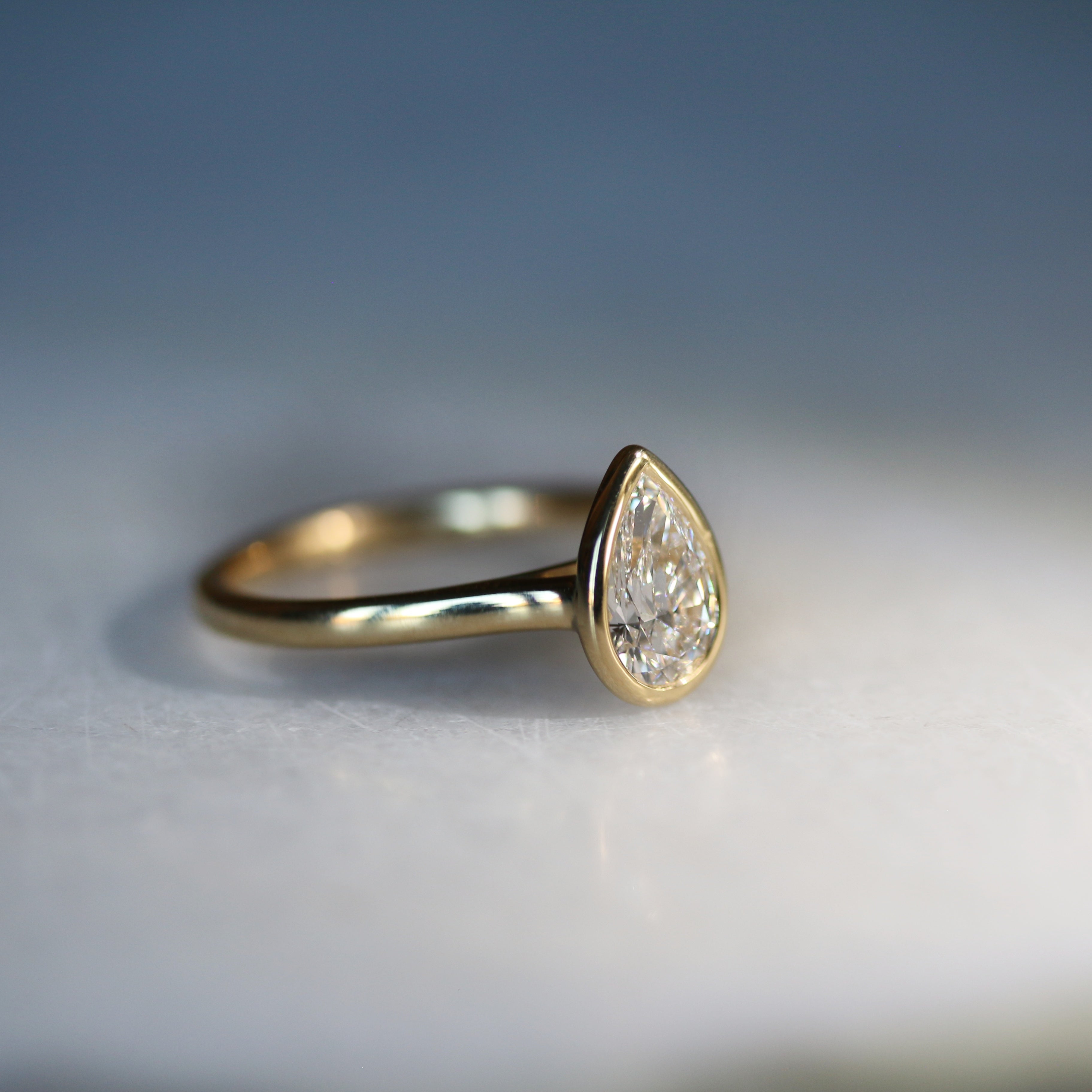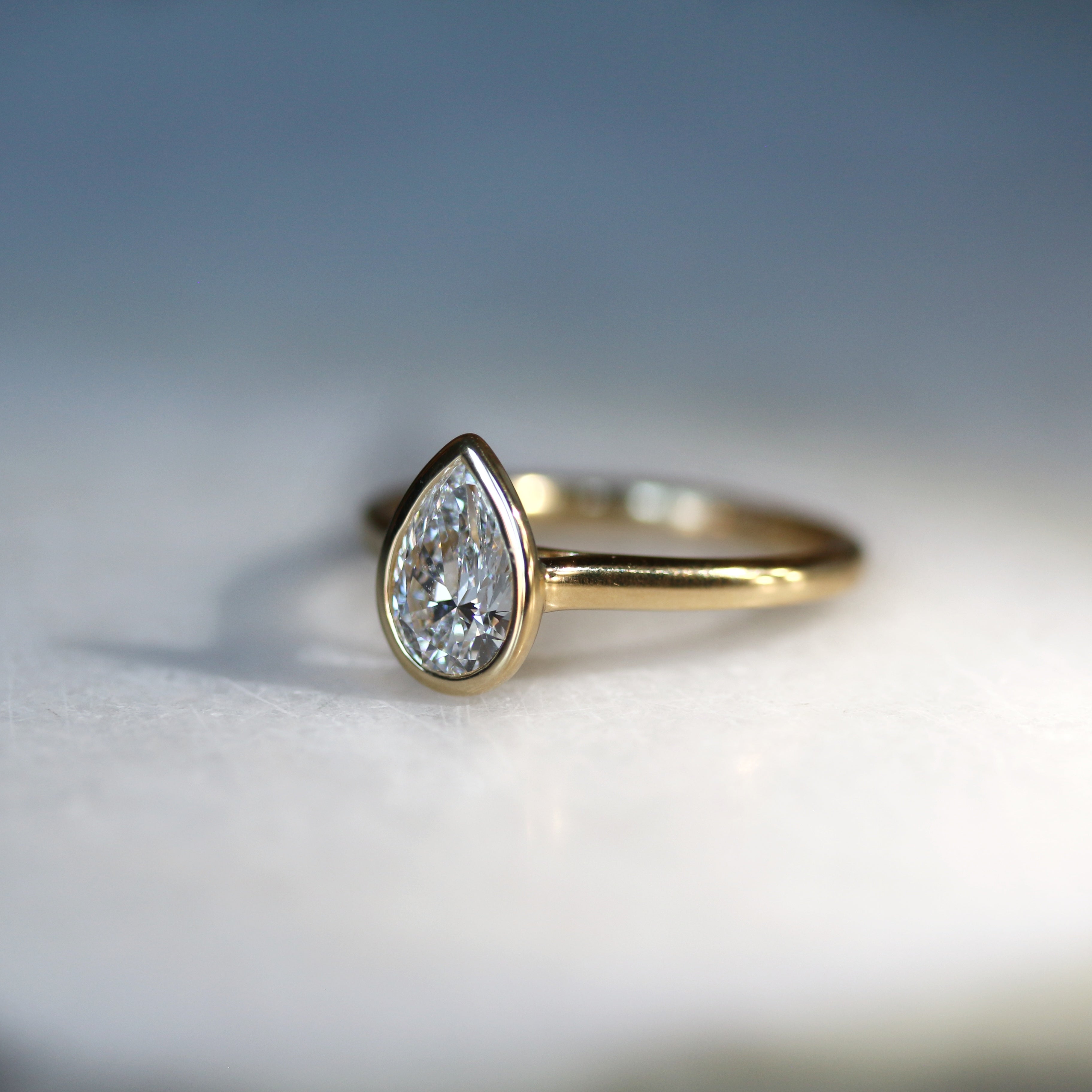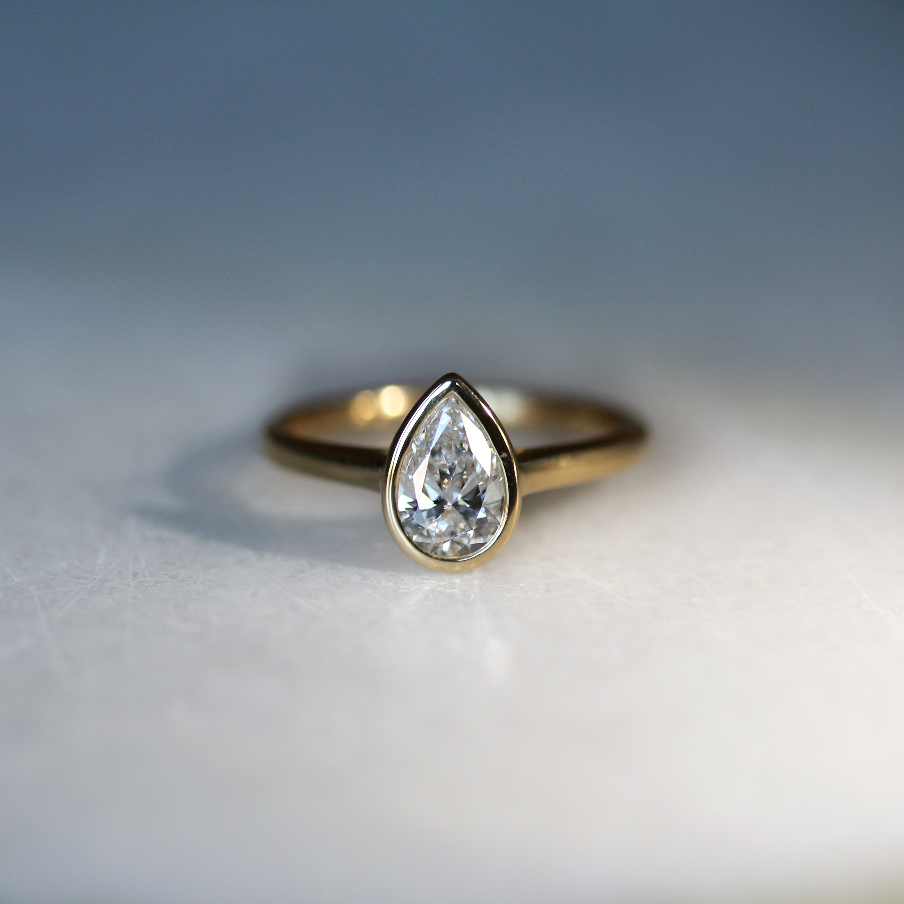 Home/Best Selling Products/18ct Yellow Gold Bezel Set 0.80ct Pear Cut Solitaire