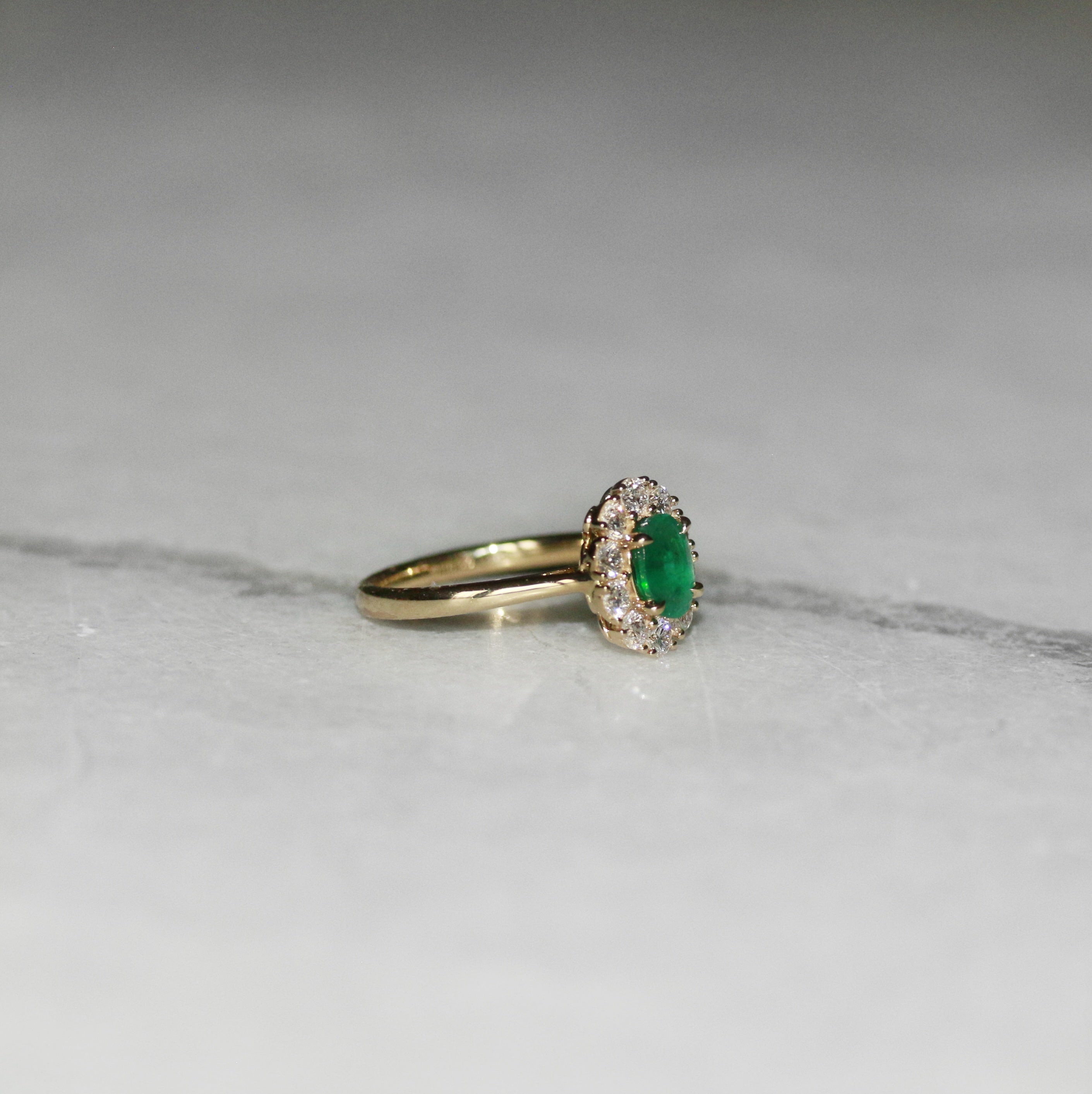 An 18ct yellow gold emerald and diamond cluster ring featuring a central 0.47ct oval cut emerald surrounded by a halo of round brilliant cut diamonds totalling 0.34cts.