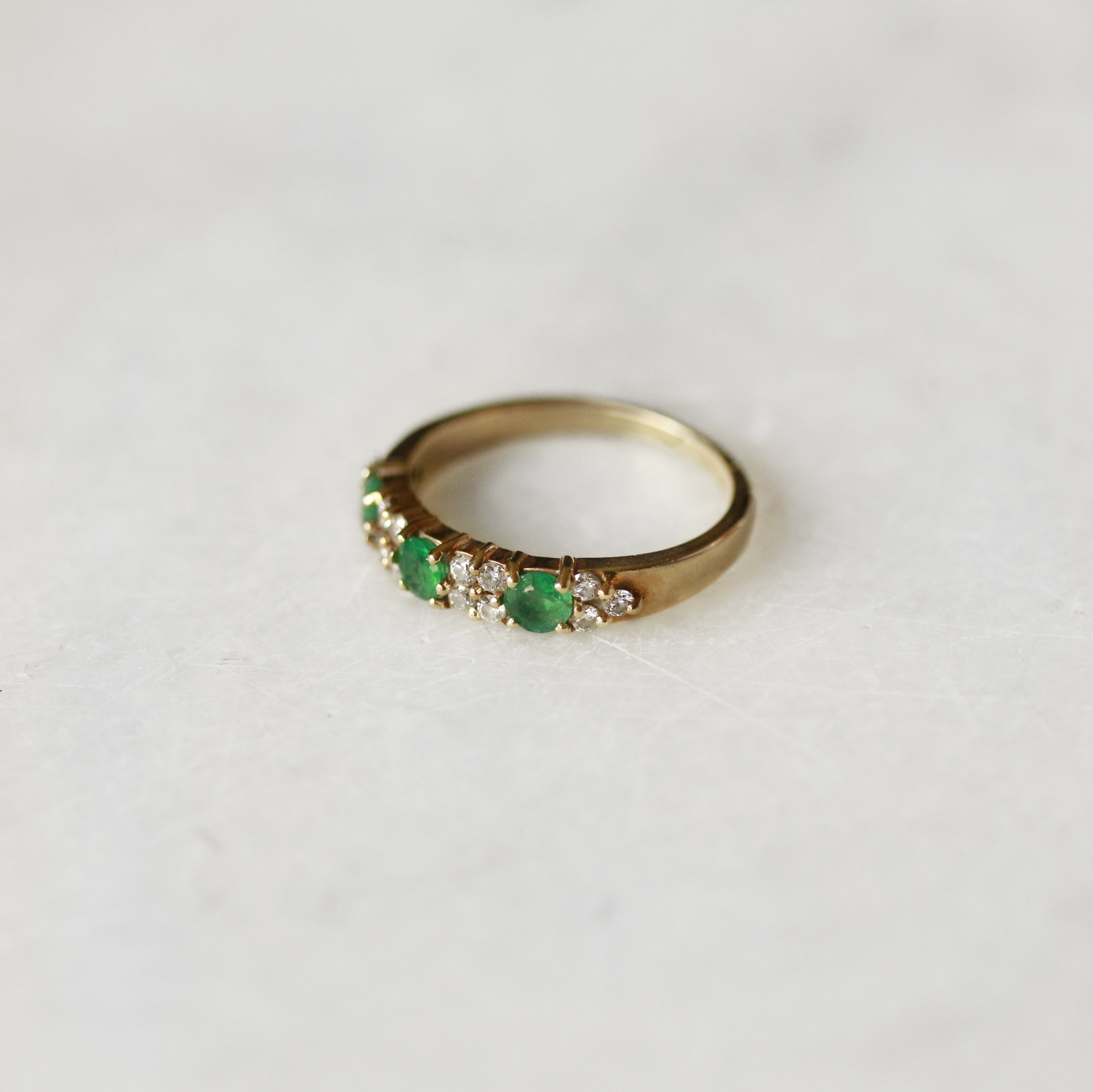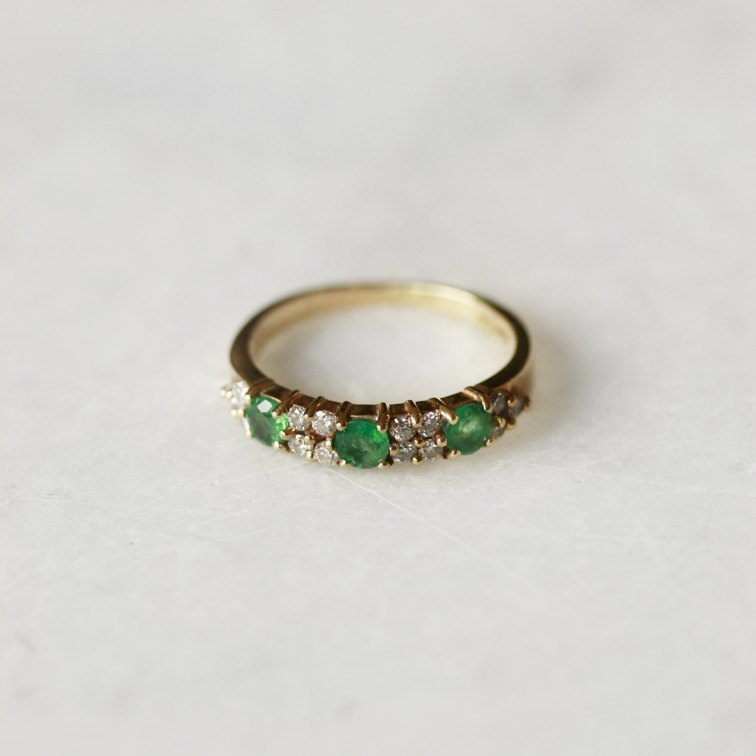 Crafted in 18ct yellow gold, this elegant dress ring showcases a captivating interplay of vibrant emeralds and sparkling diamond clusters arranged in a harmonious alternating design. Each round brilliant-cut emerald is complemented by delicate diamond accents. Perfect for those seeking timeless elegance with a touch of colour.