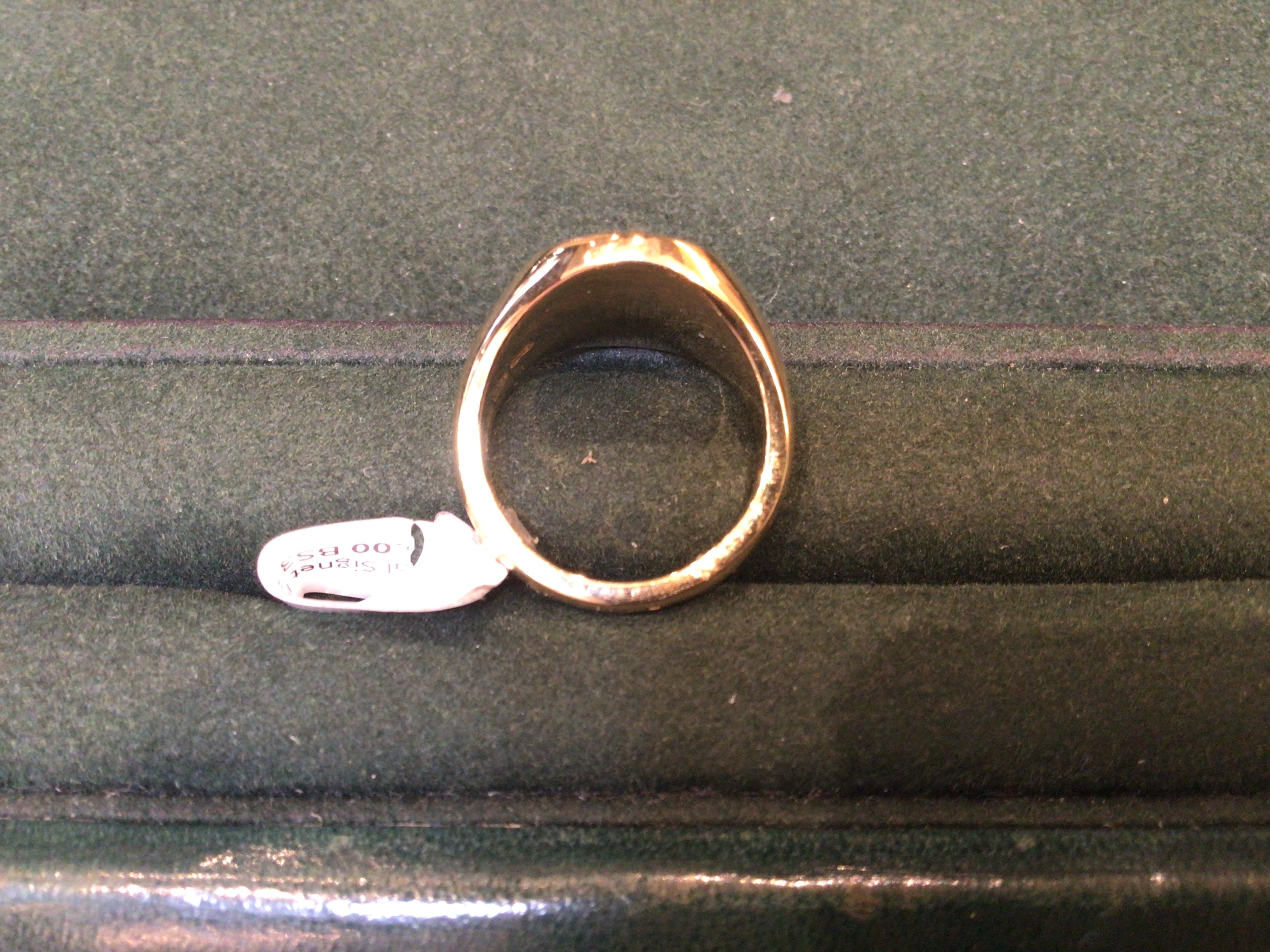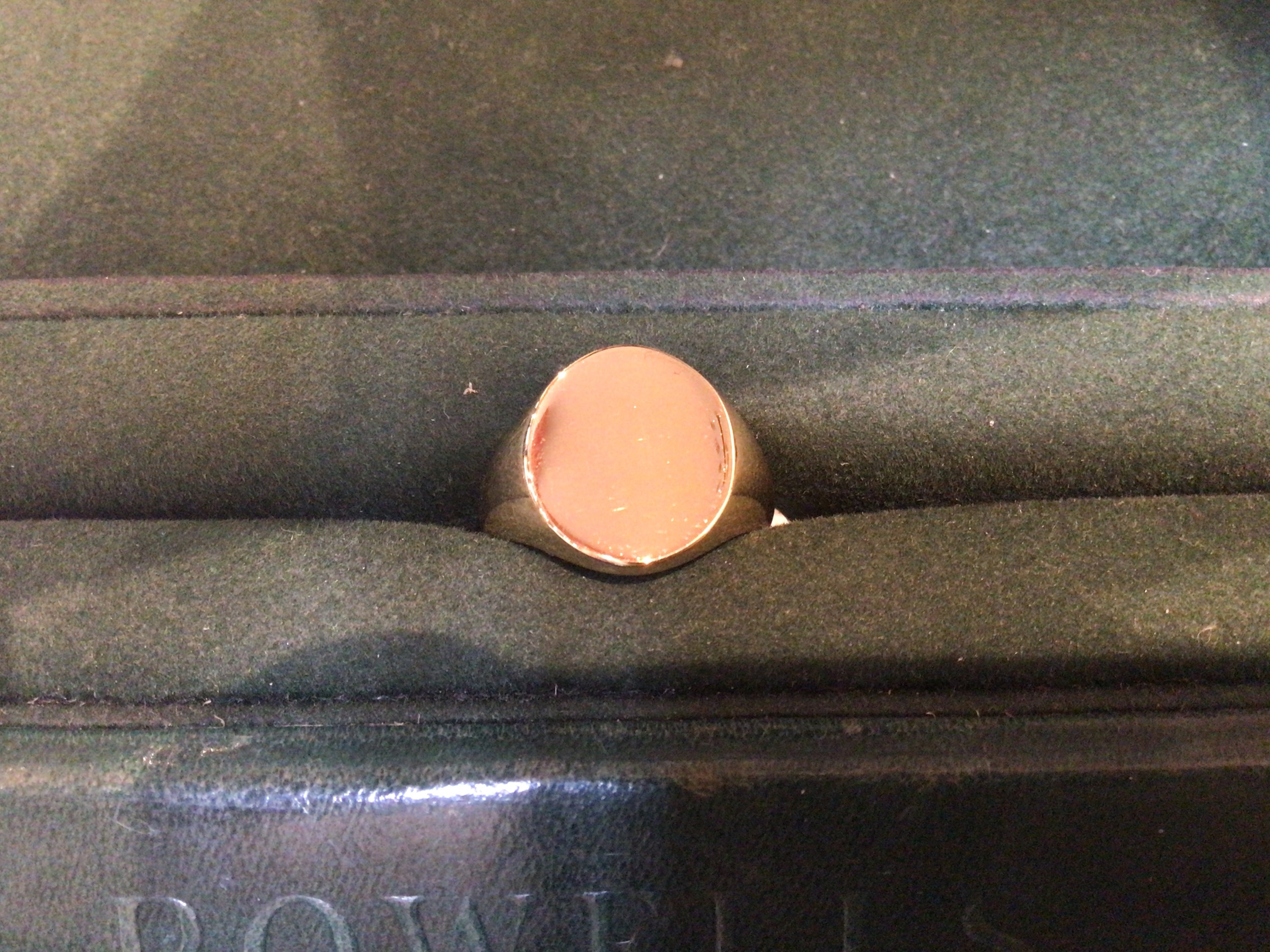 An 18ct yellow gold oval shaped signet ring by Deakin & Francis.