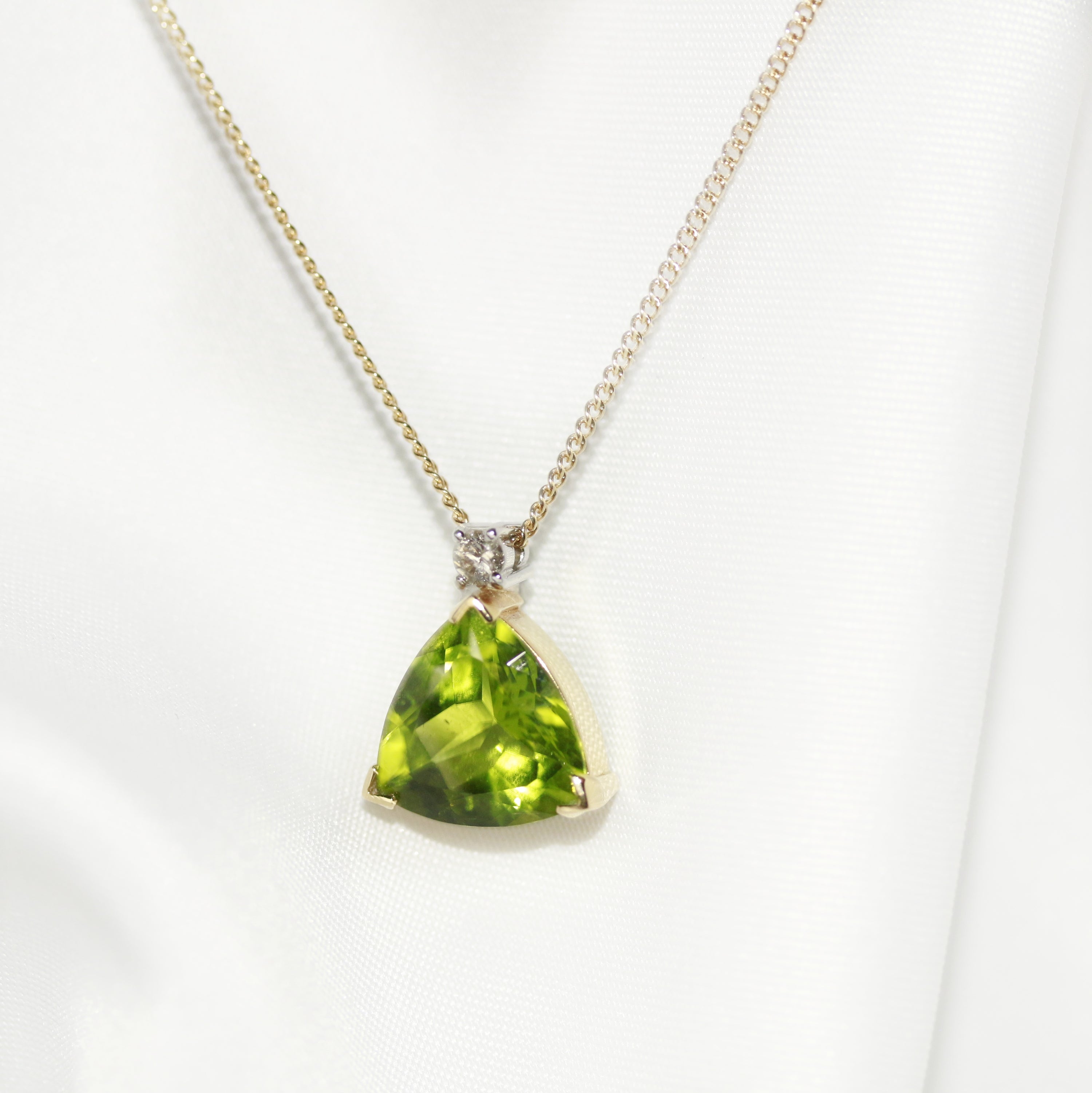 This exquisite 18ct yellow gold pendant is adorned with a stunning fancy cut peridot and a sparkling diamond. Experience the luxurious combination of golden hues, emerald green and a dazzling diamond.