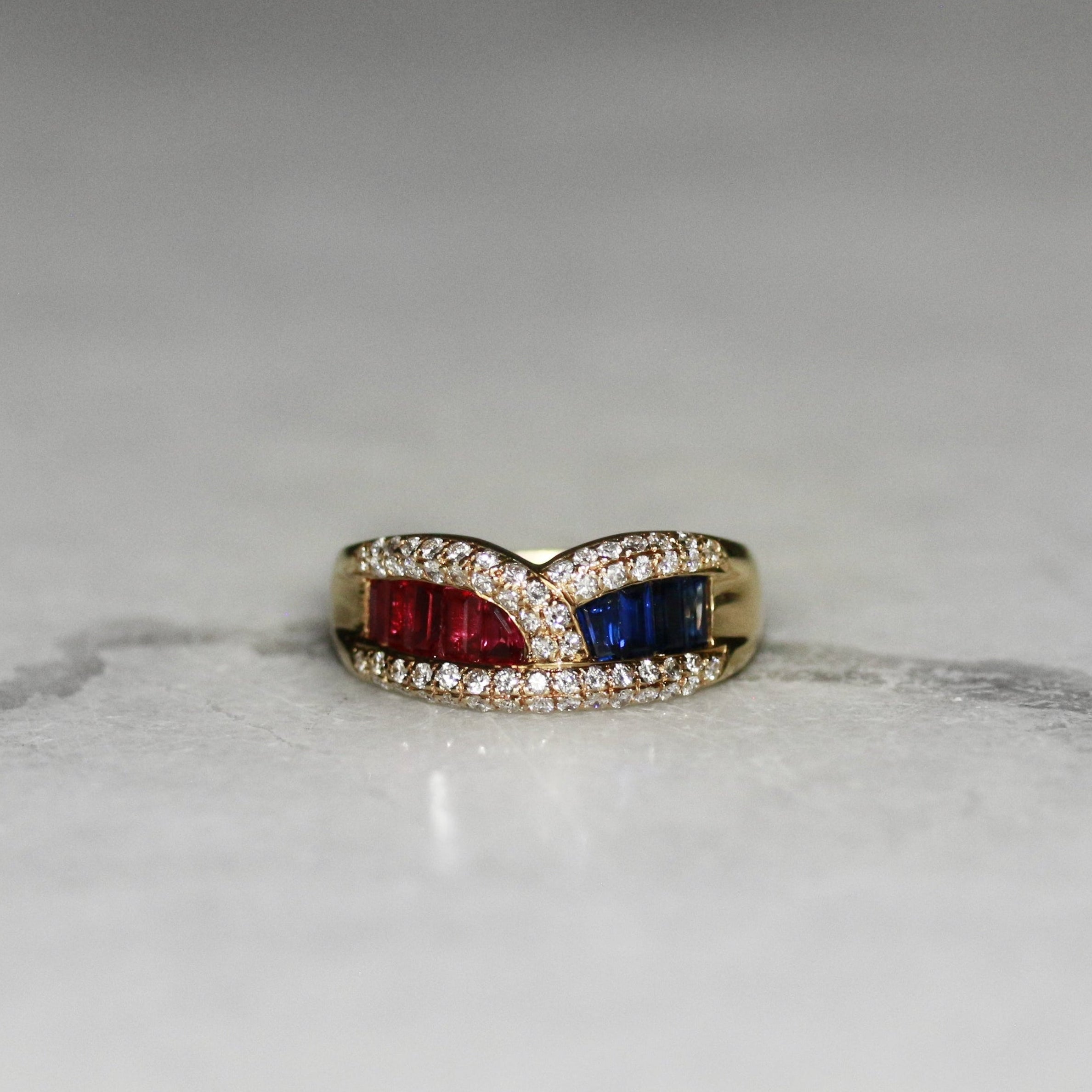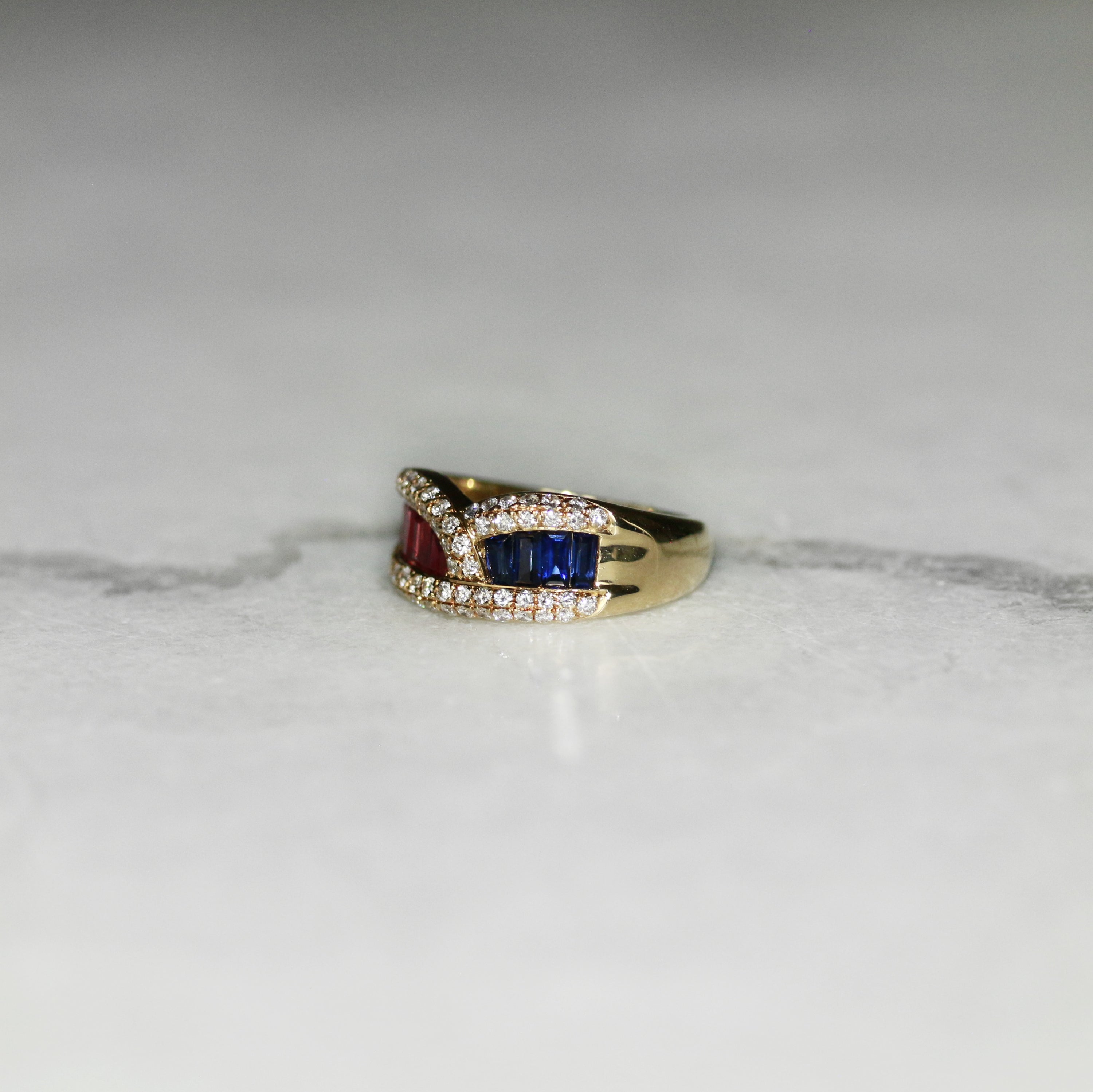 This elegant dress ring combines the warmth of 18ct yellow gold with a vibrant gemstone palette. Featuring 0.98 carats of ruby and 0.67cts of sapphire, the design is enhanced by pavé-set diamonds totalling 0.42cts that frame the coloured stones with precision. An accomplished piece for the discerning wearer.