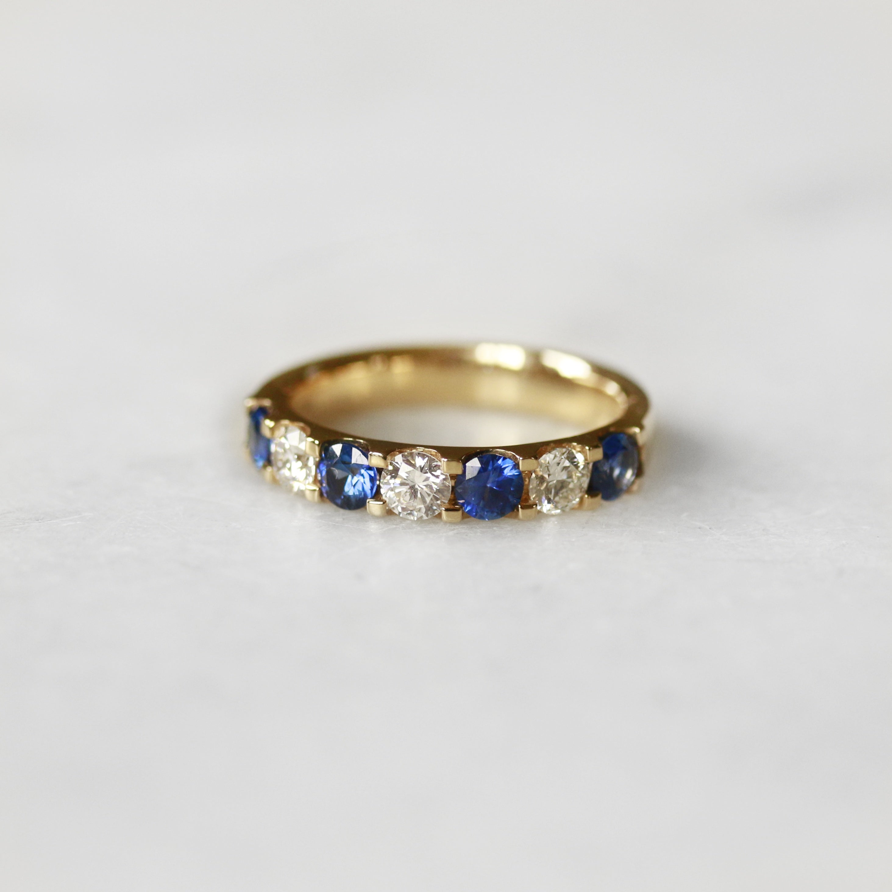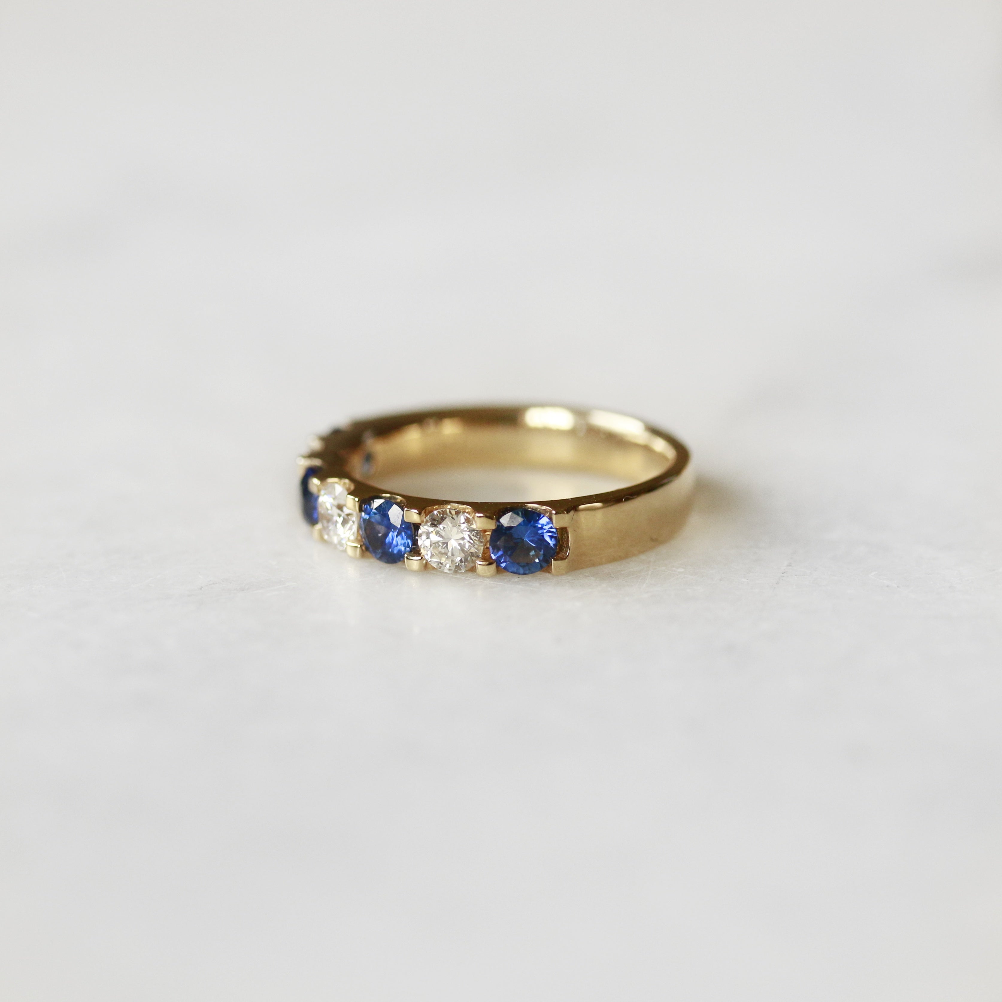 A stunning half eternity ring crafted in 18ct yellow gold, featuring alternating sapphires and diamonds set in secure claw settings. The rich blue sapphires (0.86ct total) are complemented by sparkling diamonds (0.55ct total), creating a timeless design perfect for everyday elegance or as a meaningful gift. The classic yellow gold band ensures this piece will remain a cherished favourite for years to come.