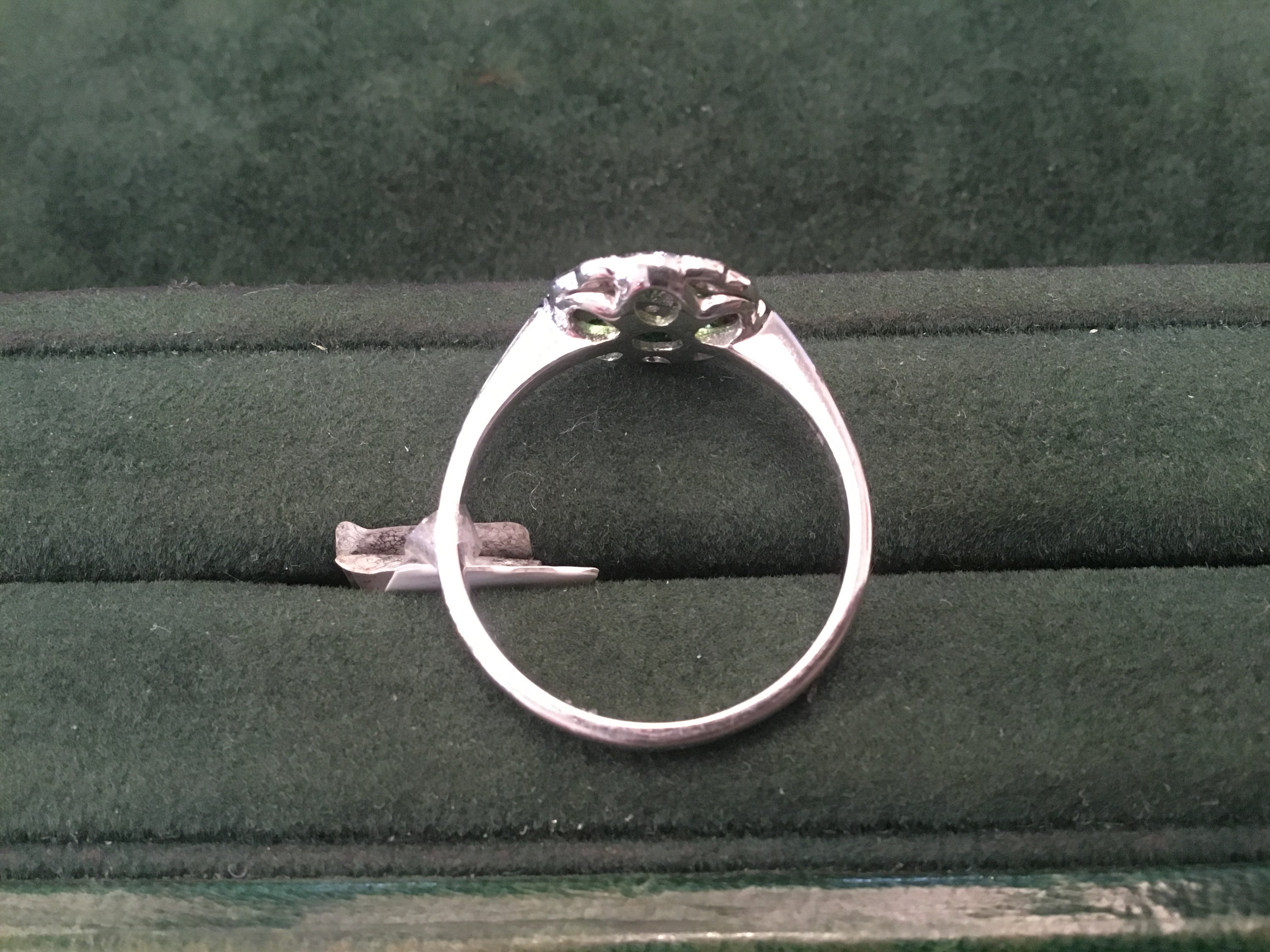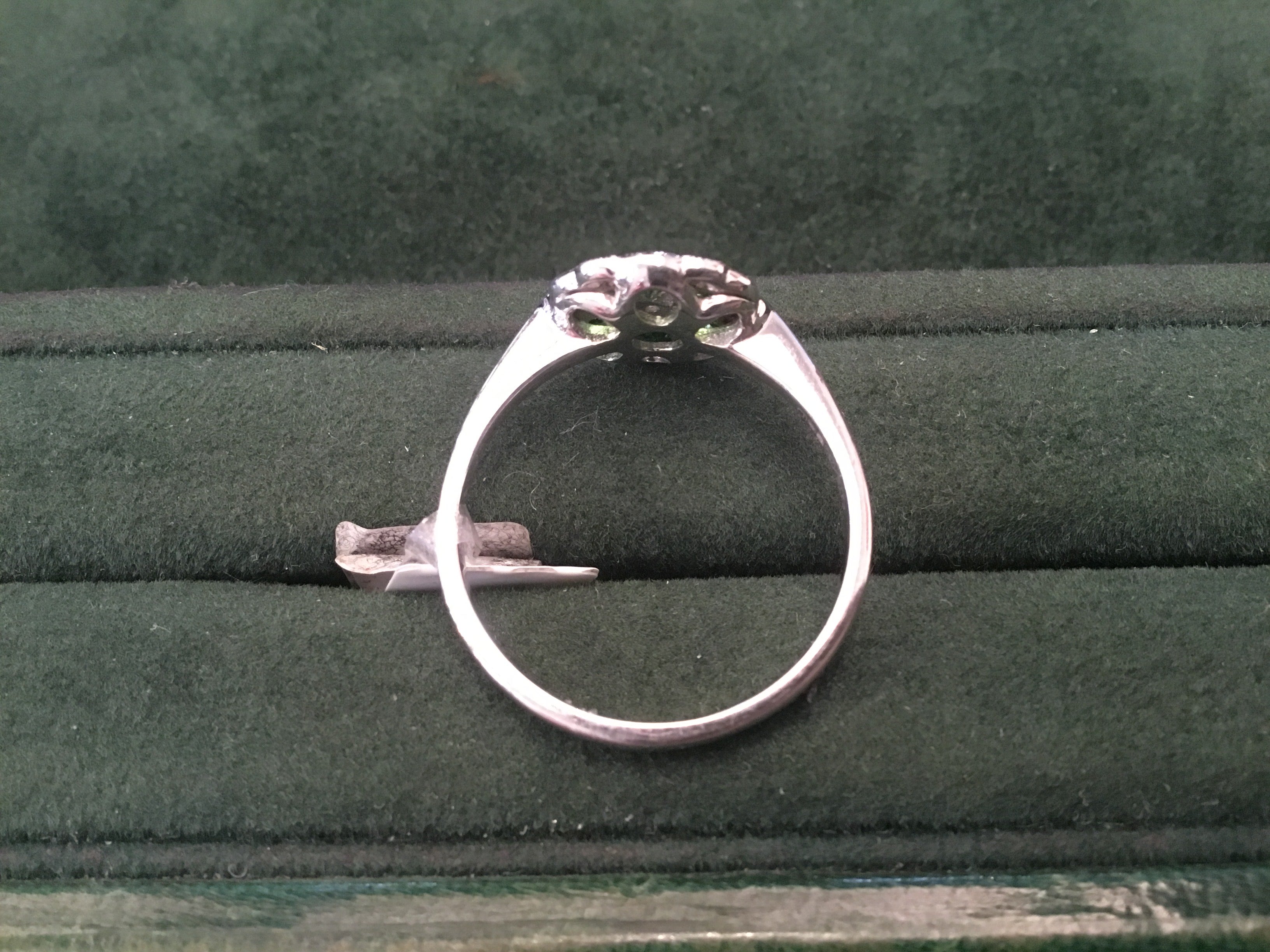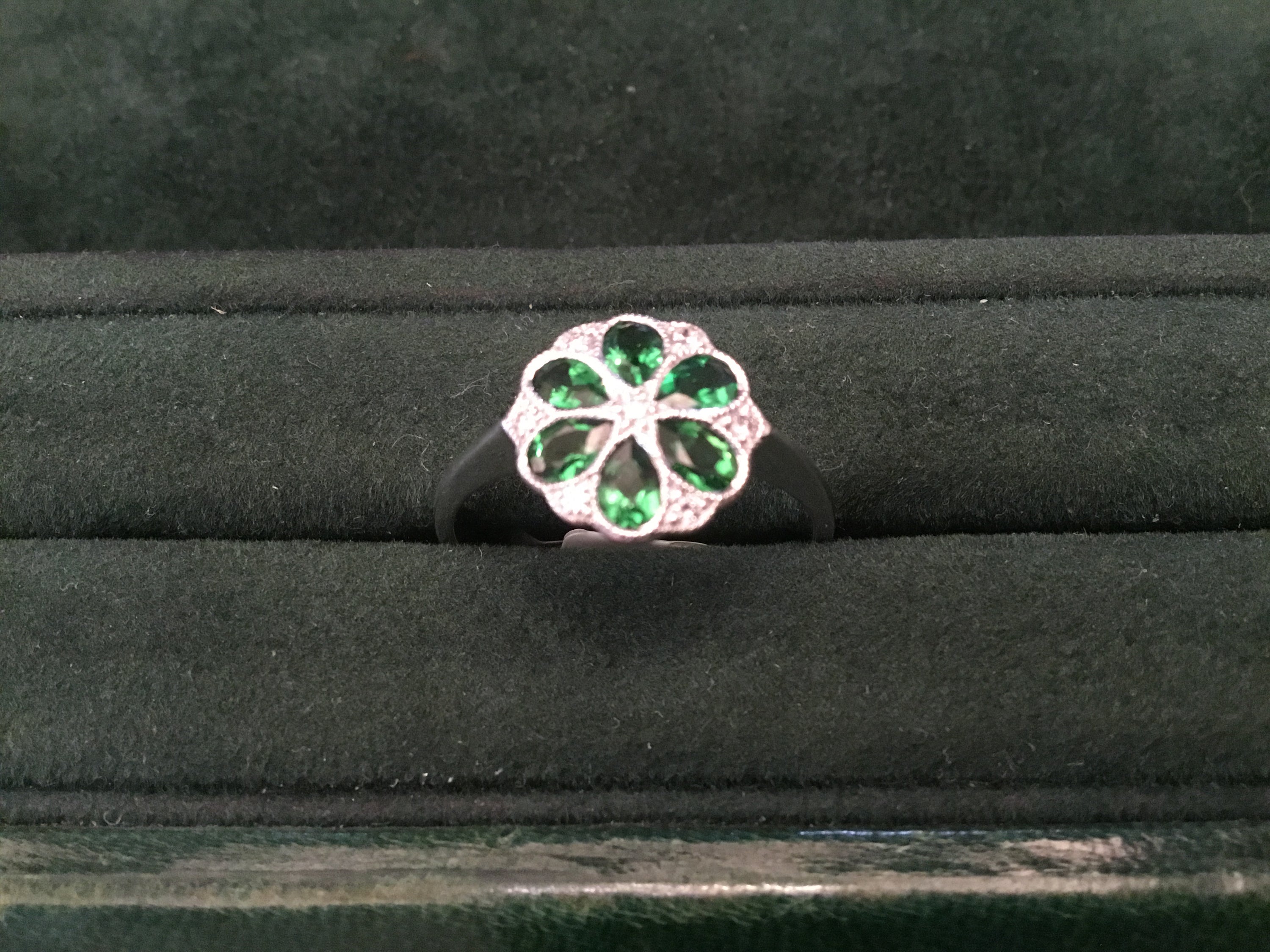 An 18ct white gold dress ring featuring a floral formation of green garnets.