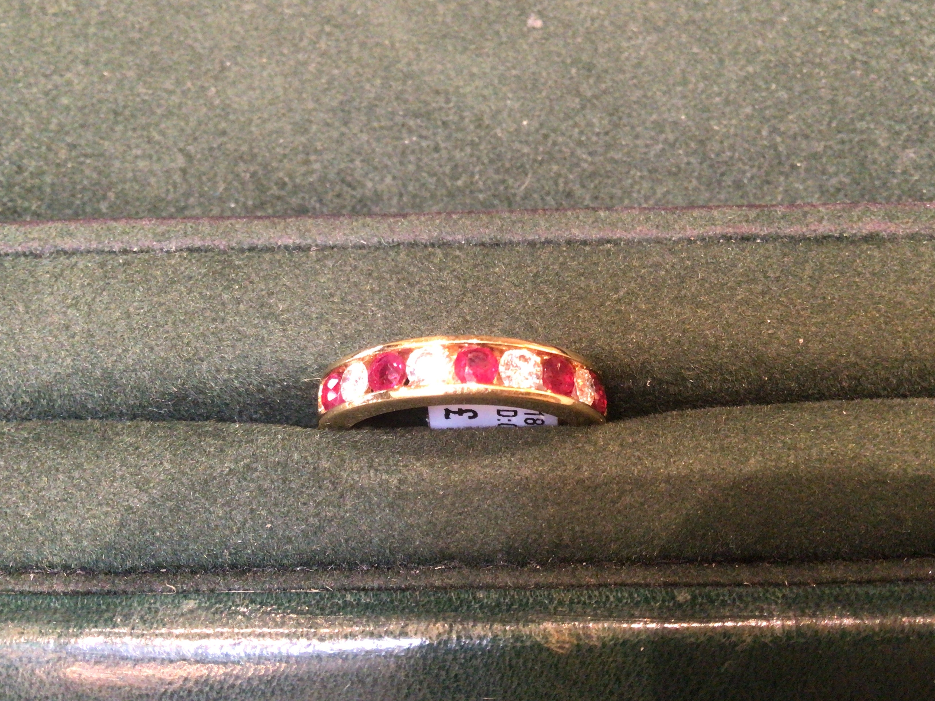 An 18ct yellow gold ruby and diamond eternity band featuring channel set stones.
