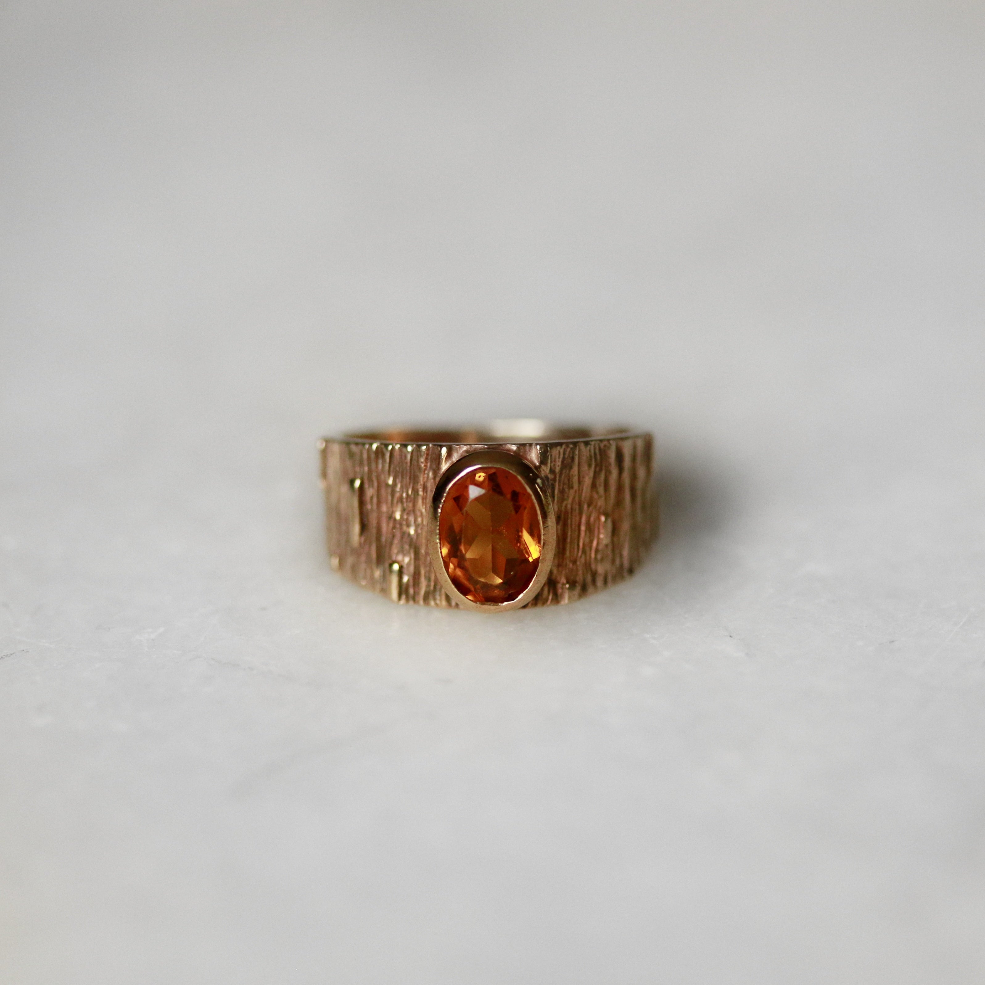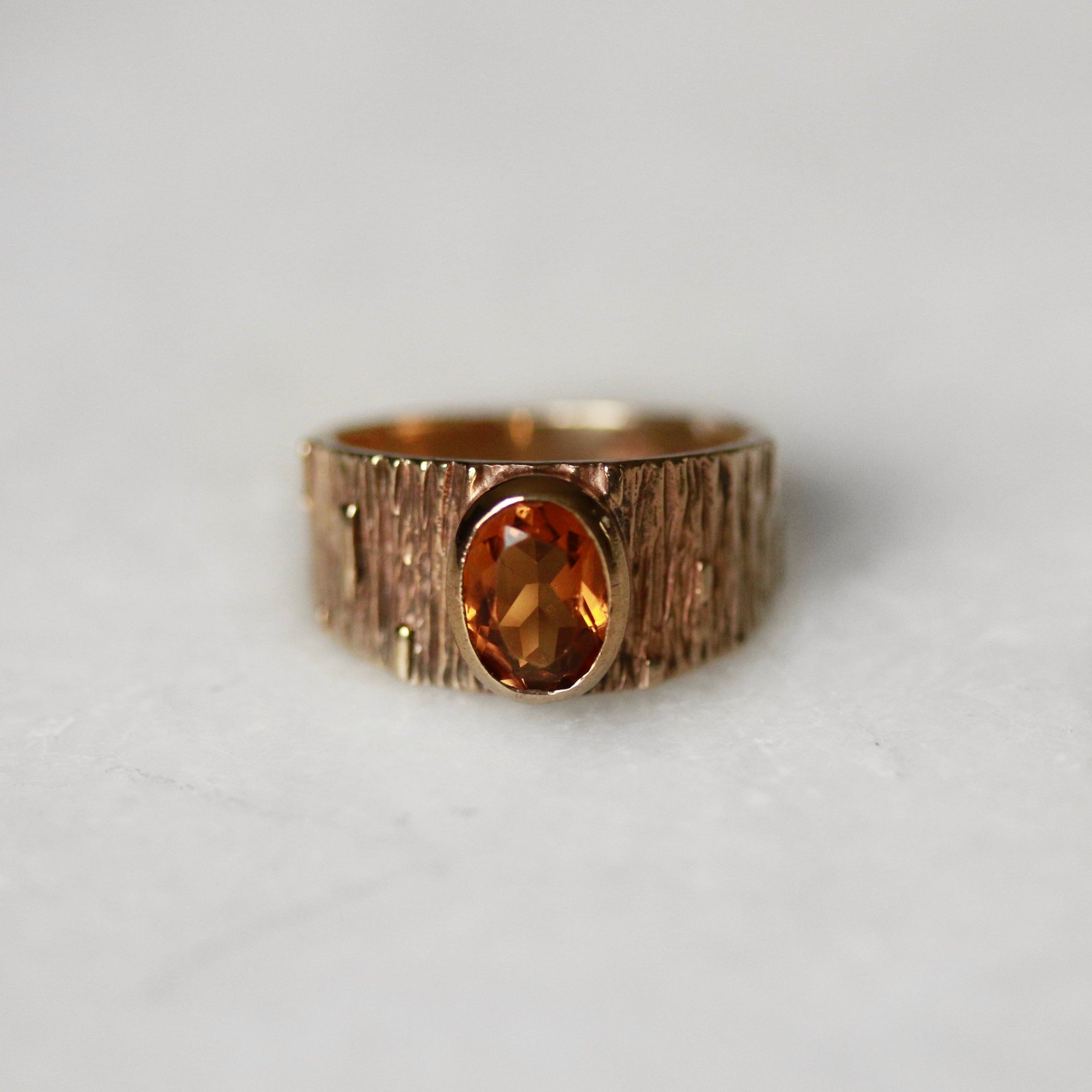 This vintage 9ct yellow gold dress ring showcases a striking oval-cut citrine set within a refined rim bezel, complemented by a distinctive bark-textured band. A genuine period piece from the 1970s, it combines the warm lustre of yellow gold with the rich golden hues of citrine—a pairing characteristic of that era's jewellery design. The textured finish adds tactile interest and authentic vintage character to this timeless dress ring.