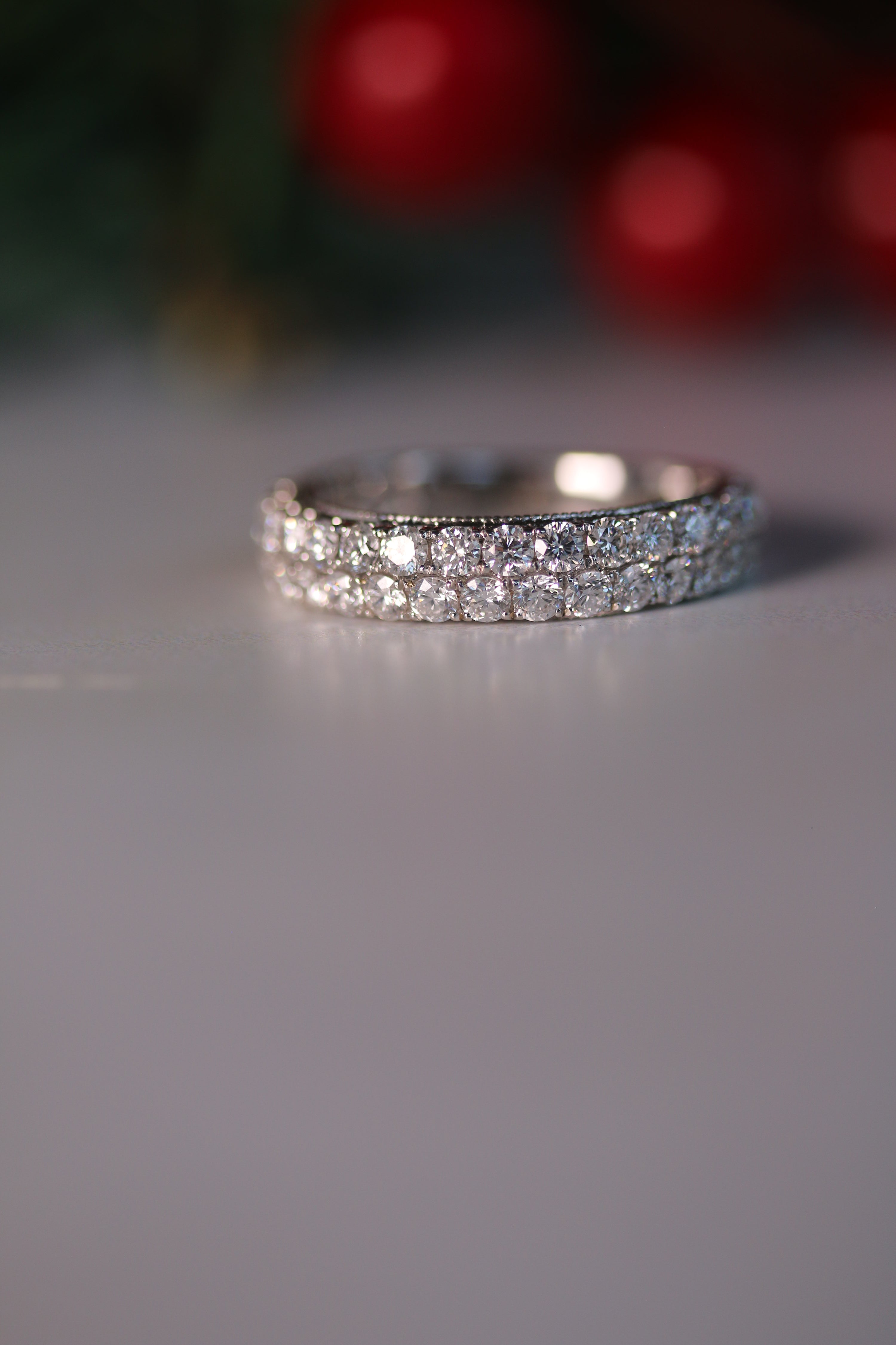 This 18ct white gold half eternity ring features a double row of diamonds totalling 1.34ct. It offers a beauty and sparkle, making it the perfect accessory for any occasion.